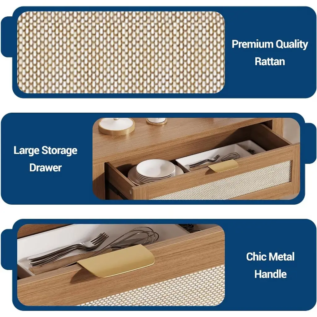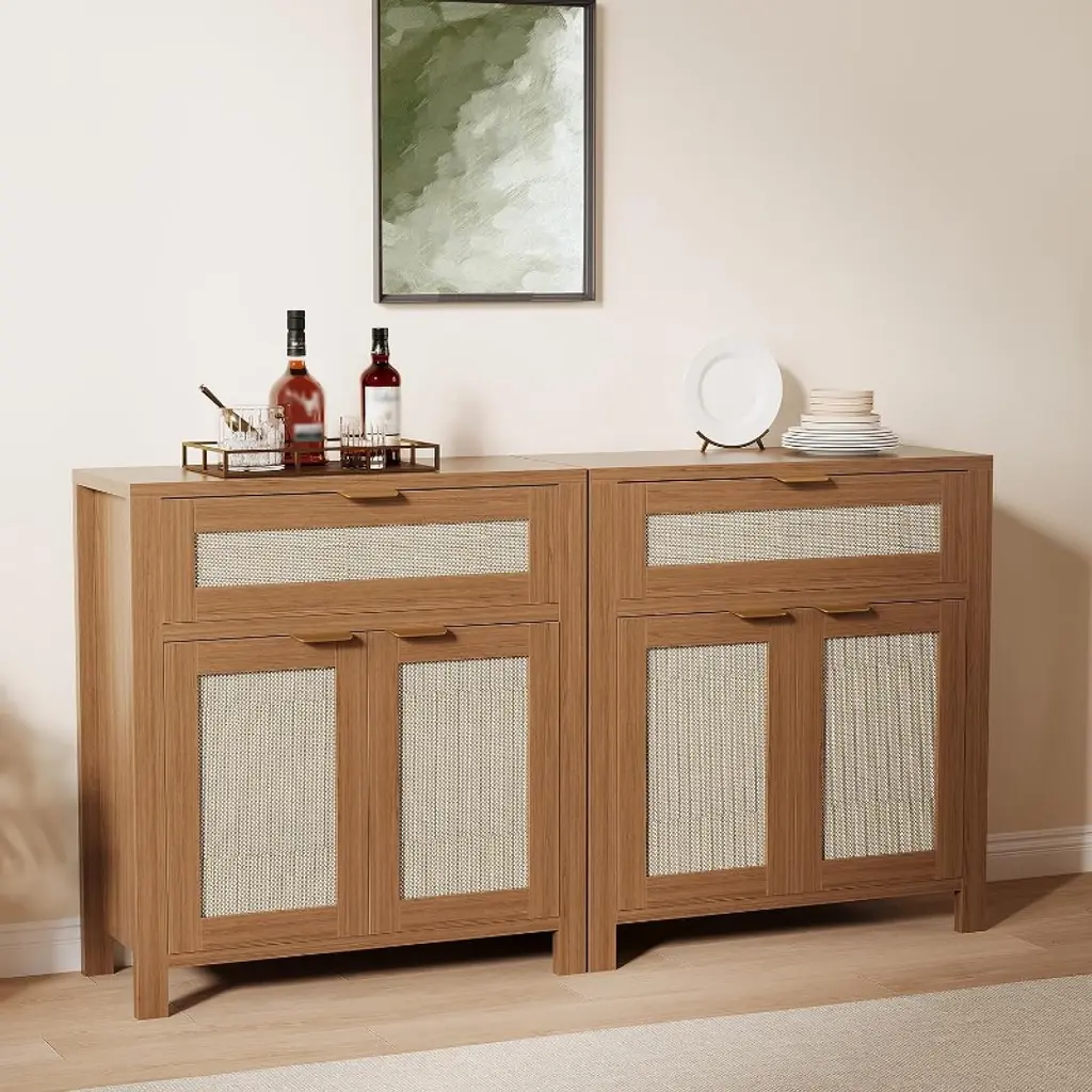Enhance your home organization with the COZONY Light Oak Rattan Sideboard Cabinet, designed to provide elegant storage solutions while adding natural texture to your decor. This versatile cabinet features beautiful rattan door details that create visual interest and allow for subtle display of stored items. The adjustable shelving system offers customizable storage configurations to accommodate various household essentials, from dinnerware to decorative objects. Crafted from quality engineered wood with reinforced construction, this piece ensures durability and stable performance. The combination of drawers and cabinet doors provides flexible organization options for different storage needs. Perfect for entryways, living rooms, dining areas, or as a coffee bar, this multifunctional furniture piece seamlessly blends style with practicality.