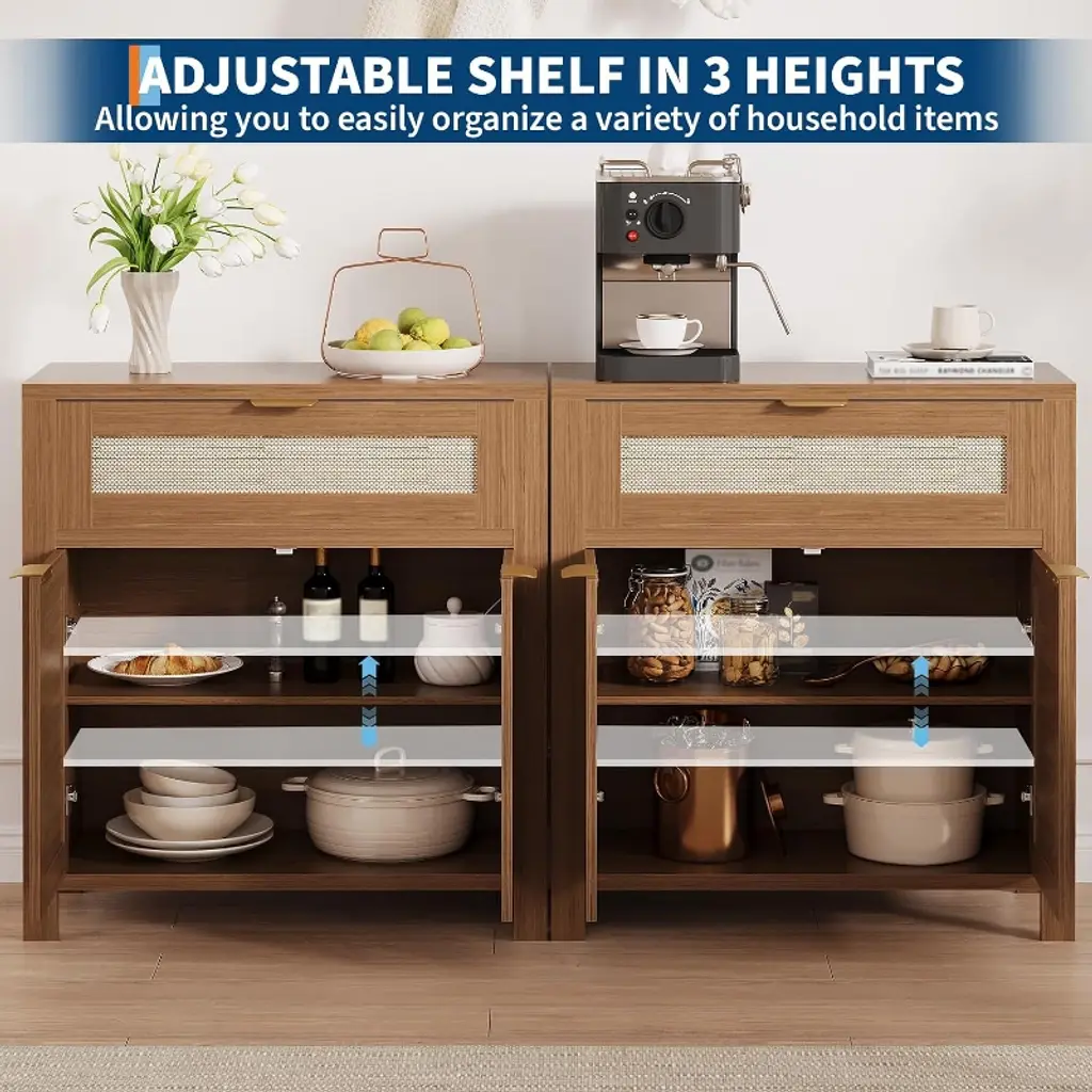 Cozony Dark Oak Rattan Sideboard Cabinet, Narrow Storage Credenza With Adjustable Shelves 3 Pcs With 3 Boxs Shipping
