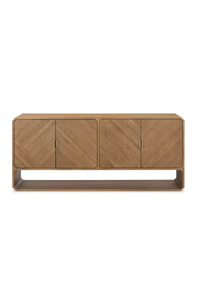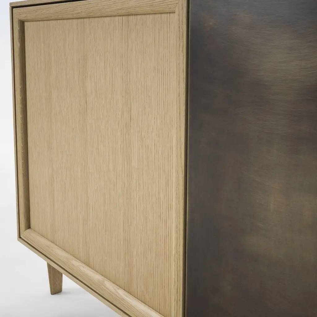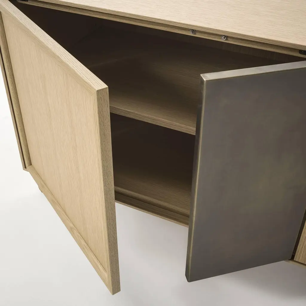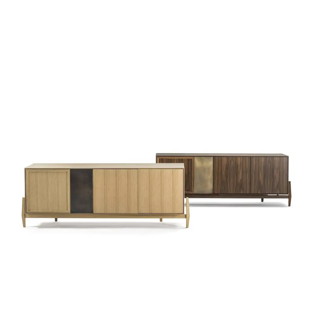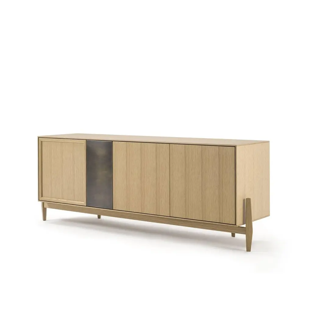 This stunning sideboard is part of the new Crab collection, introduced at the Salone del Mobile event of 2018 Milan Design Week. Entirely crafted of durmast wood, this sideboard is defined by a unique load-bearing structure with four pincer elements (hence the name of the collection) on the sides that can be rotated to increase the height of the unit (from 73 to 82 cm). The storage space is hidden behind four soft-closing doors, the smallest featuring a darker, polished finish. Rustic in inspiration and modern in details, this piece creates a grand presence in any modern living dining room decor.