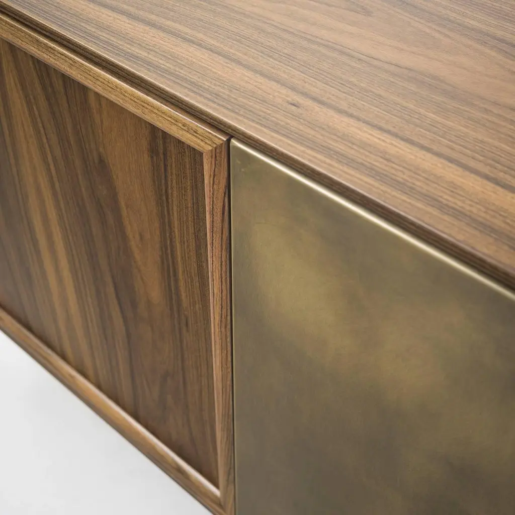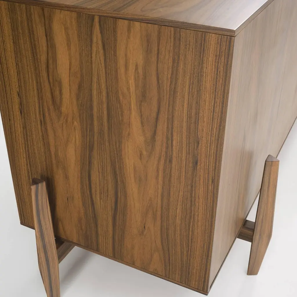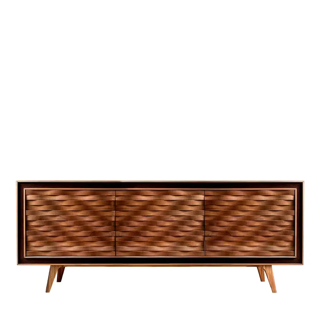A refined sideboard with a classic silhouette and a visually striking presence, this meticulously crafted piece from the new Crab collection was introduced at Salone del Mobile during 2018 Milan Design Week. This sideboard is characterized by a unique base composed of four elements that grasp the sides of the unit and can rotate to increase its height from 73 to 82 cm, adapting it to any interior needs. Crafted of rosewood with natural finish, the rectangular frame has four doors, one of which finished in lighter color. The interior offers generous space for effective, organized storage in any room.