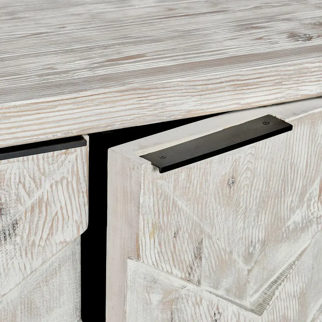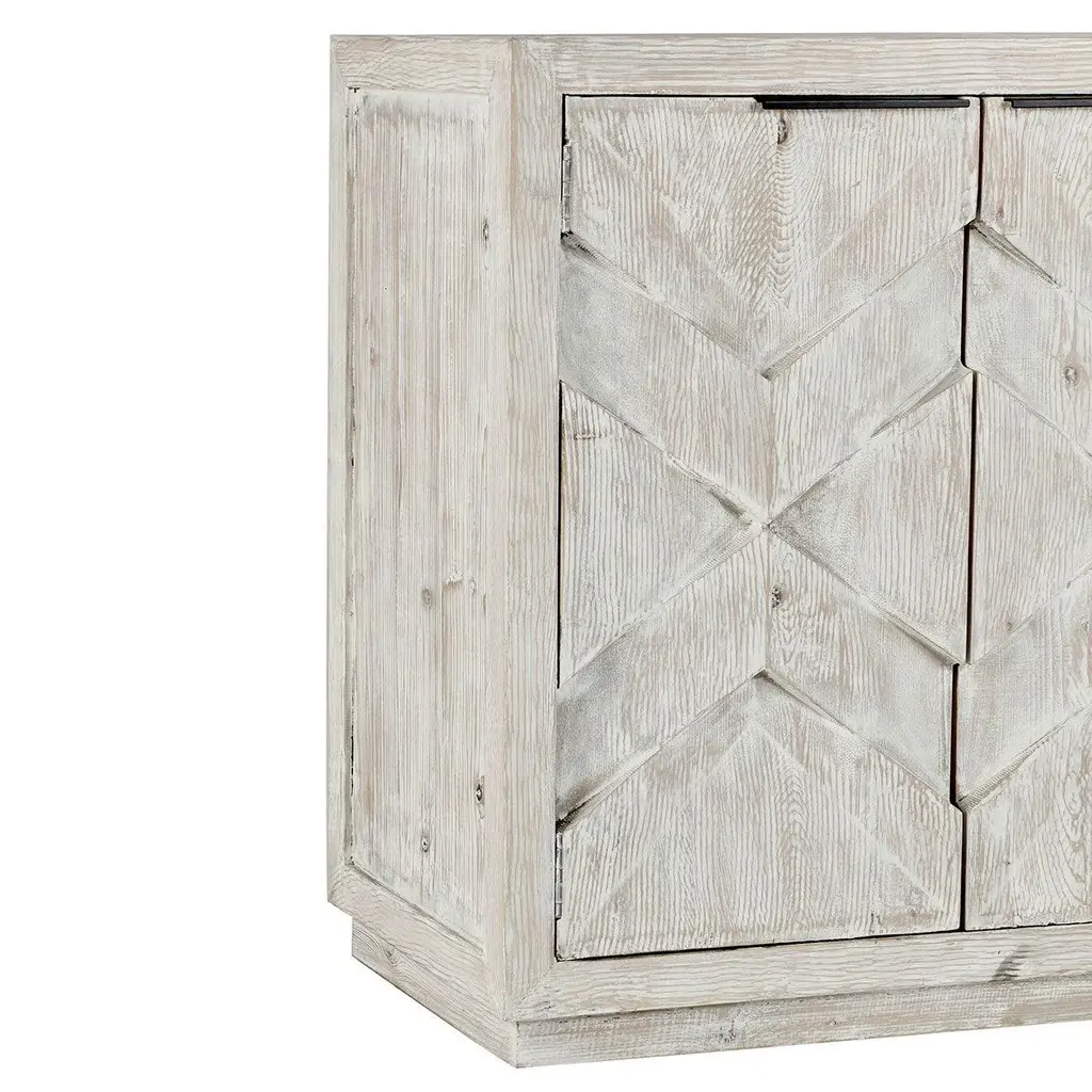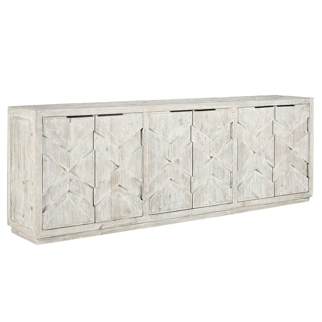 Large solid salvaged pine wood crafted sideboard / buffet with light cream washed distressed finish. Braided carved zig-zag/diamond design on six doors. Hole cutouts in back for cord management if needed. Each cabinet may have variations in exact coloring/finish, wood grain, and inherent imperfections. Weighs approx. 330 lbs.