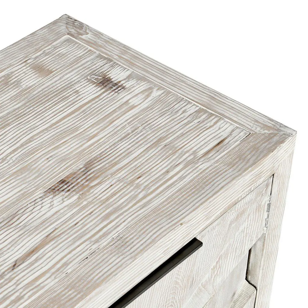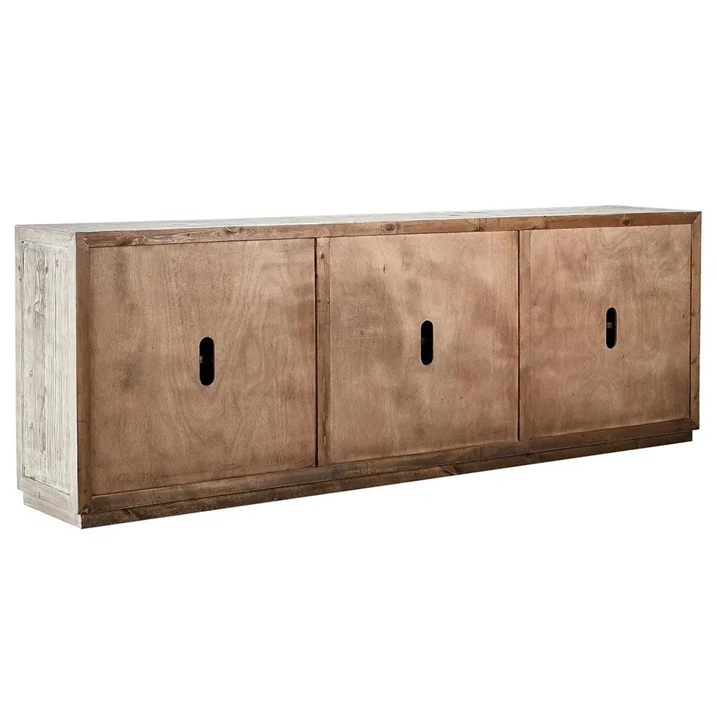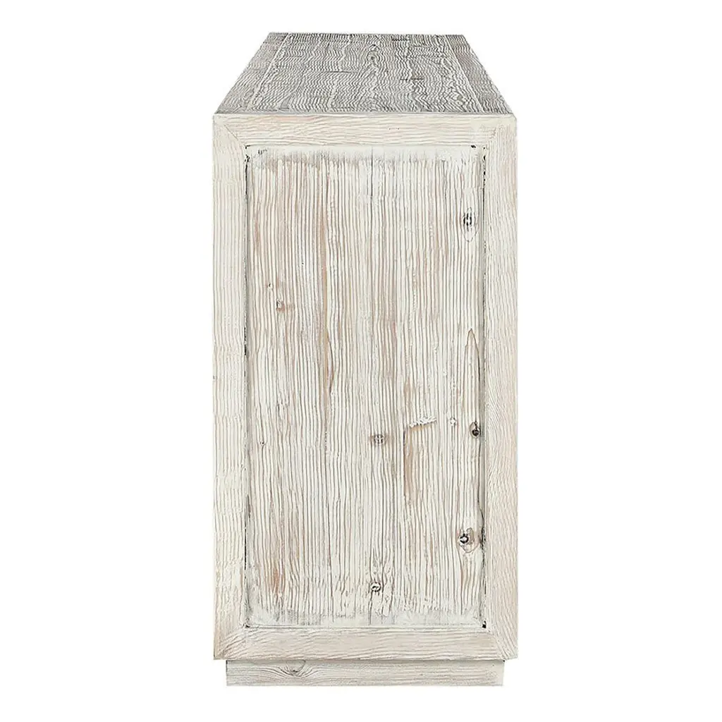 Large solid salvaged pine wood crafted sideboard / buffet with light cream washed distressed finish. Braided carved zig-zag/diamond design on six doors. Hole cutouts in back for cord management if needed. Each cabinet may have variations in exact coloring/finish, wood grain, and inherent imperfections. Weighs approx. 330 lbs.