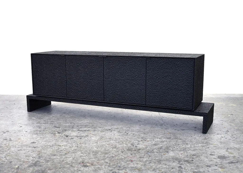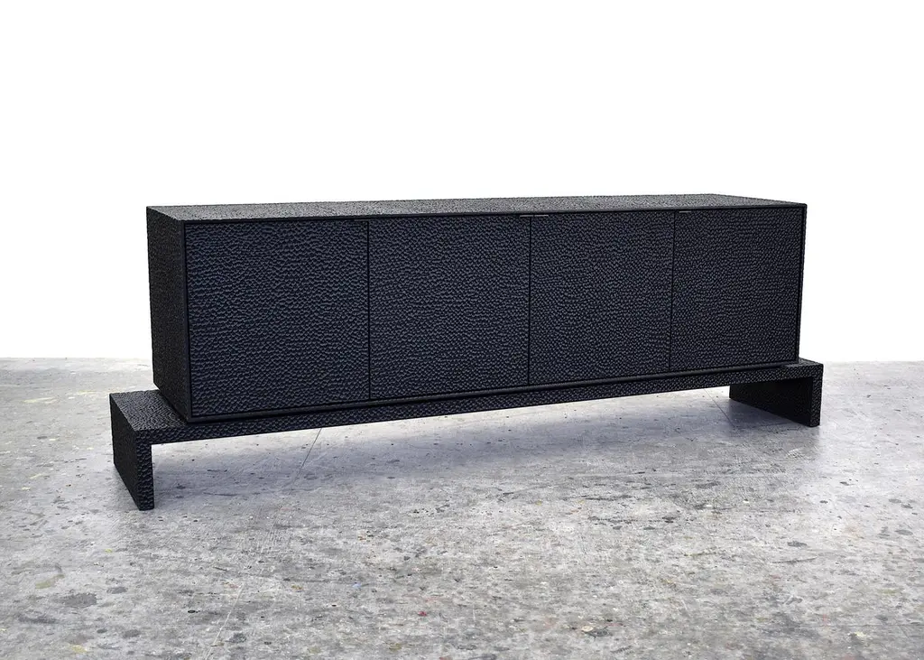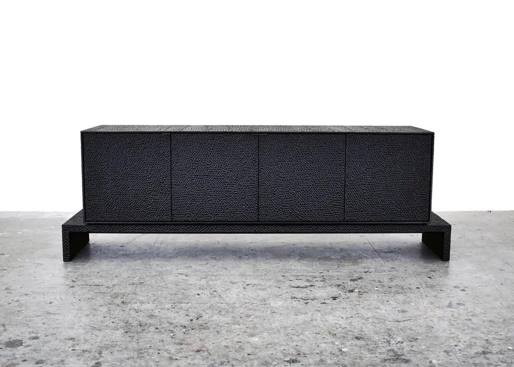 M1 Credenza sculpted by John Eric ByersDimensions: 66 x 195.6 x 45.7 cmMaterials: Carved blackened maple, brassAll works are individually handmade to order.John Eric Byers creates geometrically inspired pieces that are minimal, emotional, and modernly refined.John's individually handmade work is guided by purity in form, surface texture, structure, and respect for use of materials. Heralded as a leading American artist working in wood, permanent collections include the Smithsonian American Art Museum, the Philadelphia Museum of Art and the Museum of Arts and Design in NYC. Numerous awards include a Louis Comfort Tiffany Foundation Award, New York Foundation of the Arts Awards, and inclusion in the Smithsonian's Oral Archives of American Arts.