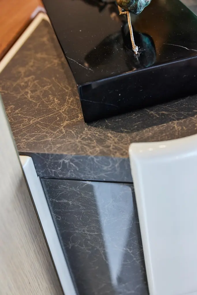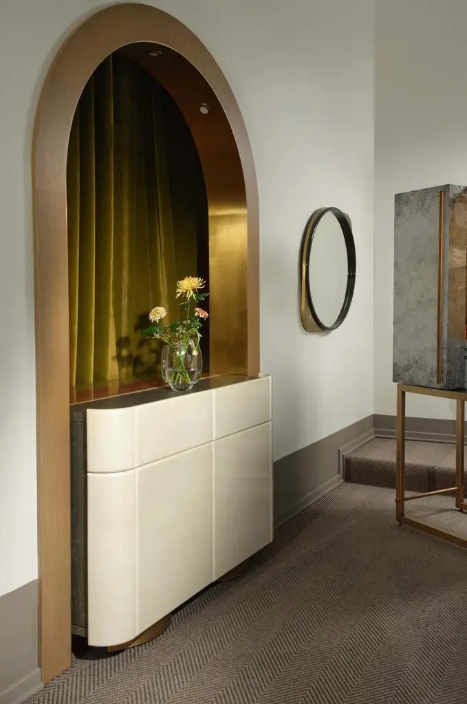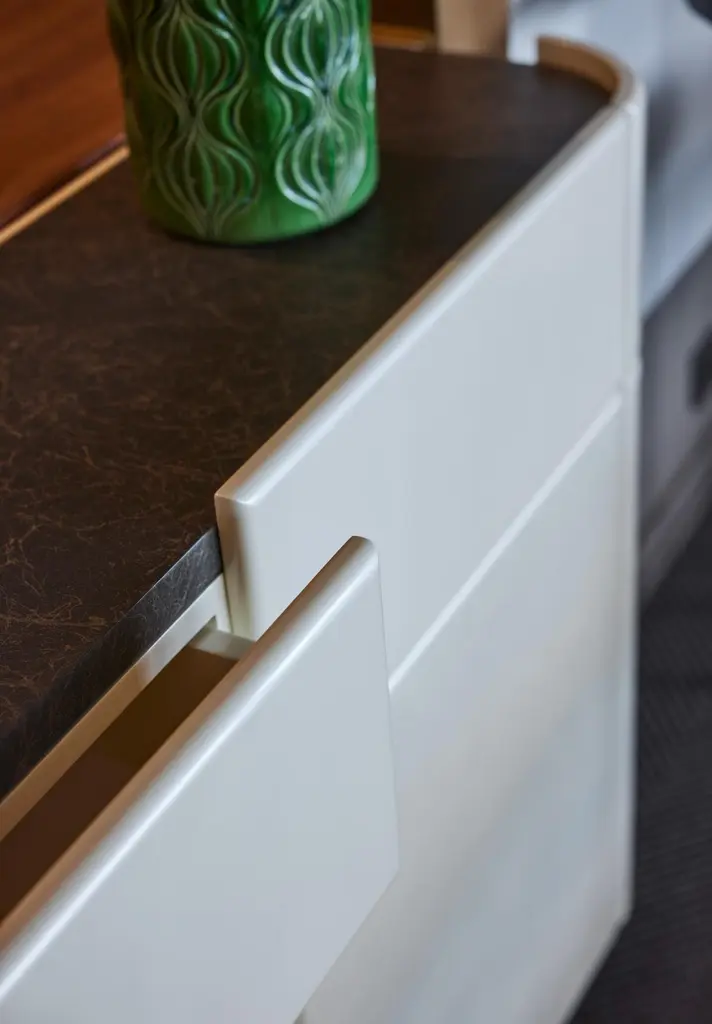 Pearl-colored and lacquered finish ‘Dekolte’, is a simple yet elegant product that responds to your needs in your living spaces. Side surface of Dekolte, reveals its beauty with the glossy patterned finish like a radiant skin luring you in from a decolette of an elegantly designed dress. The same pattern’s matte version is also used on top of the sideboard. The drawers do not end flush with the body and can be pulled out. Material & Finish Body: Shiny pearl lacquer or oak veneerTop: Patterned matte lacquerSides: Shiny patterned lacquer Base: Antique plated metal