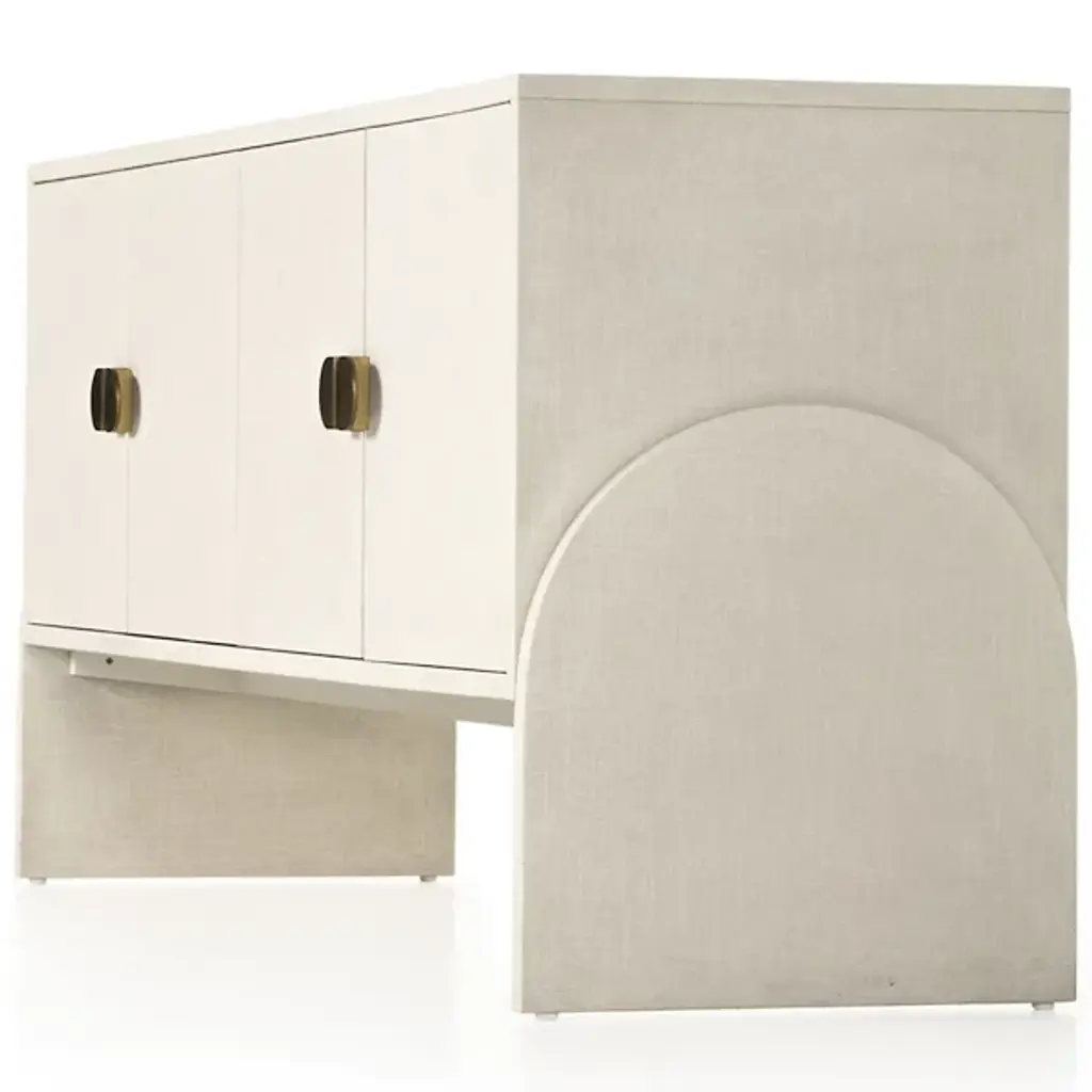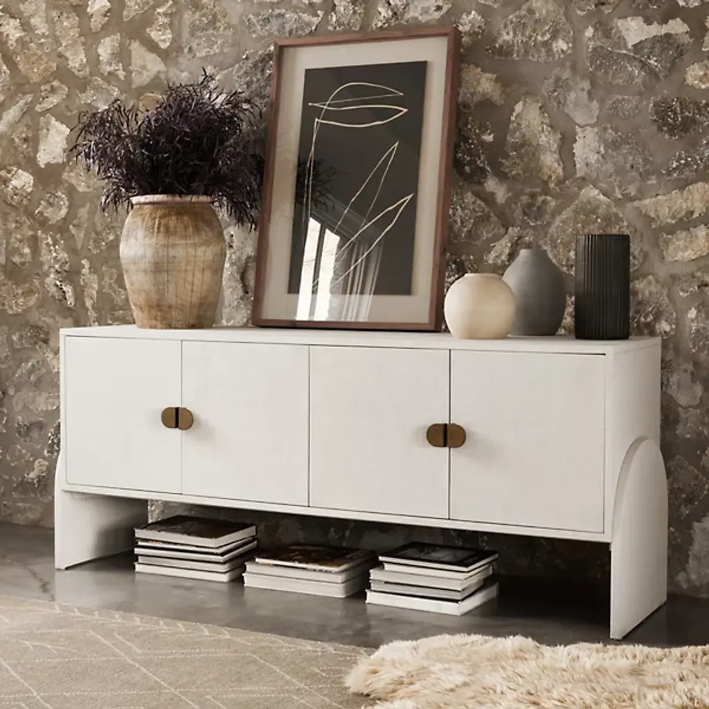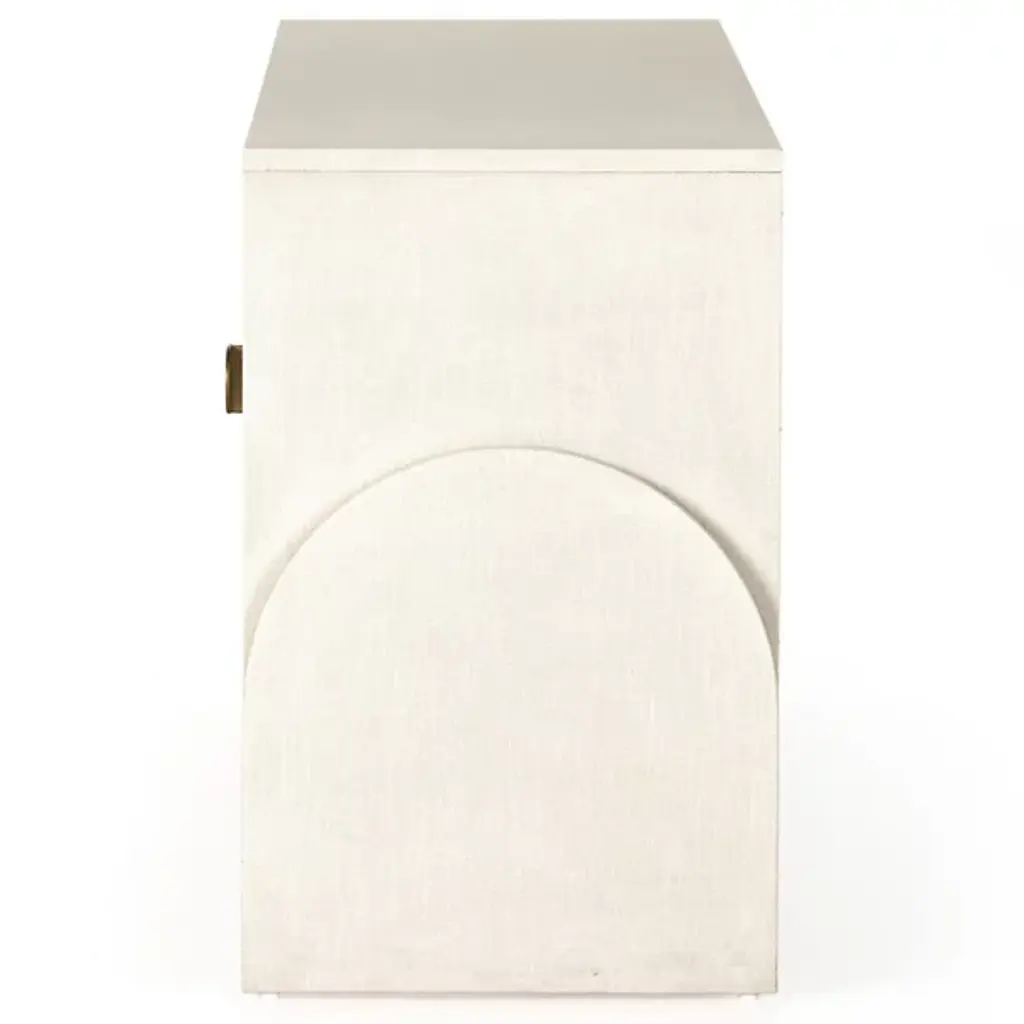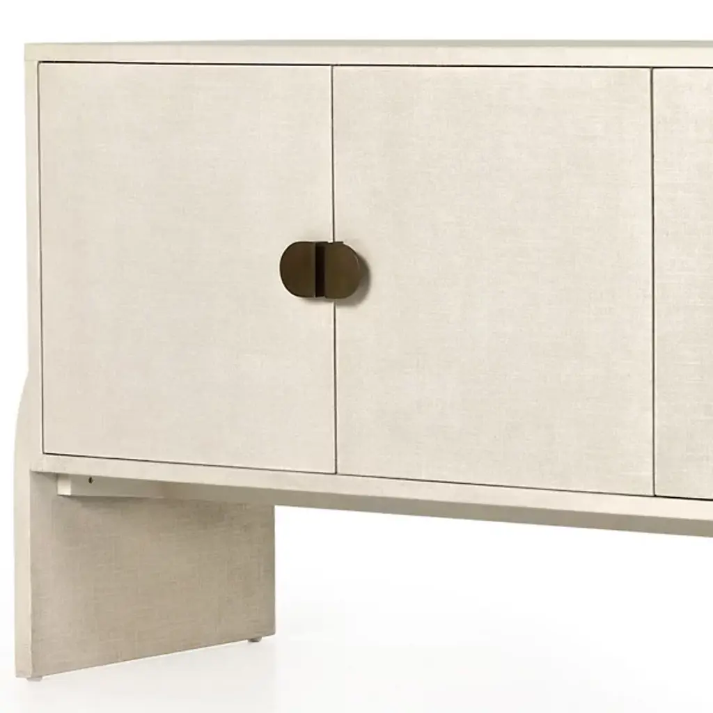 Add novel appeal to living spaces with the Cressida Sideboard from Four Hands. A striking blend of novelty and modern design, it is sheathed in painted linen, its sleek, contemporary form is softened by elegant arched legs, creating a unique visual appeal. Antique-textured half-moon iron hardware adds welcome sophistication, while dual rear cutouts offer practical cord management, and two removable and adjustable shelves rest behind soft-close doors. The sideboard combines style and functionality, making it a versatile addition to any Mid-Century Modern or contemporary space.