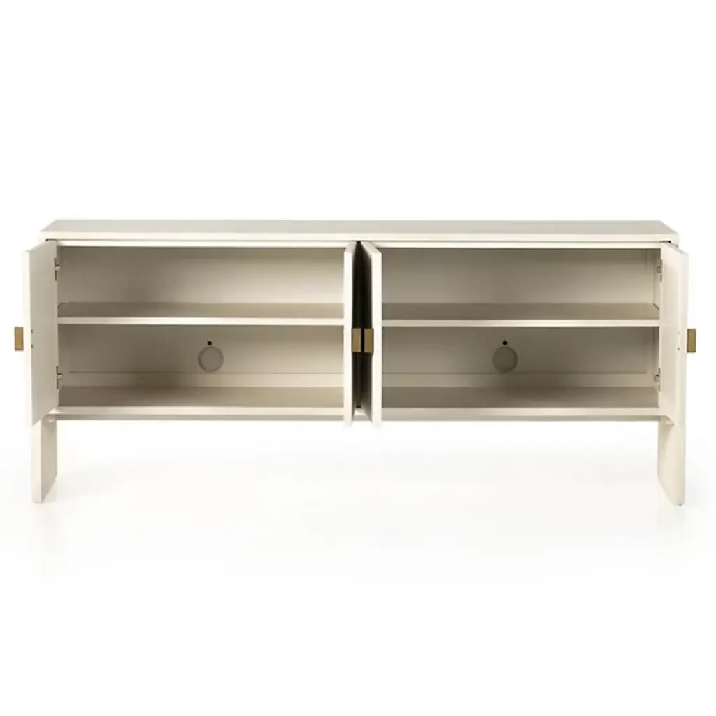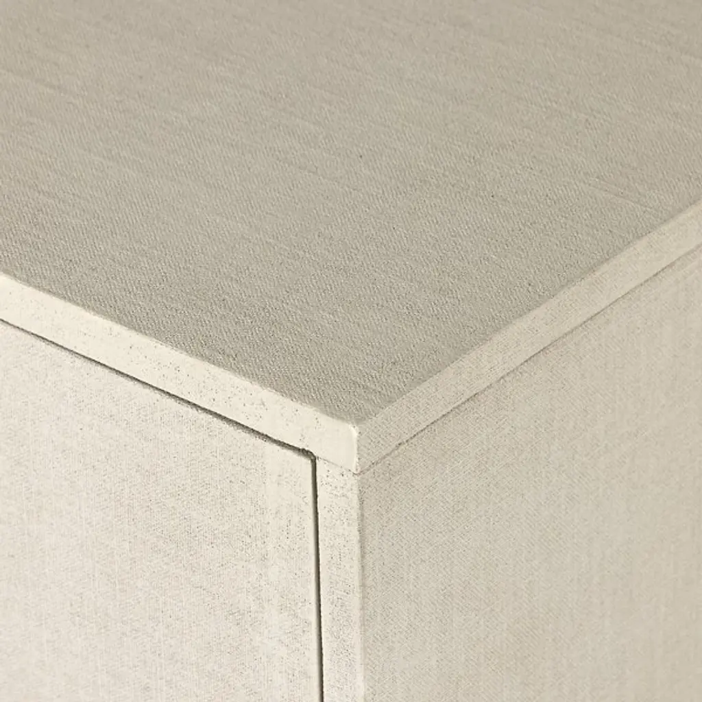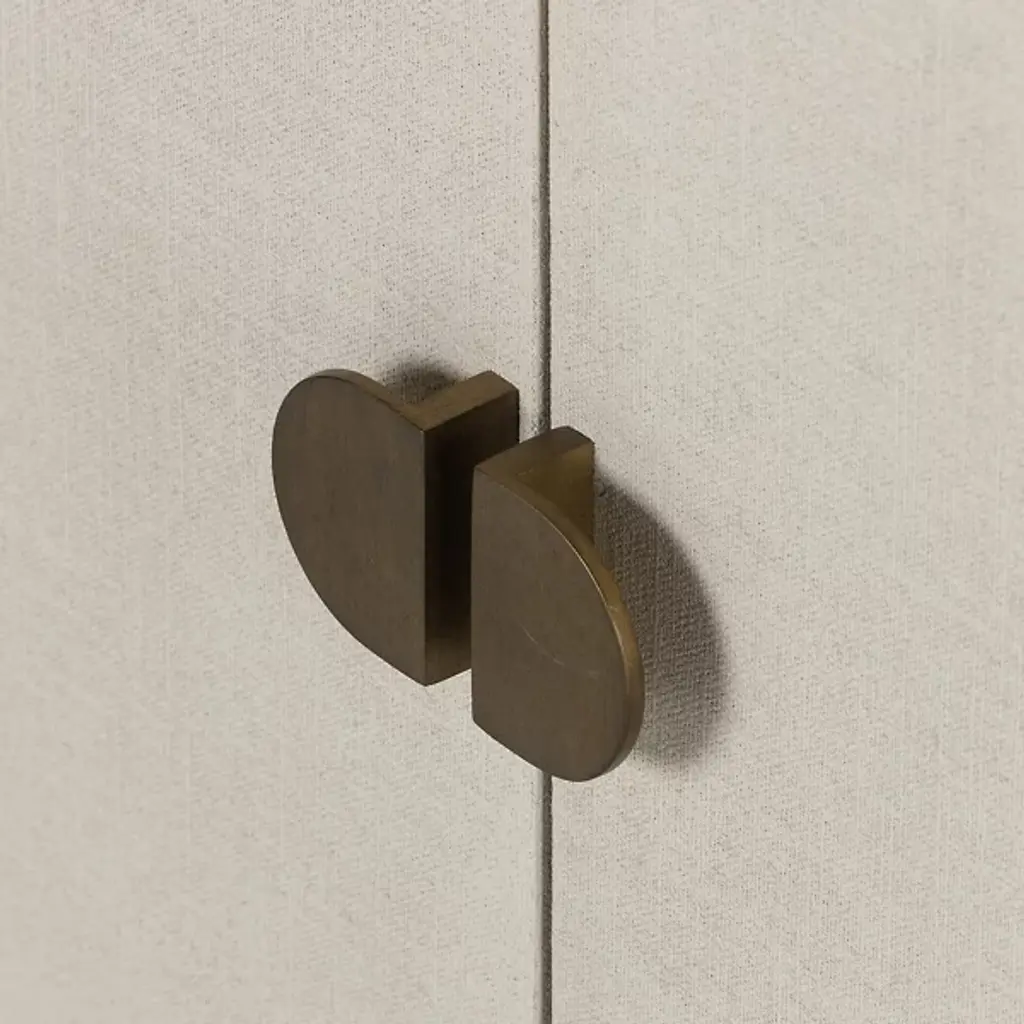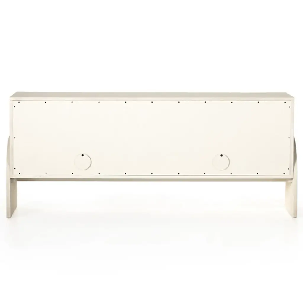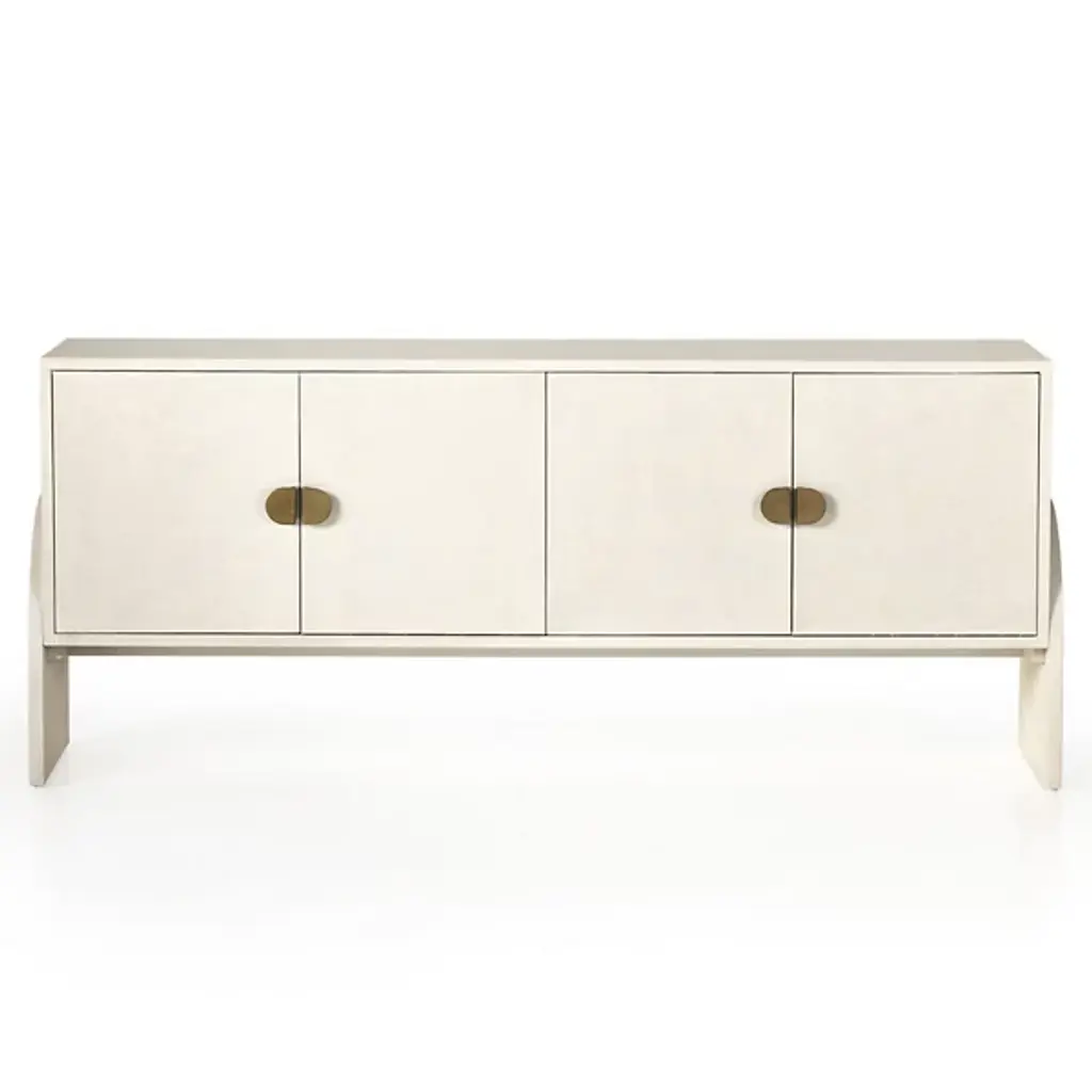 Add novel appeal to living spaces with the Cressida Sideboard from Four Hands. A striking blend of novelty and modern design, it is sheathed in painted linen, its sleek, contemporary form is softened by elegant arched legs, creating a unique visual appeal. Antique-textured half-moon iron hardware adds welcome sophistication, while dual rear cutouts offer practical cord management, and two removable and adjustable shelves rest behind soft-close doors. The sideboard combines style and functionality, making it a versatile addition to any Mid-Century Modern or contemporary space.