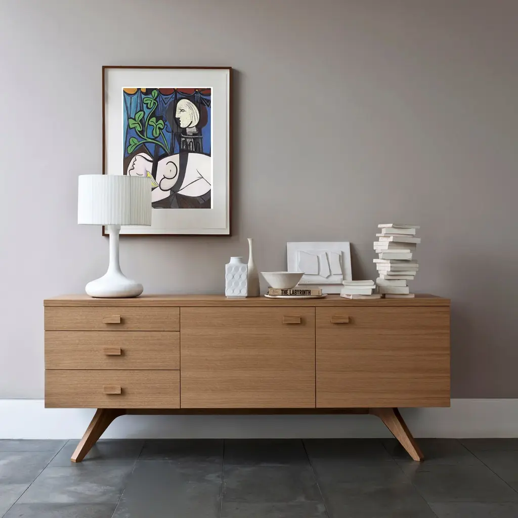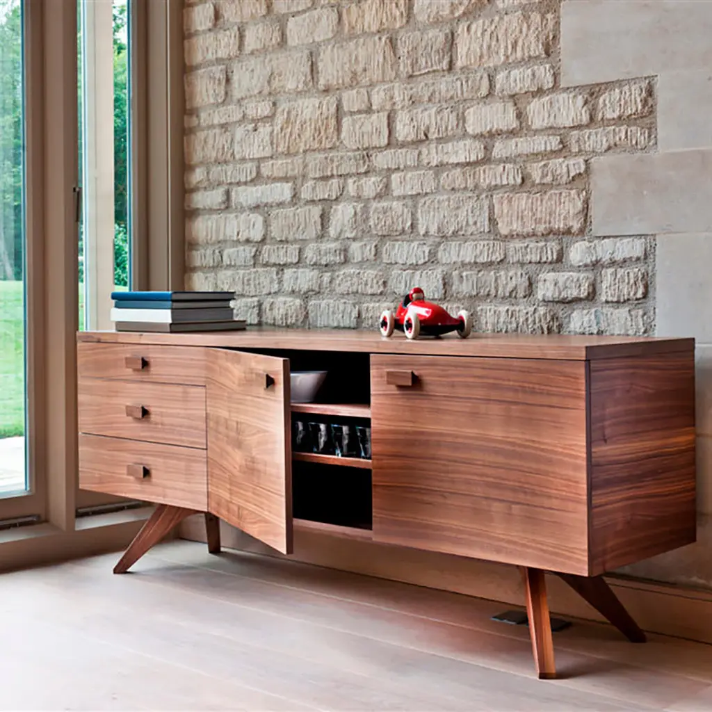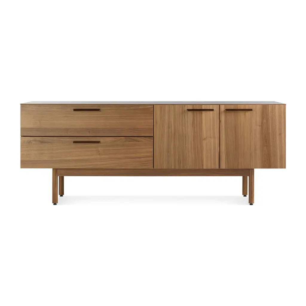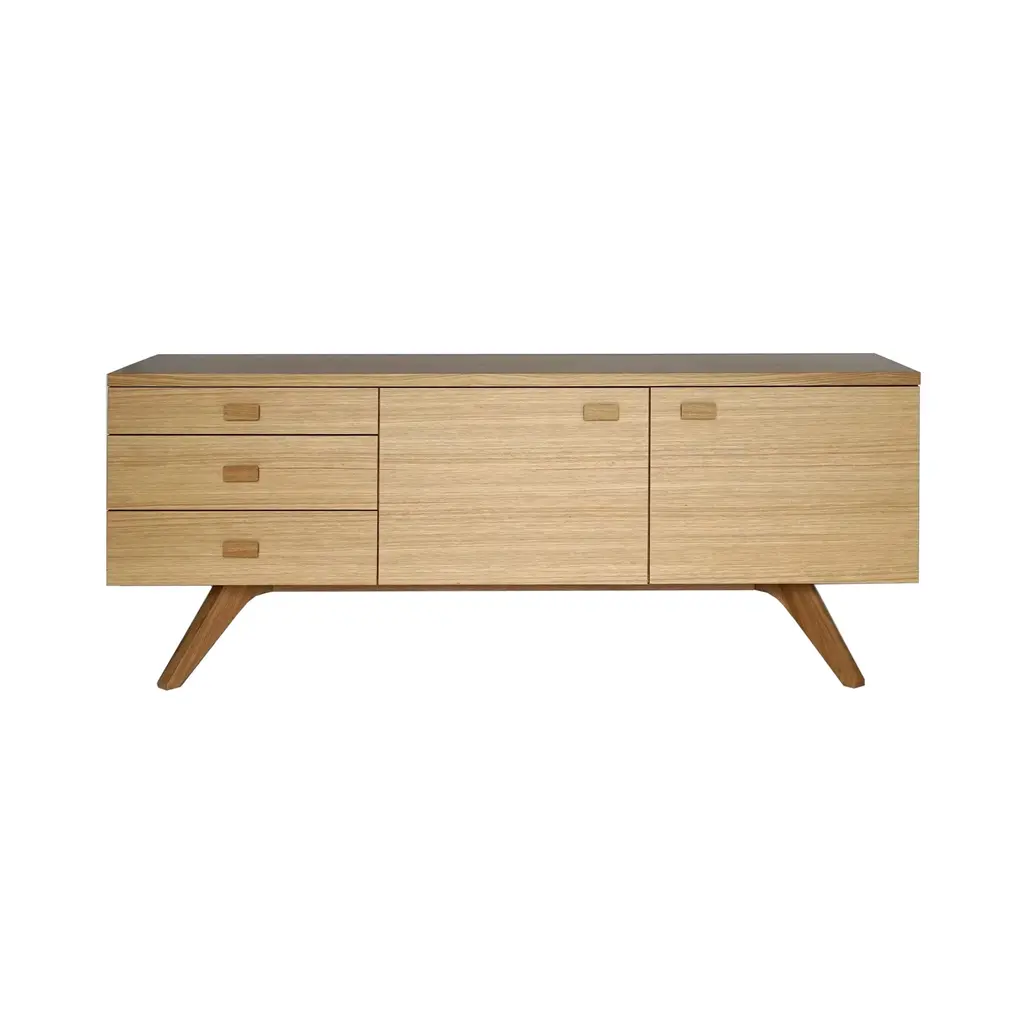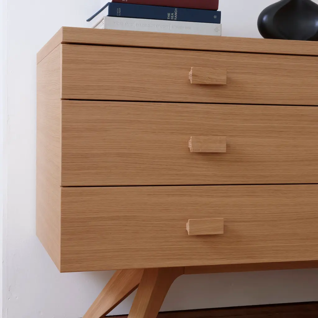 Brit designer Matthew Hilton favors clean modern lines and soul-warming woods that endure over time, like his beautifully crafted Cross Sideboard. With a distinctively angled solid oak or walnut base and veneered cabinetry, it features 3 drawers to the left and 2 doors on the right, with the slimmer top drawer ideal for storing cutlery.