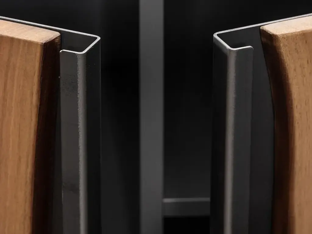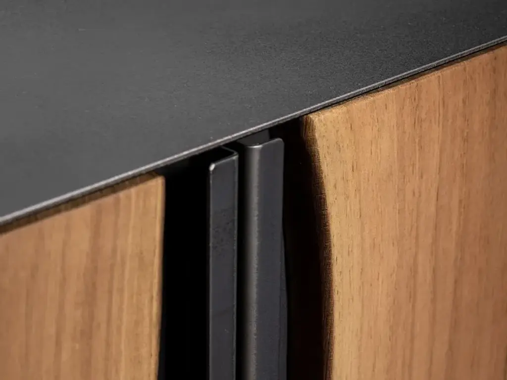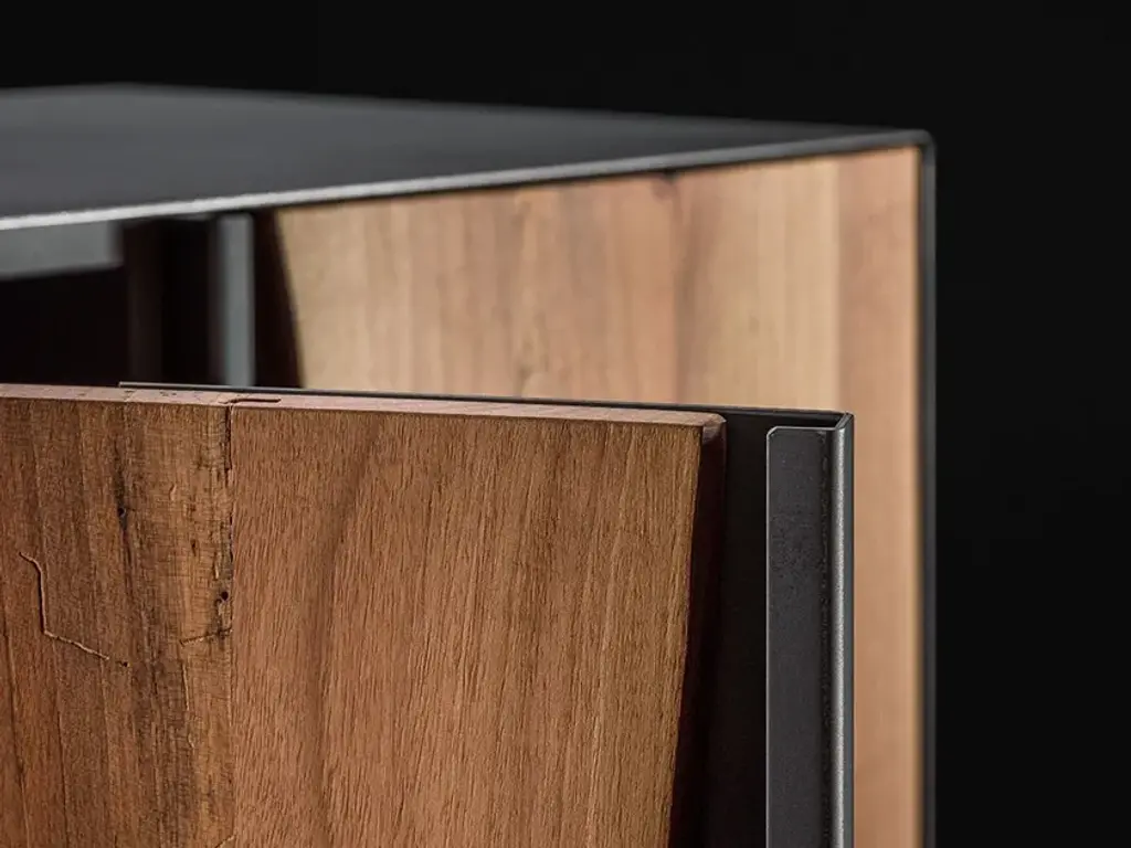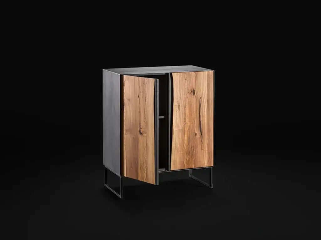 A practical cabinet like the sideboard is remade in a compact form in solid walnut and iron. The contrasts between the two materials enhance their merits: wood appears more vital and warm near the metal panels. The reddish-brown tones of the walnut are marked by evident veins that enrich the visual impact and enliven the surface.Each creation by Bruno Spreafico is unique and made to measure, offering a wide selection of essences, supports, processing, colors, materials, dimensions, and other features.The model shown in the photo refers only to the essence indicated in the product name.