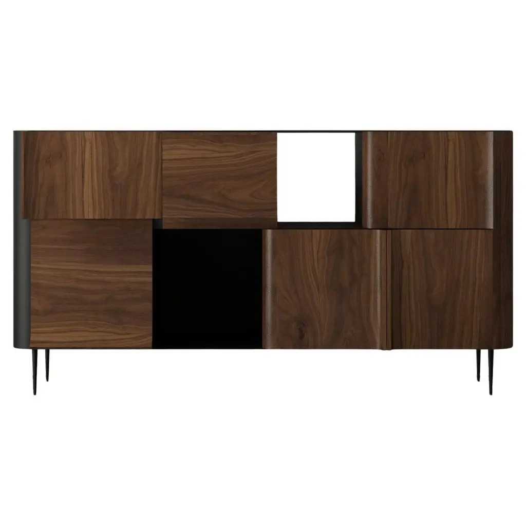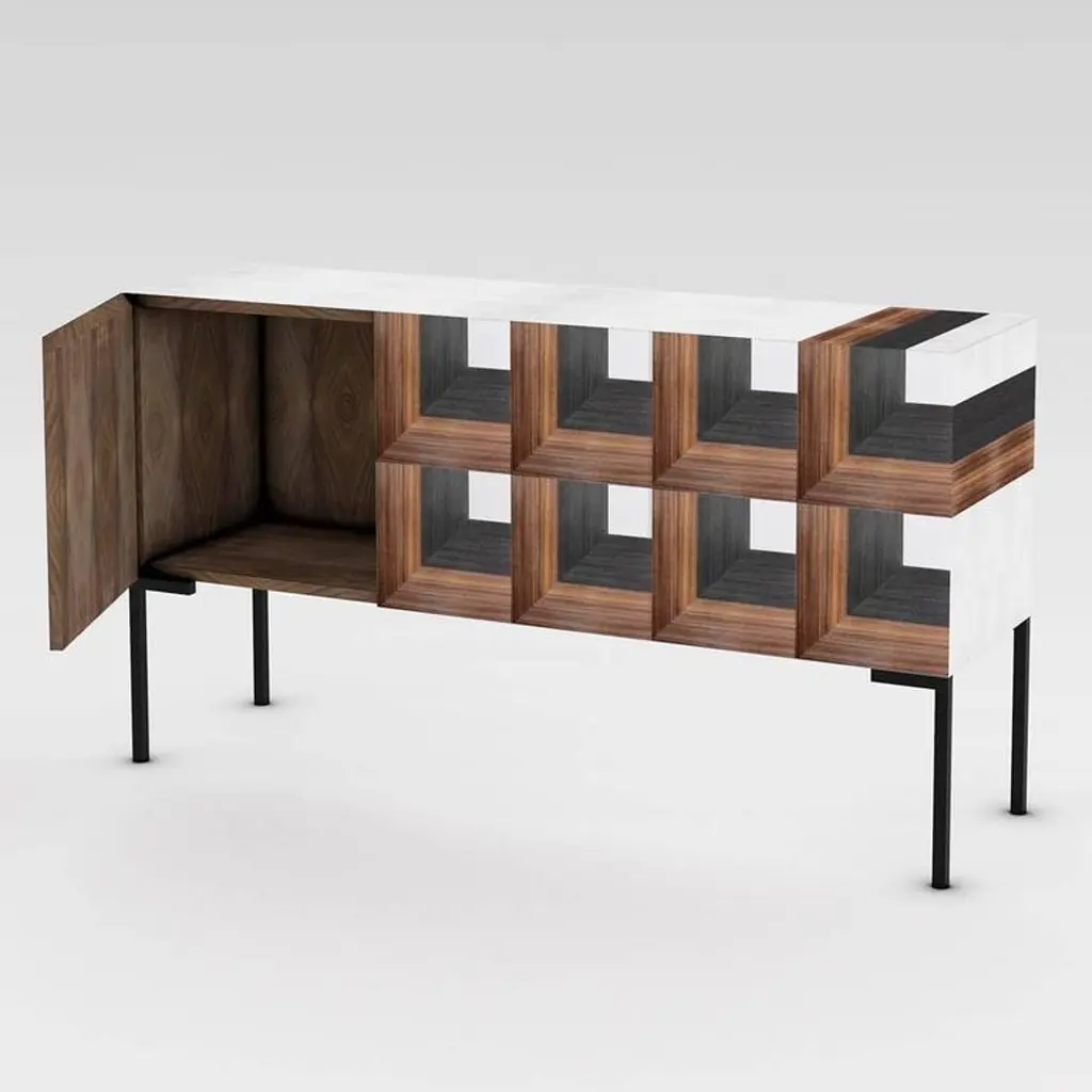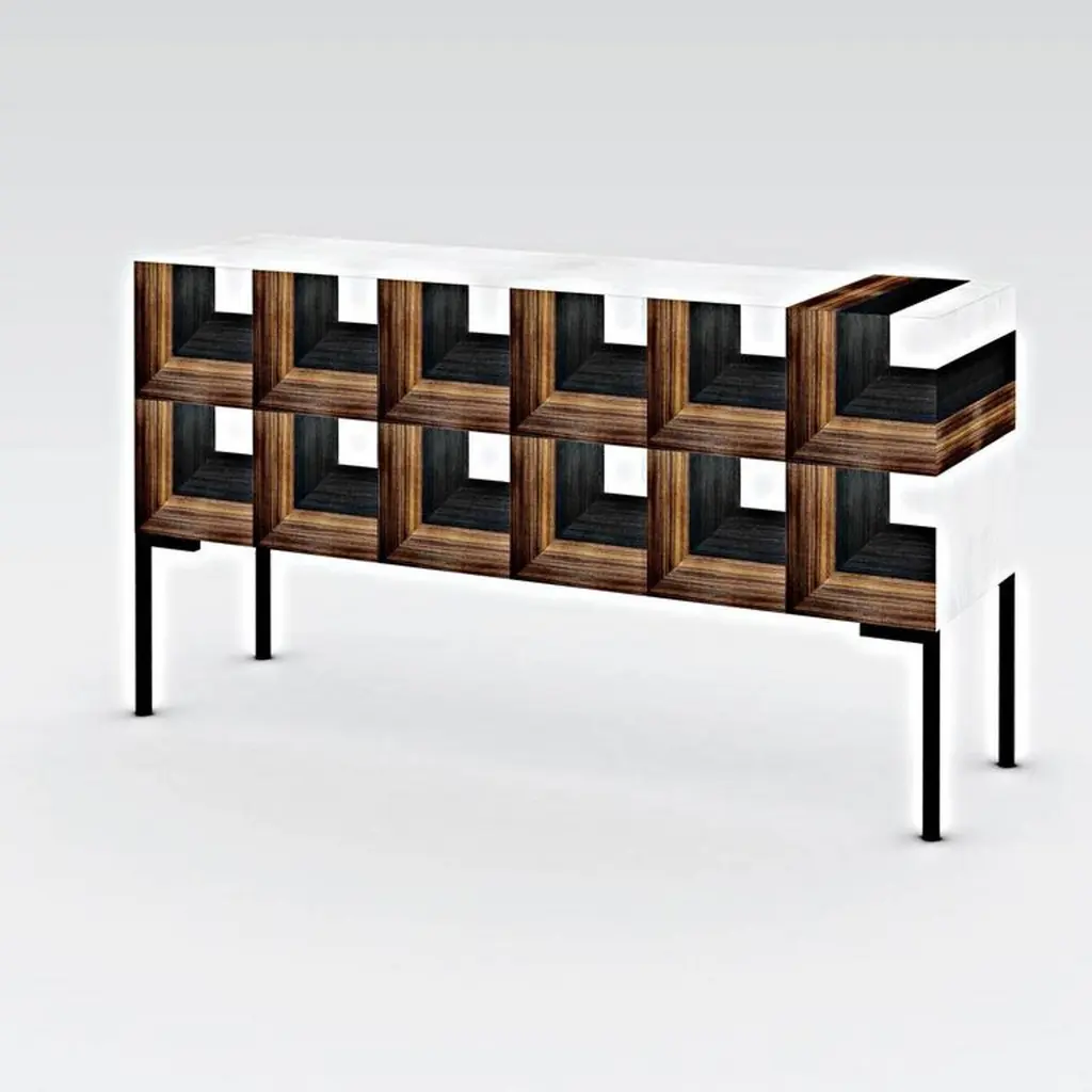 Expert wood masters crafted this piece that features an exquisite wood decoration recreating a three-dimensional optical illusion. The woods used are ebony, violet bois wood, and whitened ashwood while the interior of the piece is in precious Santos rosewood. The elongated brushed iron legs with a black opaque finish complete this striking object that brings timeless glamour to any space.