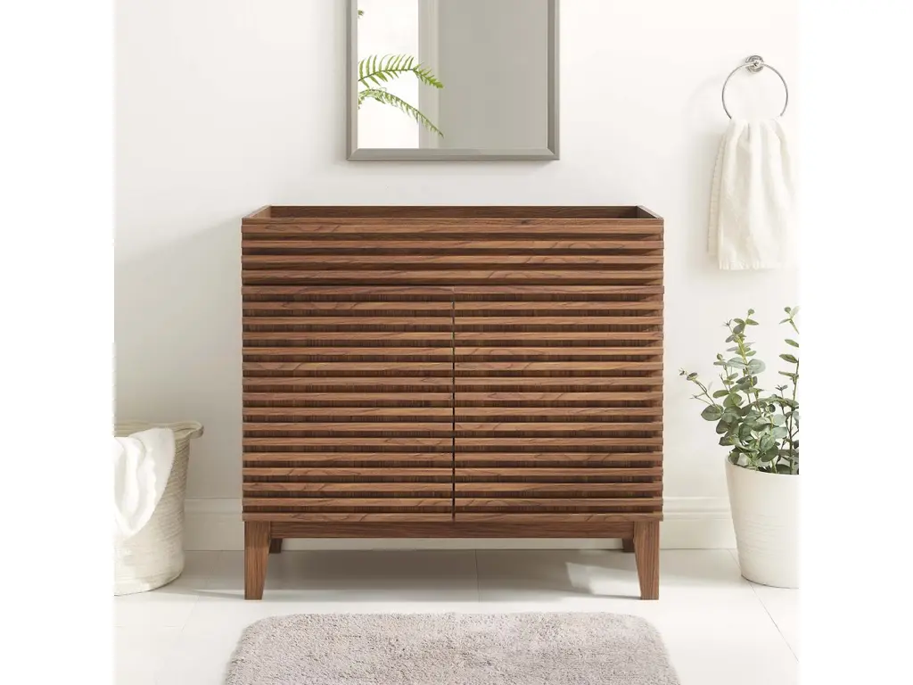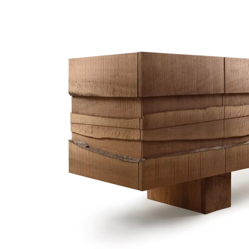 A superb showcase of skillful craftsmanship, this striking sideboard is a singular work of functional art exquisitely designed by Marc Sadler. Handcrafted of prized national walnut wood with a natural finish, the five doors of this piece are charmingly marked by two horizontal saw cuts showcasing a darker natural hue of the wood, and adding a dynamic textural value to this design masterpiece.