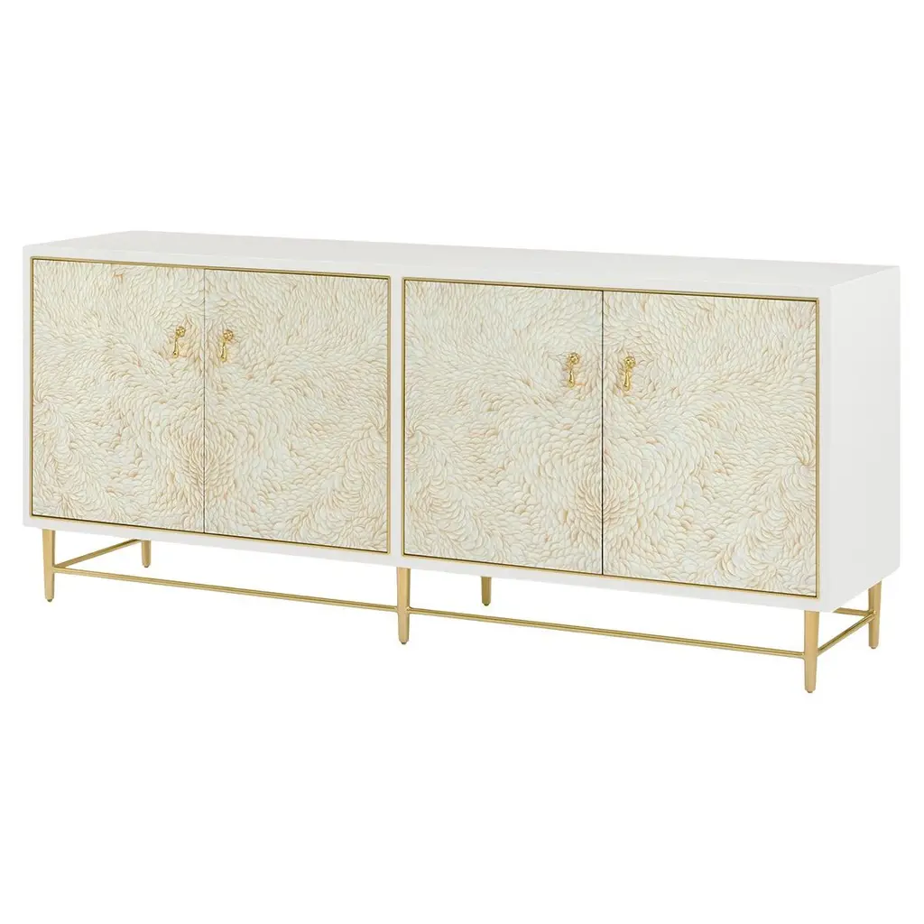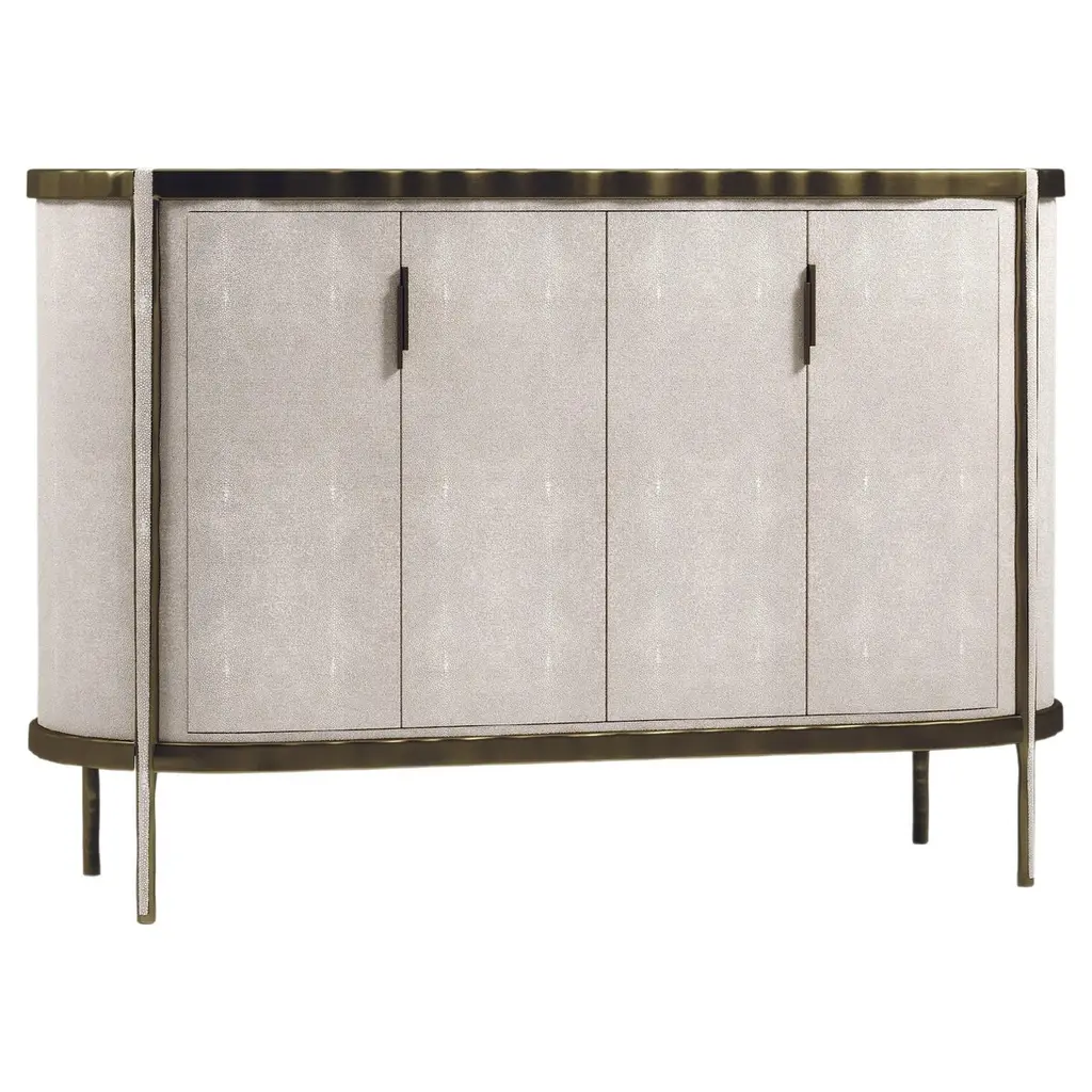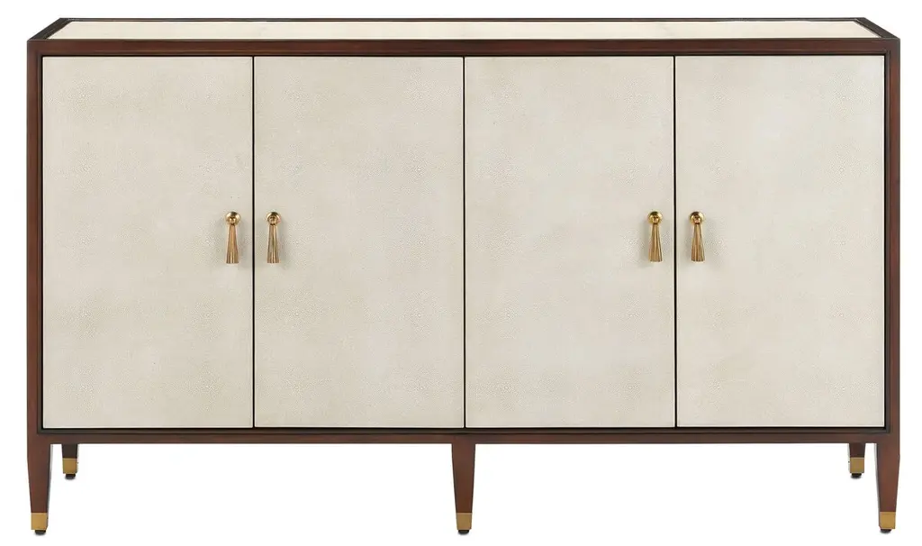 We have a number of offerings in shagreen designed by our director of furniture Aimee Kurzner, who was inspired by vintage shagreen furniture from the 1920s when she designed the pieces. The Evie Shagreen Credenza is made of mahogany in dark walnut finish framing the panels and drawers that are covered in ivory faux shagreen with brass door pulls.. Design attributes include soft close door hinges, adjustable glides and an anti-tip kit. We also offer the Evie as a chest and a mirror.