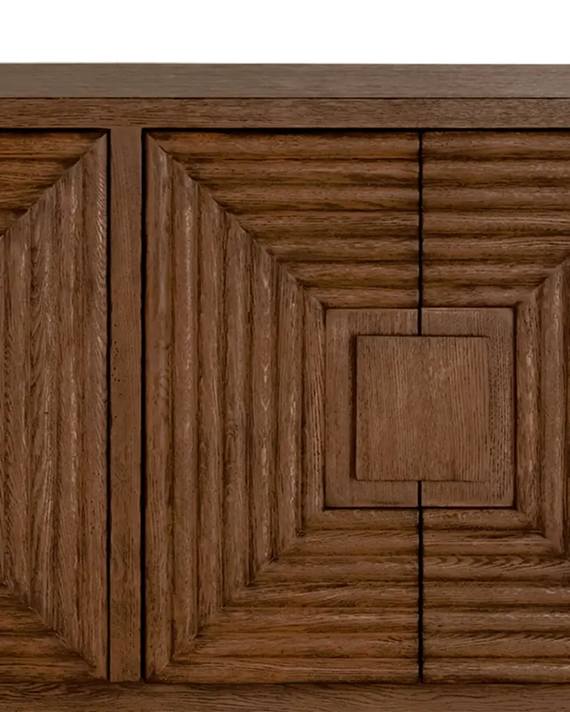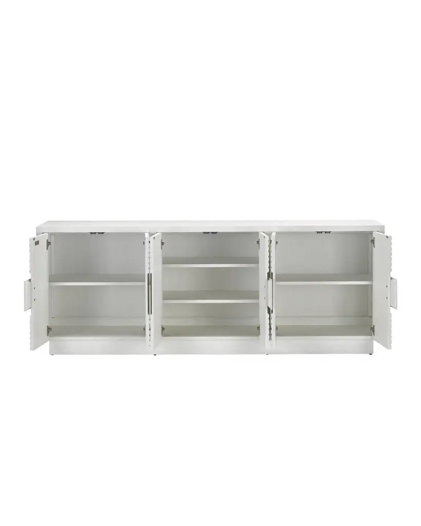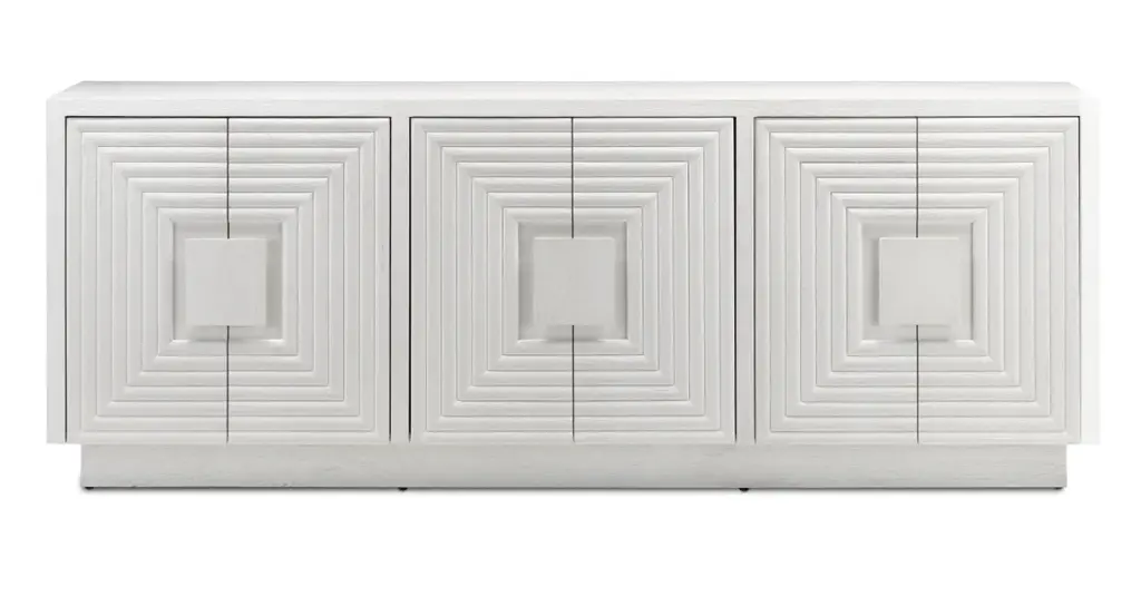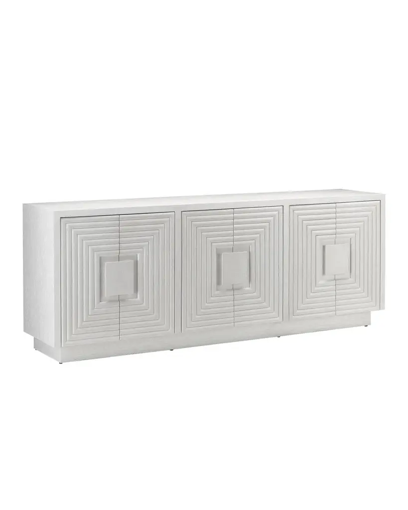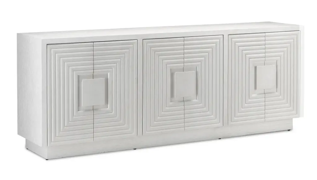 Notable for its extraordinary functionality and cool design, the Morombe Credenza is nothing short of artistry in wood. A deep-toned distressed cocoa finish highlights the skillfully carved patterns of natural wood that form embedded squares in a stylish geometric illusion of depth. Each of the three doors on this credenza has an array of adjustable and fixed shelving for a variety of storage solutions. Also available in white. Finish: Distressed Cocoa or White Materials: Oak Solids and Veneers Overall: 32.5"h x 84.25"w x 18"d Weight: 240 lb Hardware: Integrated Wood Pull Doors: 6 Hinges: Adjustable European Cup Hinge Adjustable Shelves: 4 Floor Protection: Adjustable Glides Anti-Tip Safety Hardware Included Manufacturer: Currey and Company Complimentary white glove shipping in the U.S.