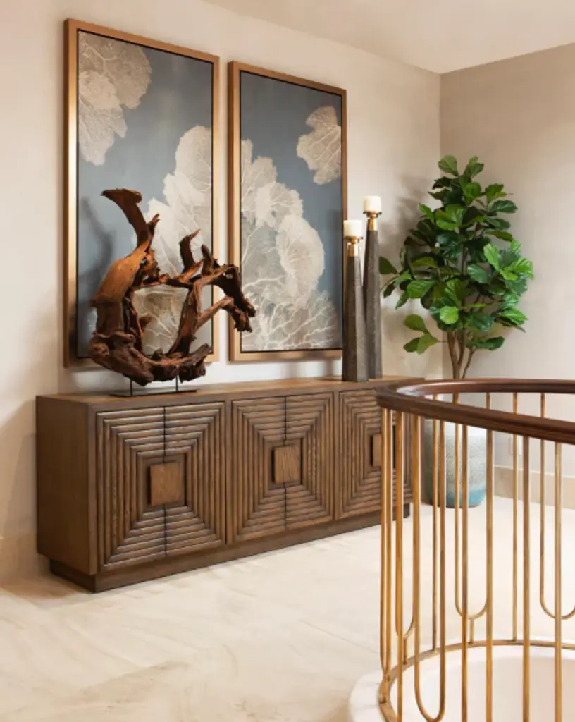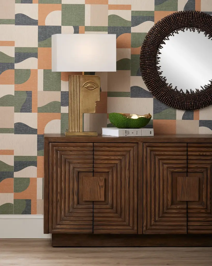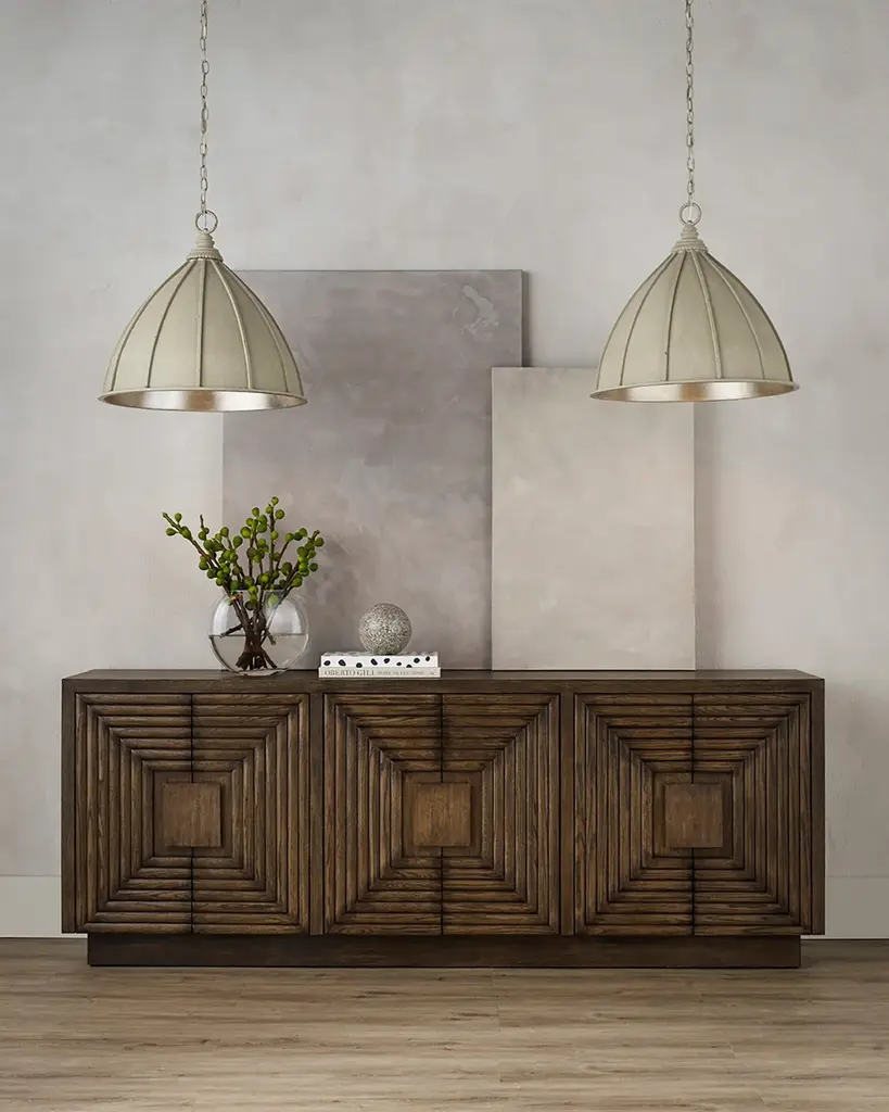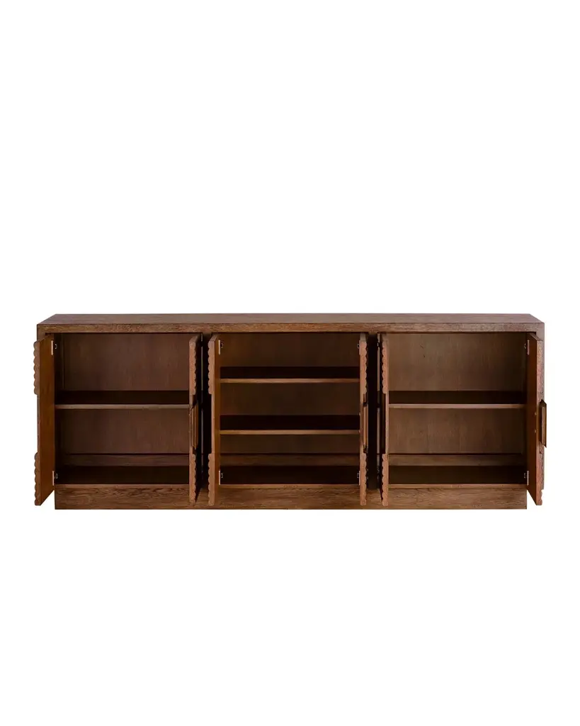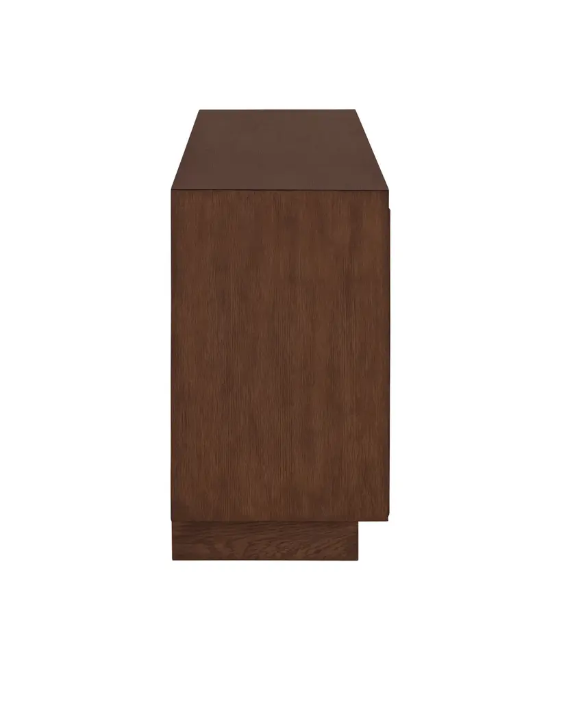 Notable for its extraordinary functionality and cool design, the Morombe Credenza is nothing short of artistry in wood. A deep-toned distressed cocoa finish highlights the skillfully carved patterns of natural wood that form embedded squares in a stylish geometric illusion of depth. Each of the three doors on this credenza has an array of adjustable and fixed shelving for a variety of storage solutions. Also available in white. Finish: Distressed Cocoa or White Materials: Oak Solids and Veneers Overall: 32.5"h x 84.25"w x 18"d Weight: 240 lb Hardware: Integrated Wood Pull Doors: 6 Hinges: Adjustable European Cup Hinge Adjustable Shelves: 4 Floor Protection: Adjustable Glides Anti-Tip Safety Hardware Included Manufacturer: Currey and Company Complimentary white glove shipping in the U.S.