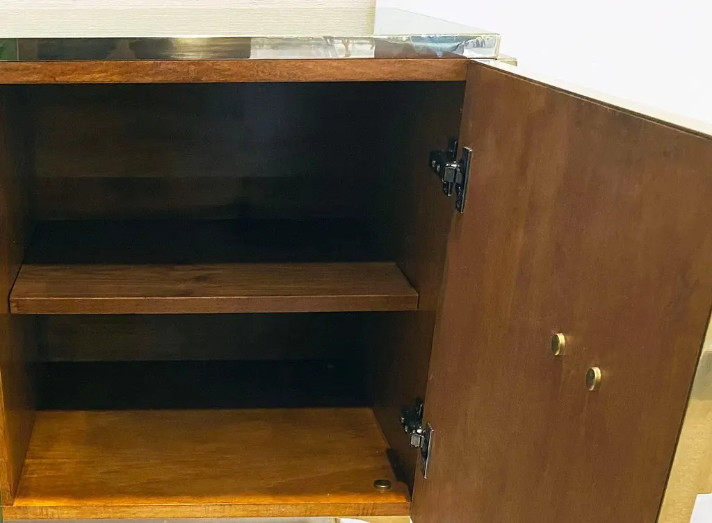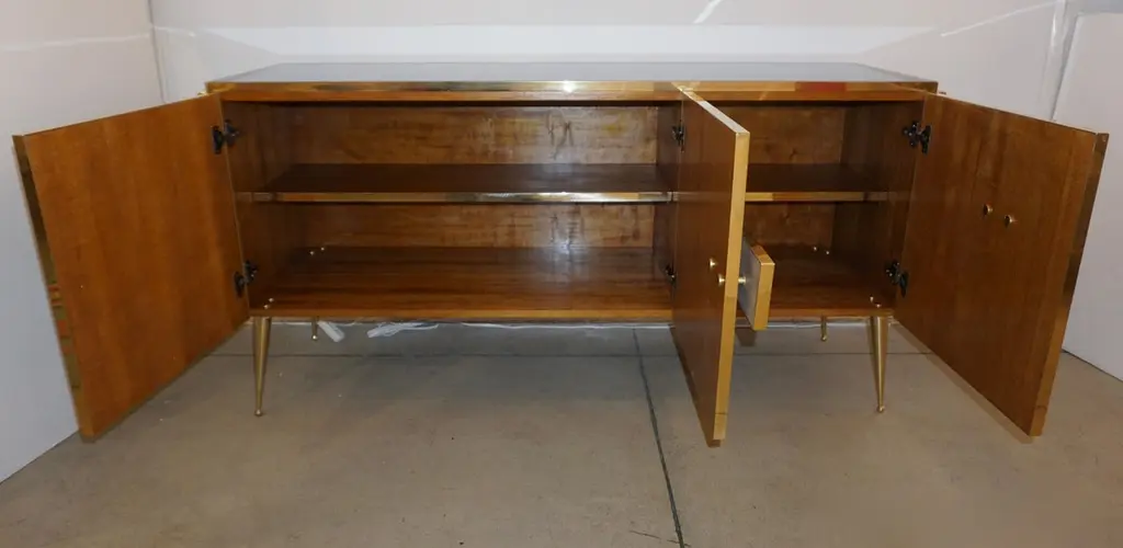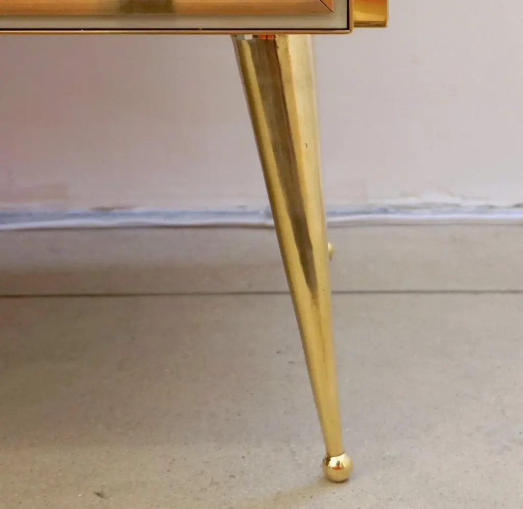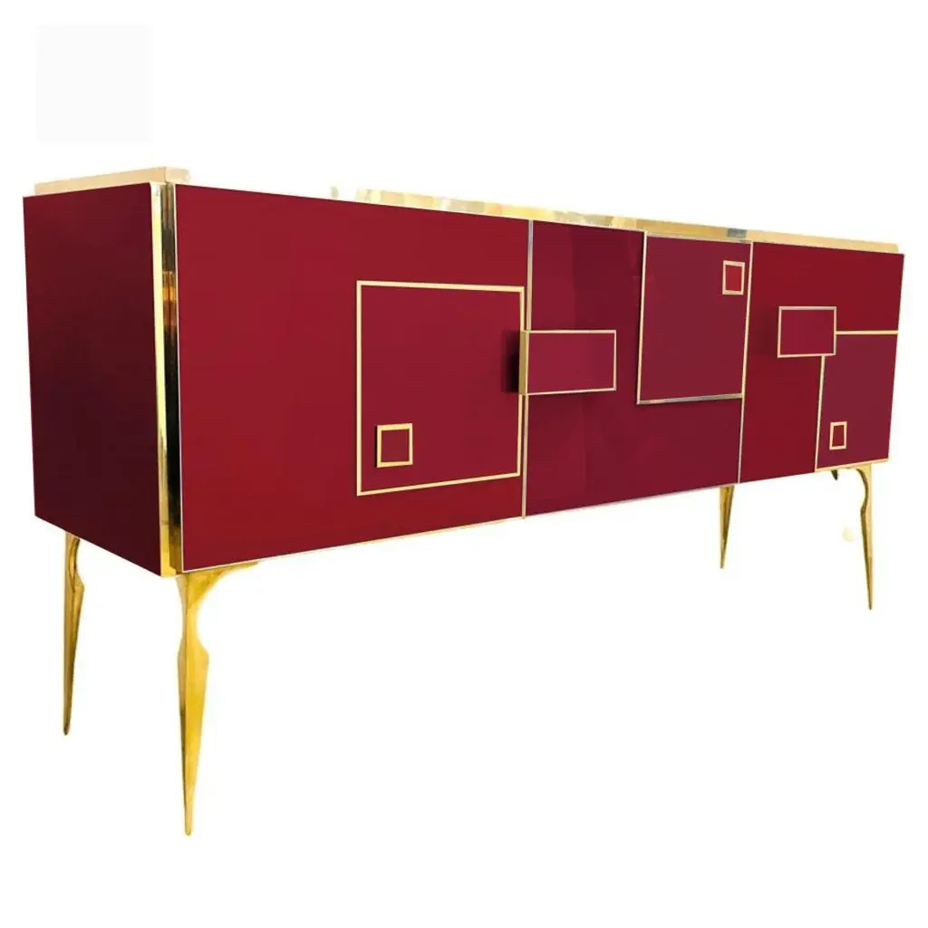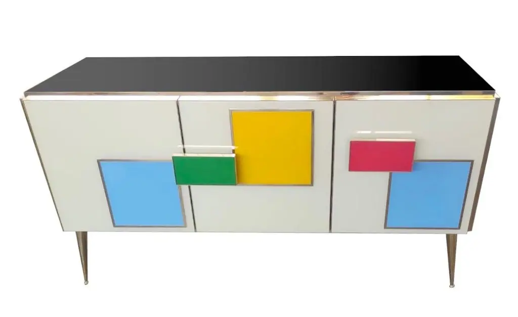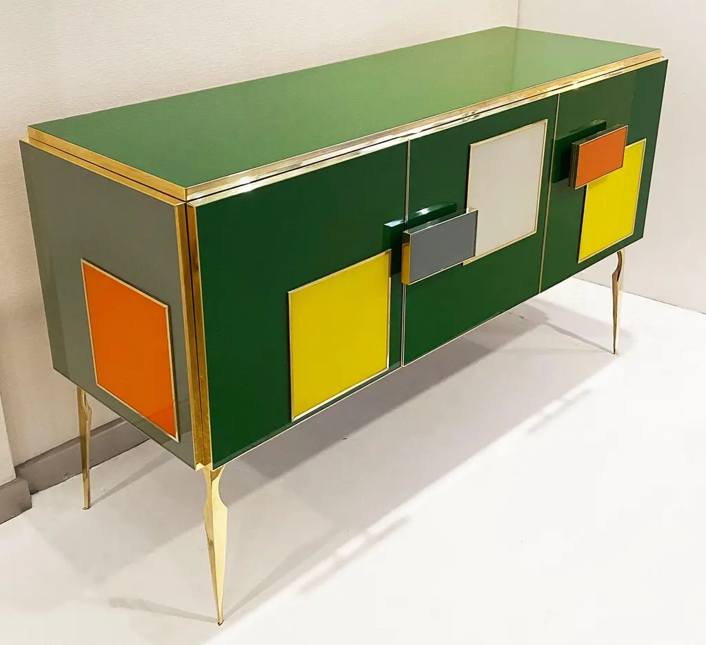 Bring your own accent colors to any space with our customizable modern collection, entirely handmade in Italy, with the purpose of anchoring individuality through Art in a functional piece, triggering personal healthy environments through your own narrative.Bespoke customizable 3-door modern cabinet sideboard, entirely handcrafted in Italy with Memphis inspiration for the attractive colorful deconstructed geometric decor with raised pattern and handles. The surround is decorated with art glass in sophisticated ivory white on the front, black on the top and night blue on the sides, accented by colored squares in relief in raspberry red, and in different colors on the front: yellow and baby blue, with protruding geometric handles individually handmade and bordered with brass edges, colored in forest green and raspberry red. The whole body raised on tapering brass legs, and the interiors fitted with one shelf.High quality of execution with great attention to detail: wood veneered interior, the whole body and doors exquisitely edged with natural brass profiles. The natural brass is untreated and acquires a patina in time. Contact us for different finishes.A versatile and functional design that can be personalized in colors, finishes and sizes, as a sideboard, credenza, nightstands, or desk and console. Slight variations in colors and size, as well as irregularities in manufacturing are intrinsic to these pieces due to the individual handmade production and conversion from inches to centimeters.