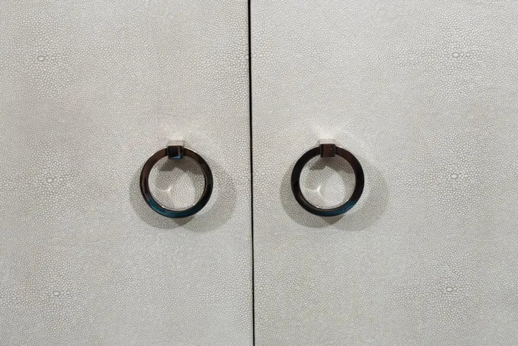 Custom lacquered sideboard with faux shagreen doors in pale gray and with custom hardware. Customization is available in different sizes, colors and hardware.