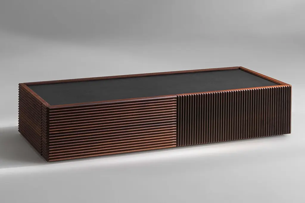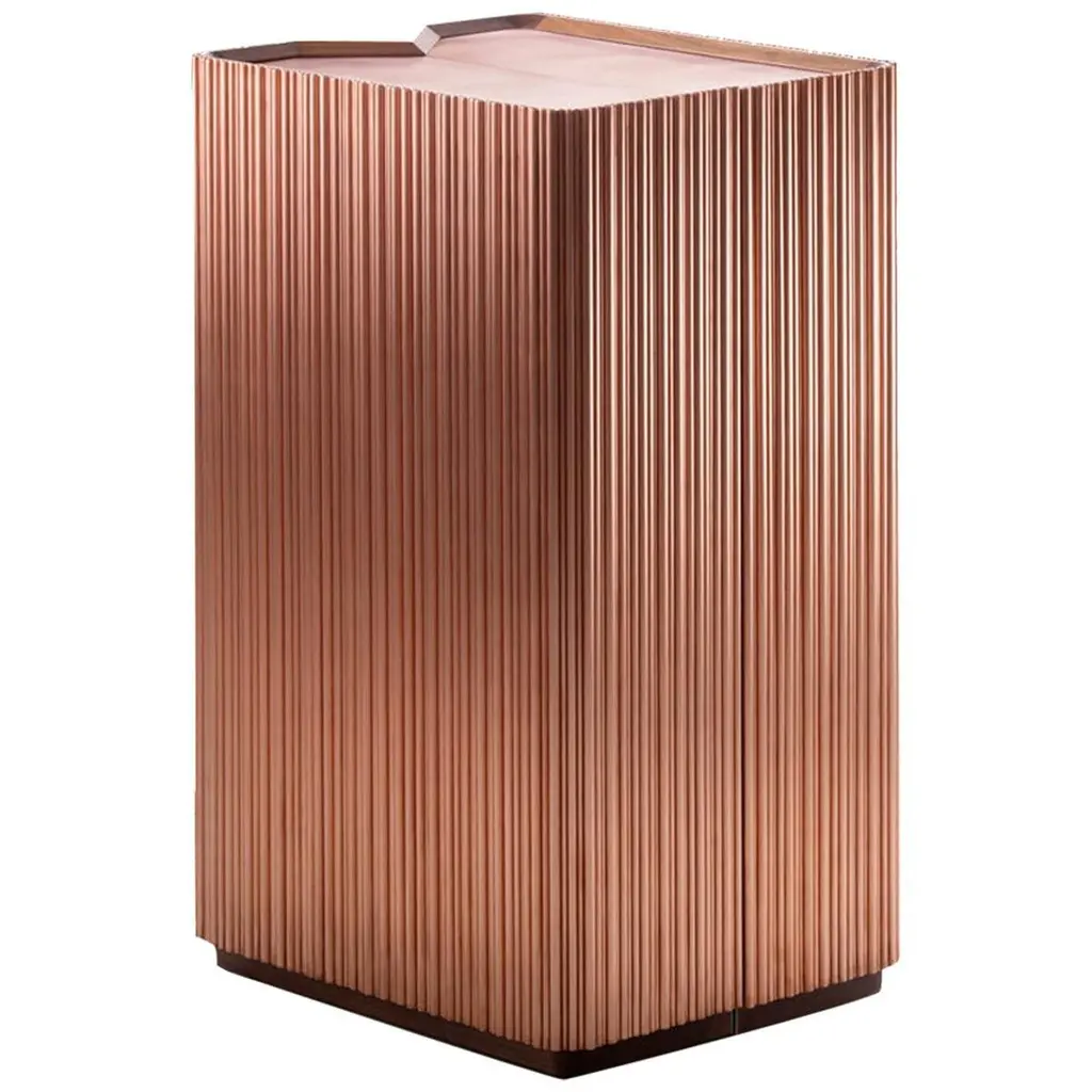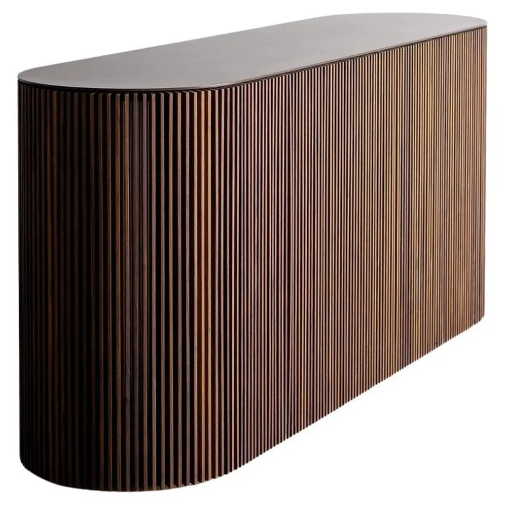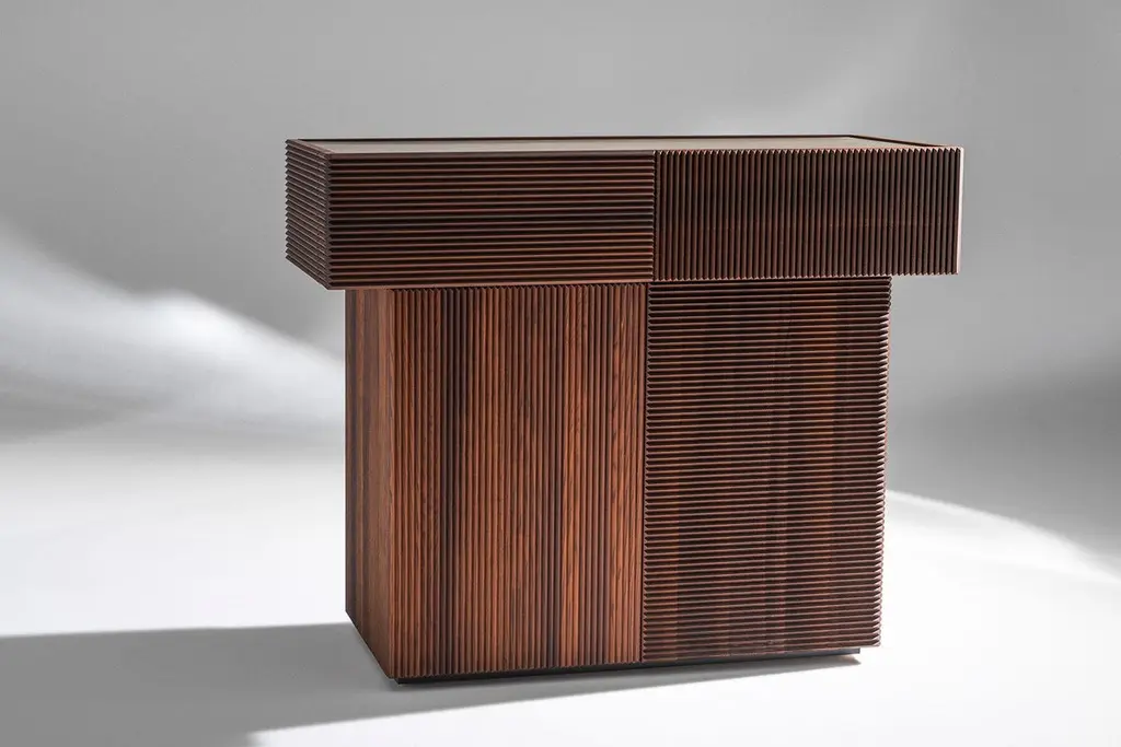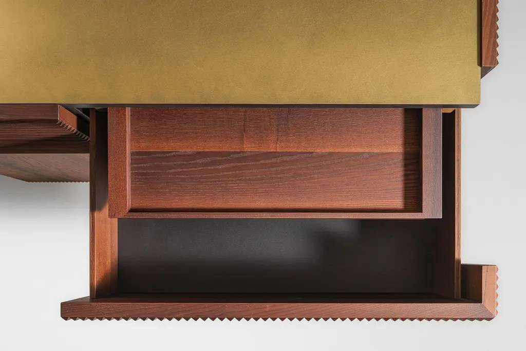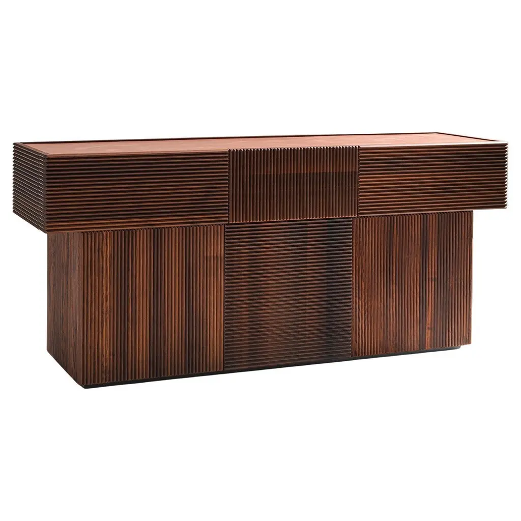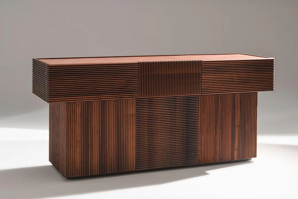 Available inHeat-treated ashLight bronze top finishCopper top finishTop brass finishSizesL 146 x P 58 x H 123 cmL 204 x P 53,5 x H 93 cmDesign Carlo CuminiSideboard composed of two units, the upper part with 2 or 3 drawers with slowed runners, the lower one with 2 or 3 doors.In the lower part we have 1 or 2 shelves for each compartment. Structure in white or black lacquered wood agglomerate. The top of the cabinet can have a light bronze, copper or brass finish on request and with a supplement.Drawer fronts, doors and sides in inlaid heat-treated ash with manual finish. Base with adjustable feet H cm. 3