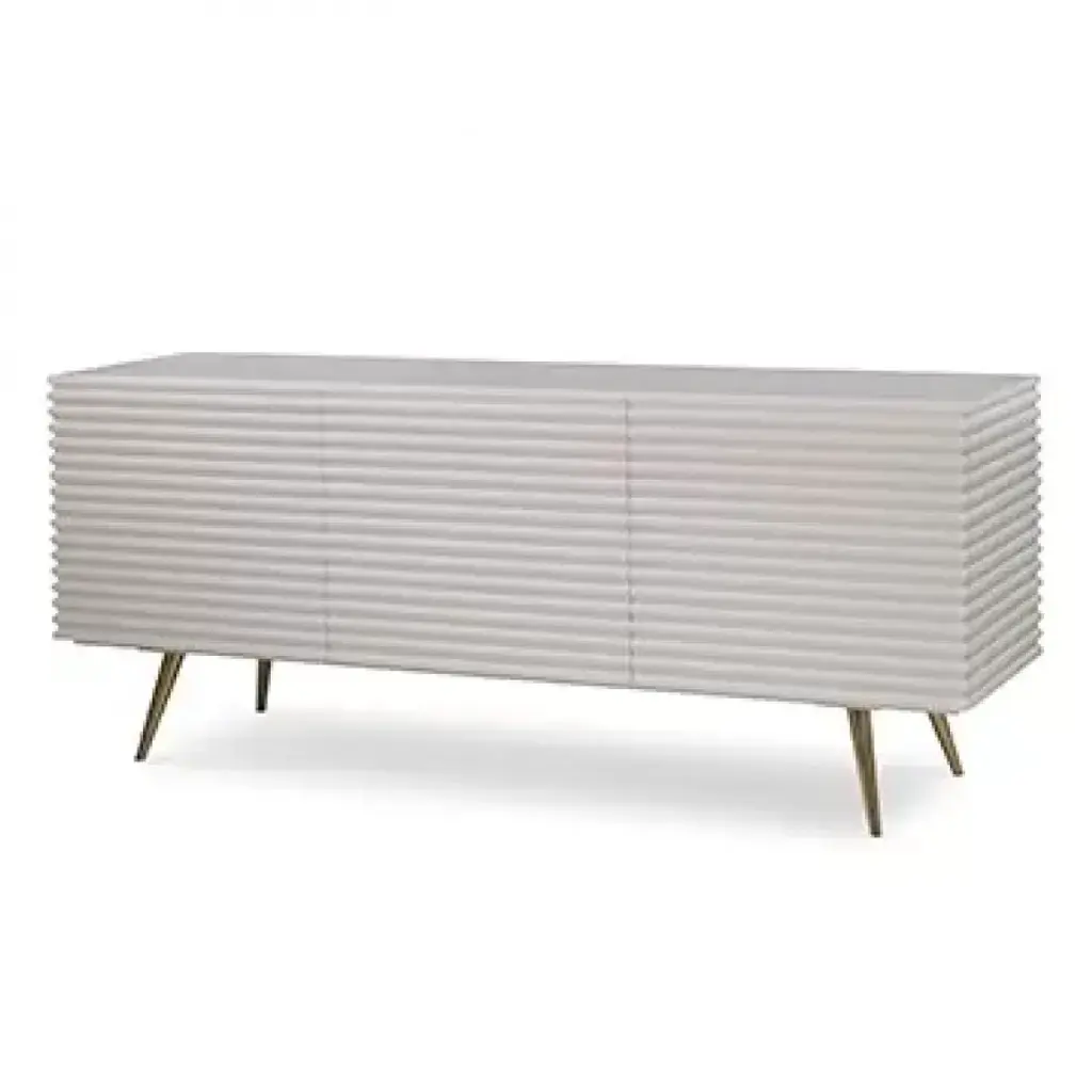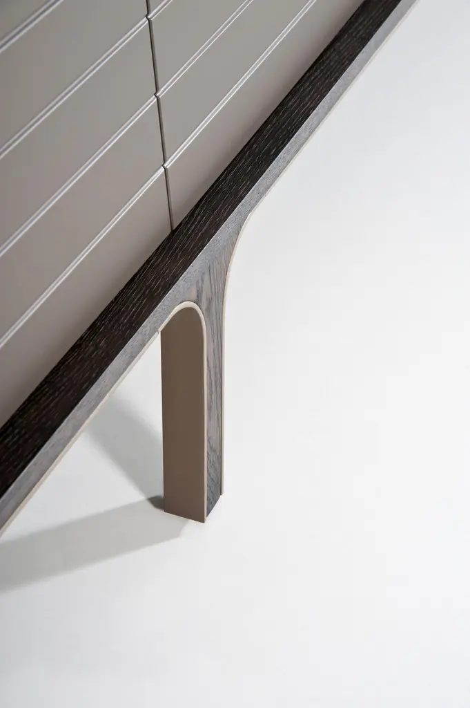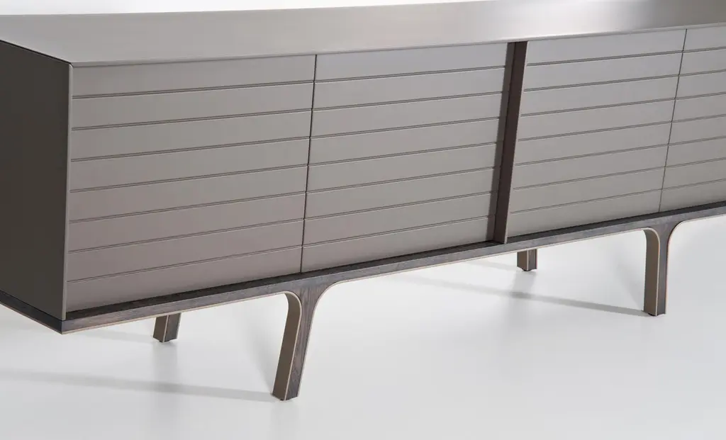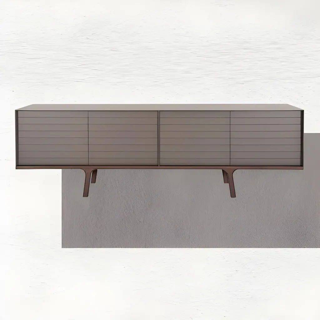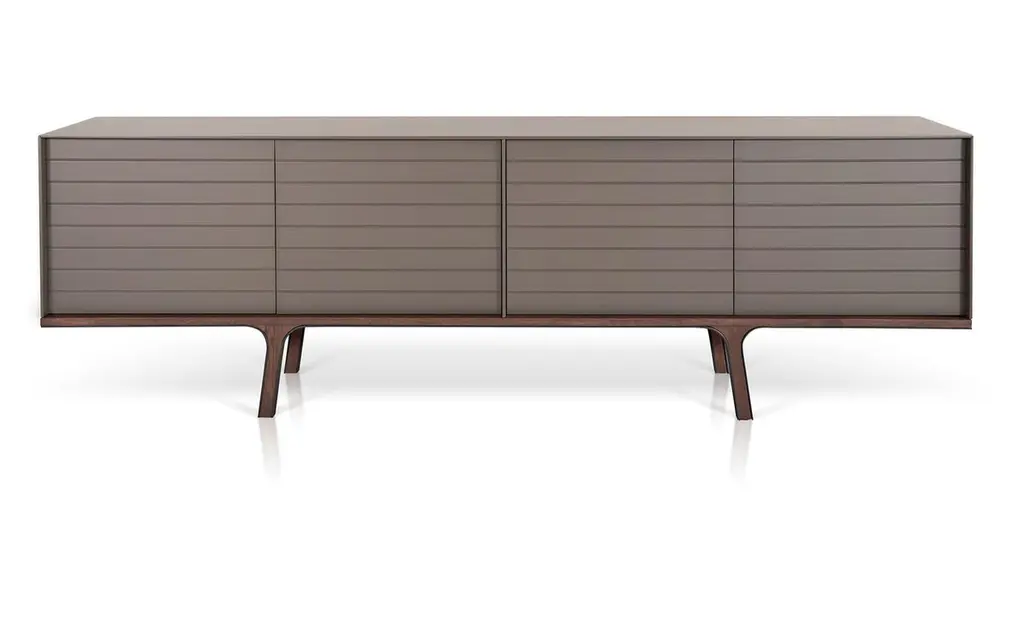 The sidebaord showcases a contemporary aesthetic with four lacquered wood doors, accented by a metal base and wooden details. Its front features tasteful horizontal stripes, lending it a unique architectural flair and a feeling of airiness. Behind each door lies a convenient shelf for organizing your belongings. This versatile piece comes in four sizes and offers customization options for finishes. Designed by Sotiris Lazou Design Studio.Please contact us if you have any questions about customization and pricing. We will be glad to check with the factory’s technical team if sizes, finishes, and colors can be customized. We do our best to expedite production and to ship and deliver product within the listed lead time, however current lead times might be longer due to global shipping backlog and delays. These delays are out of our control and cannot be a reason to cancel an order.