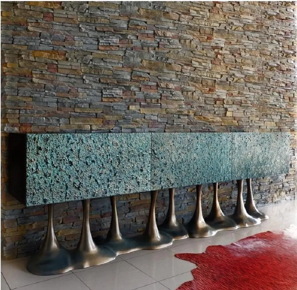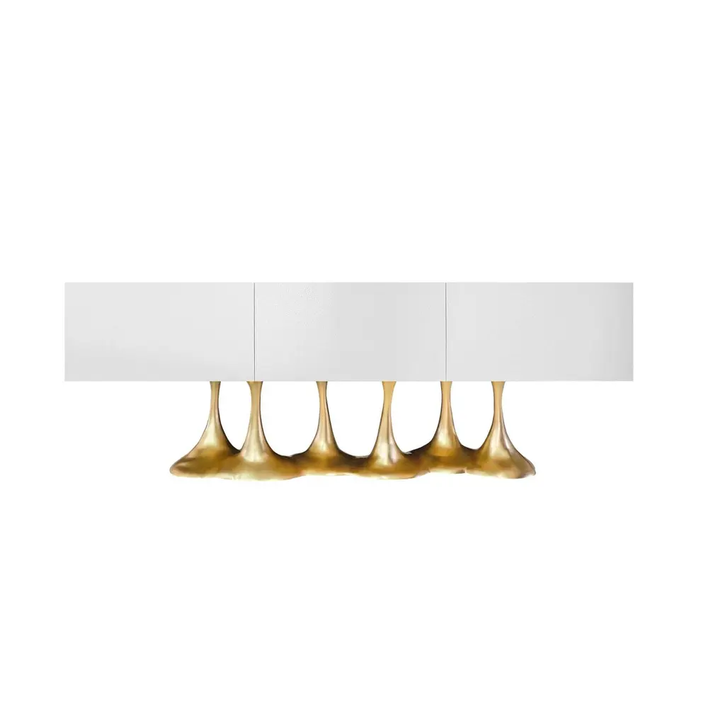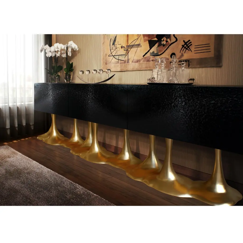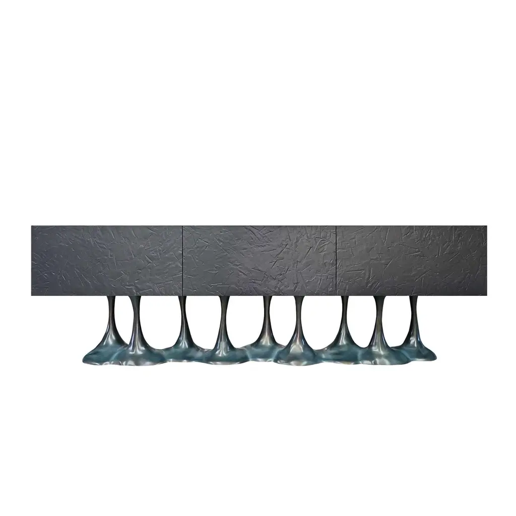 This design features a base inspired by the organic forms found in nature, characterized by bold lines and graceful curves, resulting in an appealing visual composition. The base is enhanced with a distinctive texture that contributes to its depth and personality. The sideboard is equipped with doors that boast a textured finish, meticulously crafted to offer both tactile and visual allure. Feel free to reach out for inquiries regarding customizations in finish and size.This sideboard can be customized in size as well as in finishes. A variety of colors and textures can be specified to make this a unique statement piece.We do our best to expedite production and to ship and deliver product within the listed lead time, however current lead times might be longer due to global shipping backlog and delays. These delays are out of our control and cannot be a reason to cancel an order.