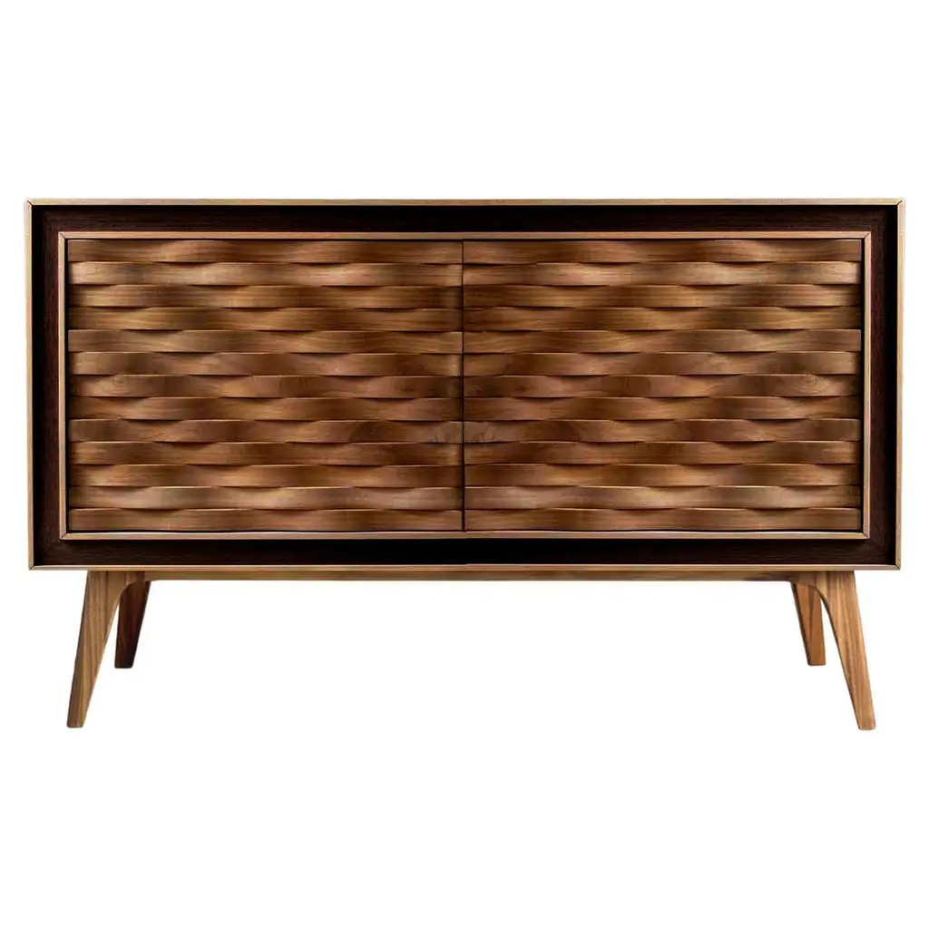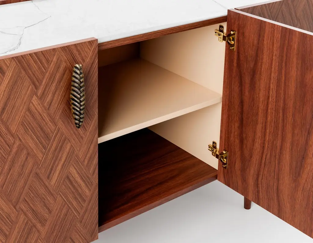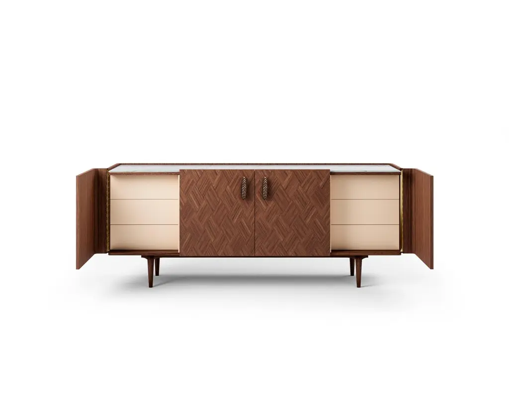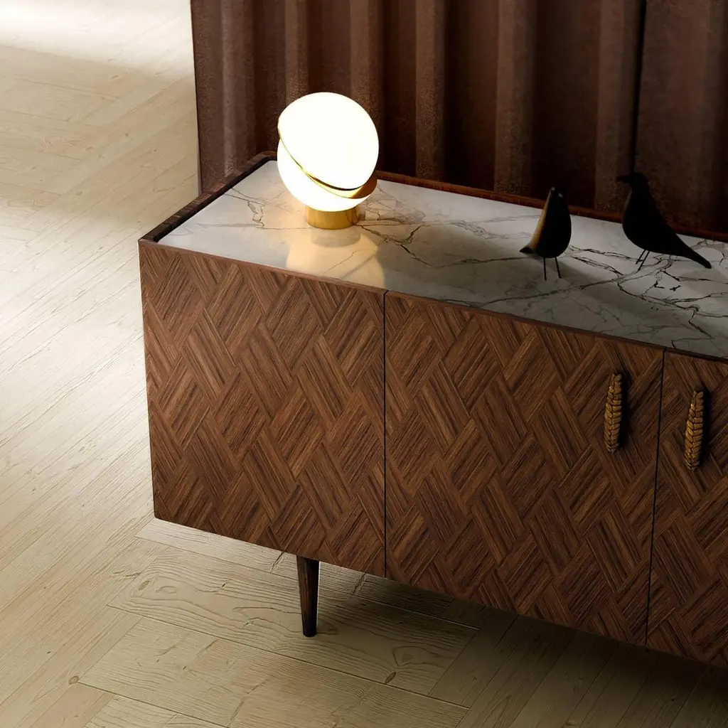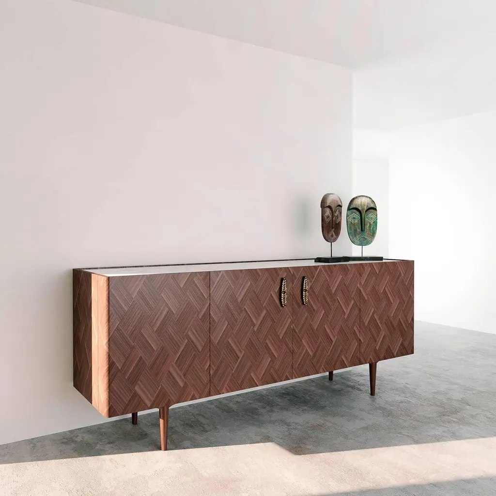 This sideboard features a structure in multi-layer plywood and MDF with a patterned veneer, offering flexibility for custom sizes and finishes on demand. The exterior can be customized with veneers in Walnut, Ebony, Oak, or Mahogany, and is available in matte, satin, or gloss varnish. Handles come in casted brass with an antique patina or casted aluminum. Marble options include Estremoz, Calacatta, Carrara, Nero Marquina, Sahara Noir, and Dark Brown Emperor. The interior is equipped with six lacquered drawers and a central lacquered shelf, with available finishes in Rosewood, Ebony, Walnut, Oak, or Lacquered. Varnish options for the interior include matte, semi-gloss, and high-gloss.Behold this exquisite sideboard crafted from rich walnut and gleaming polished marble. Its distinctiveness lies in the intricate inlaid marquetry, which not only adorns the piece but also creates captivating dimensional reliefs by blending wood and stone hues. Inspired by the mesmerizing works of M.C. Escher, renowned for his "impossible" woodcuts that delve into infinity and metamorphosis, this feature stands out as a defining characteristic.We do our best to expedite production and to ship and deliver product within the listed lead time, however current lead times might be longer due to global shipping backlog and delays. These delays are out of our control and cannot be a reason to cancel an order.