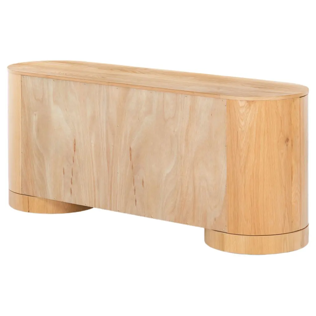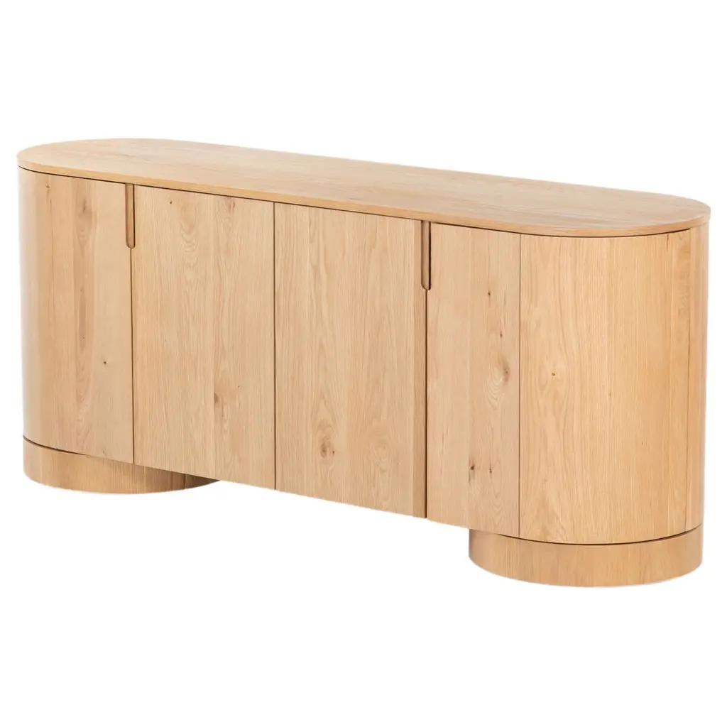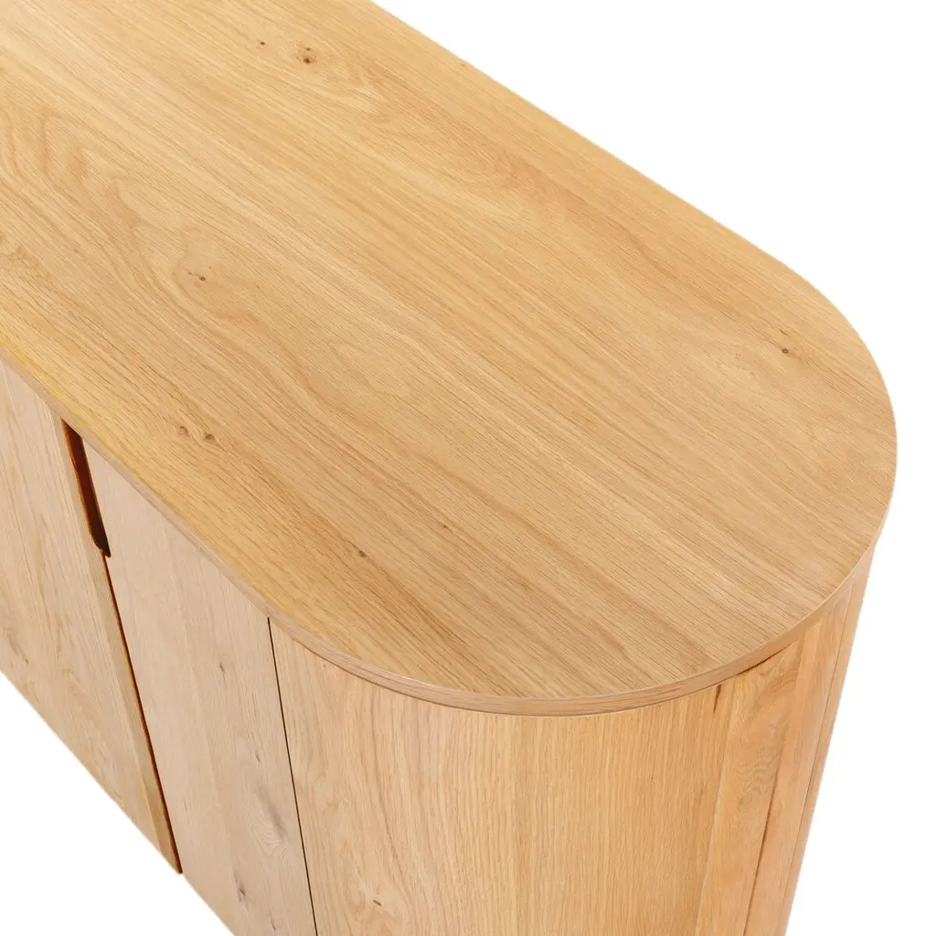 Introducing The Cynrae Oval 4 Door Wood Sideboard. A versatile and timeless addition to any living space, this attractive piece is skillfully constructed from rubberwood and veneer, ensuring a robust structure and stylish silhouette. The sideboard showcases a beautiful balance of materials with aluminum metal detailing that lends it a modern edge. Despite the absence of fabric material, the intrinsic allure of its wood and metal composition is undeniably captivating. This sideboard offers expansive storage with four doors, making it not just a statement piece but a functional investment. Versatile, sophisticated, and practical, the Cynrae Oval 4 Door Wood Sideboard enhances your home with unforgettable style and supreme functionality.