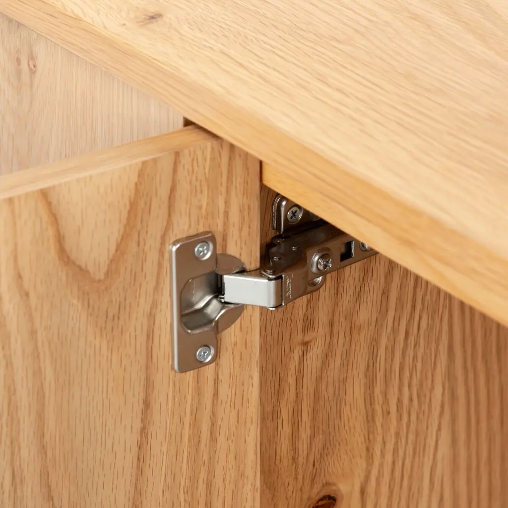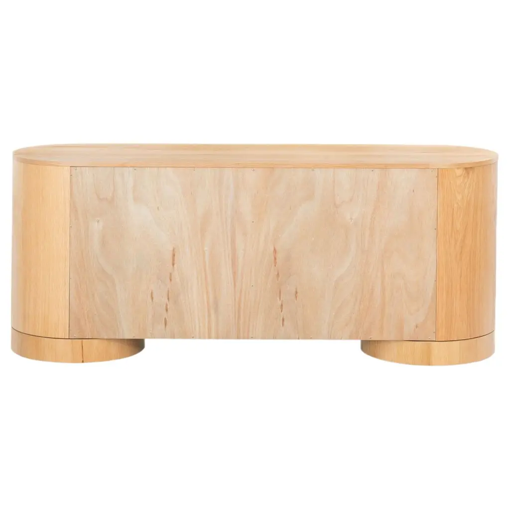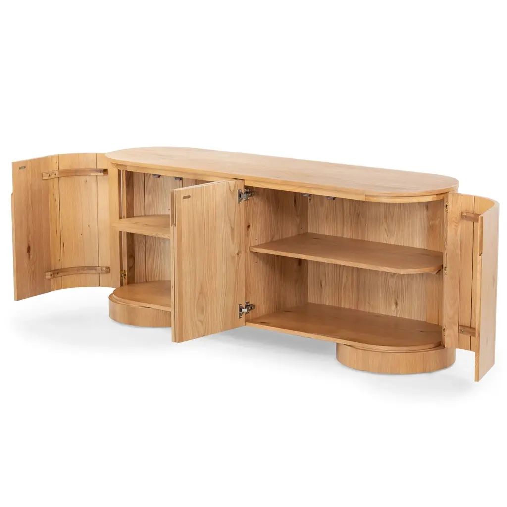 Introducing The Cynrae Oval 4 Door Wood Sideboard. A versatile and timeless addition to any living space, this attractive piece is skillfully constructed from rubberwood and veneer, ensuring a robust structure and stylish silhouette. The sideboard showcases a beautiful balance of materials with aluminum metal detailing that lends it a modern edge. Despite the absence of fabric material, the intrinsic allure of its wood and metal composition is undeniably captivating. This sideboard offers expansive storage with four doors, making it not just a statement piece but a functional investment. Versatile, sophisticated, and practical, the Cynrae Oval 4 Door Wood Sideboard enhances your home with unforgettable style and supreme functionality.