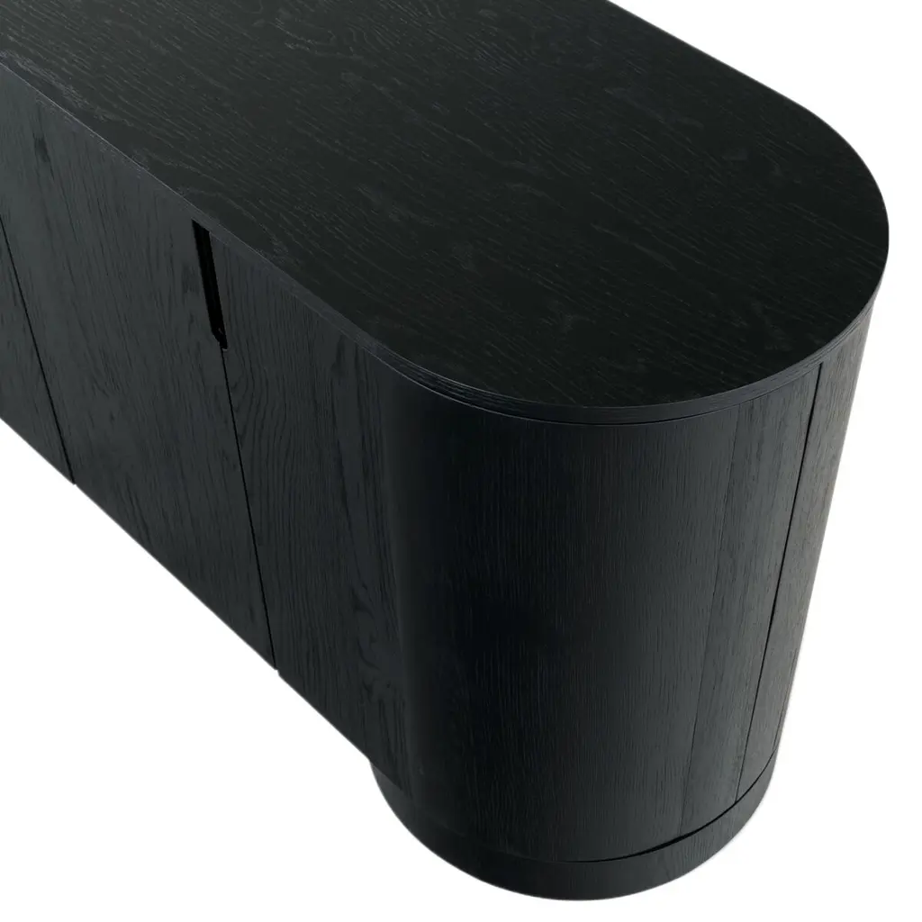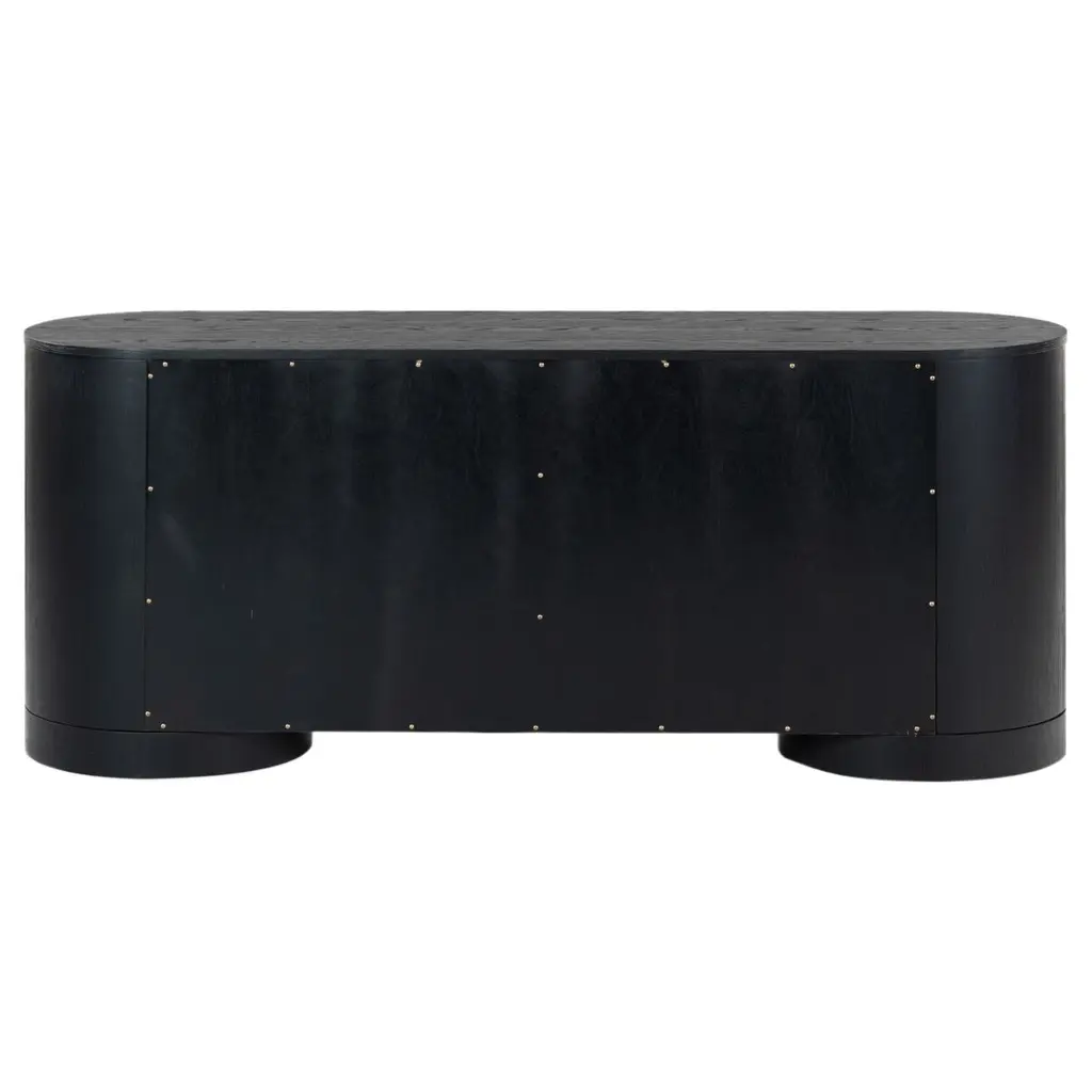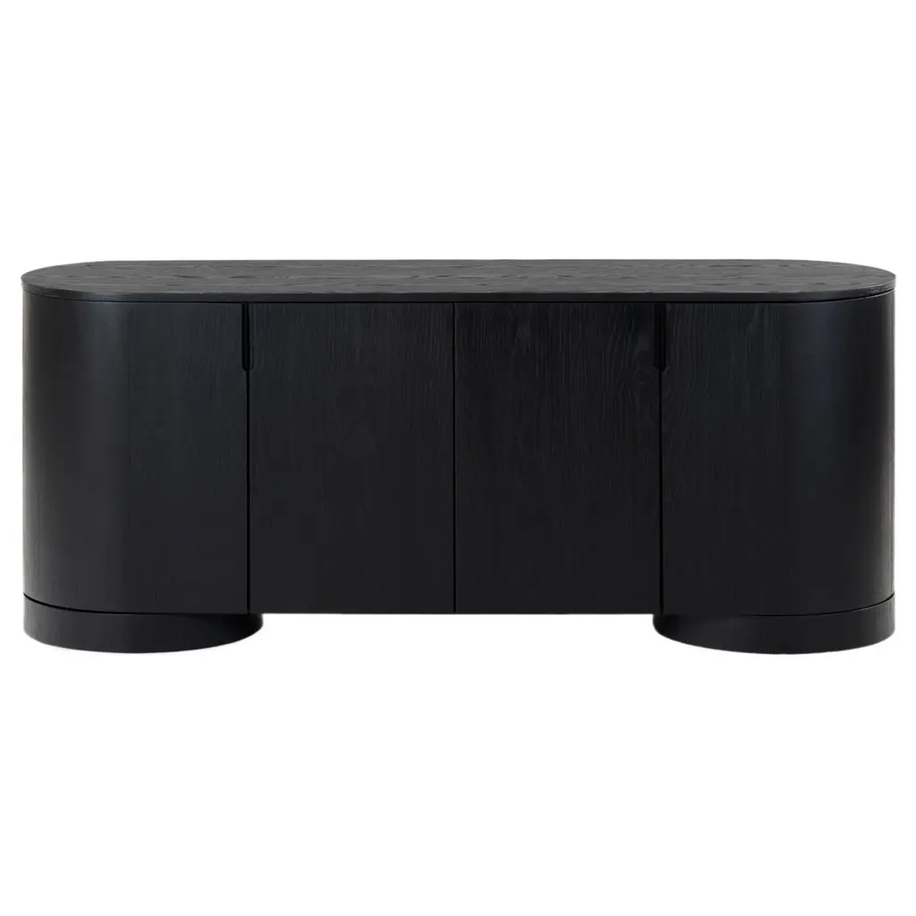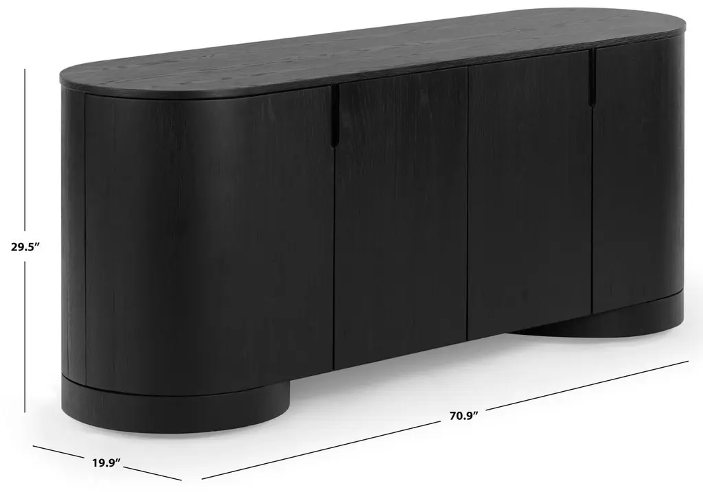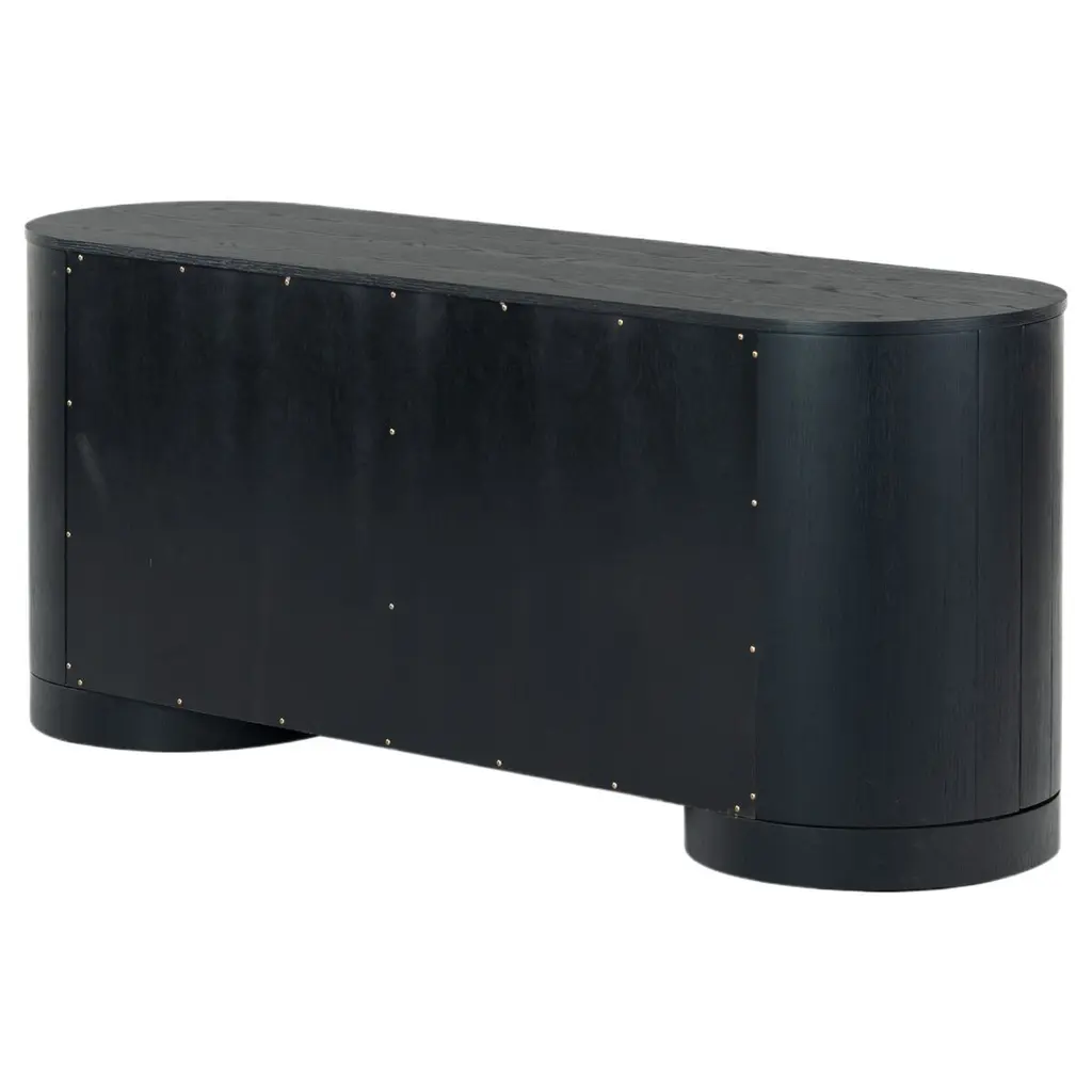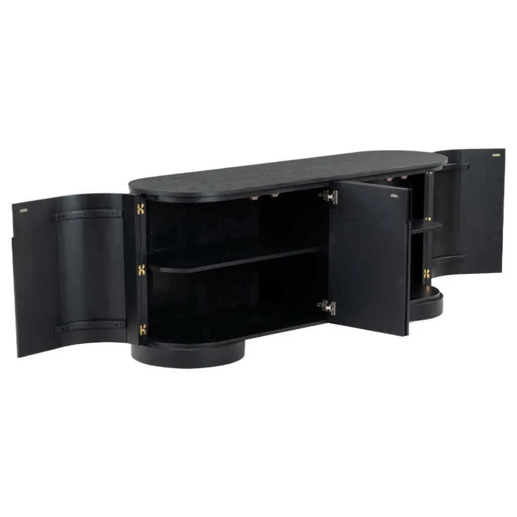 Introducing The Cynrae Oval 4 Door Wood Sideboard. A versatile and timeless addition to any living space, this attractive piece is skillfully constructed from rubberwood and veneer, ensuring a robust structure and stylish silhouette. The sideboard showcases a beautiful balance of materials with aluminum metal detailing that lends it a modern edge. Despite the absence of fabric material, the intrinsic allure of its wood and metal composition is undeniably captivating. This sideboard offers expansive storage with four doors, making it not just a statement piece but a functional investment. Versatile, sophisticated, and practical, the Cynrae Oval 4 Door Wood Sideboard enhances your home with unforgettable style and supreme functionality.