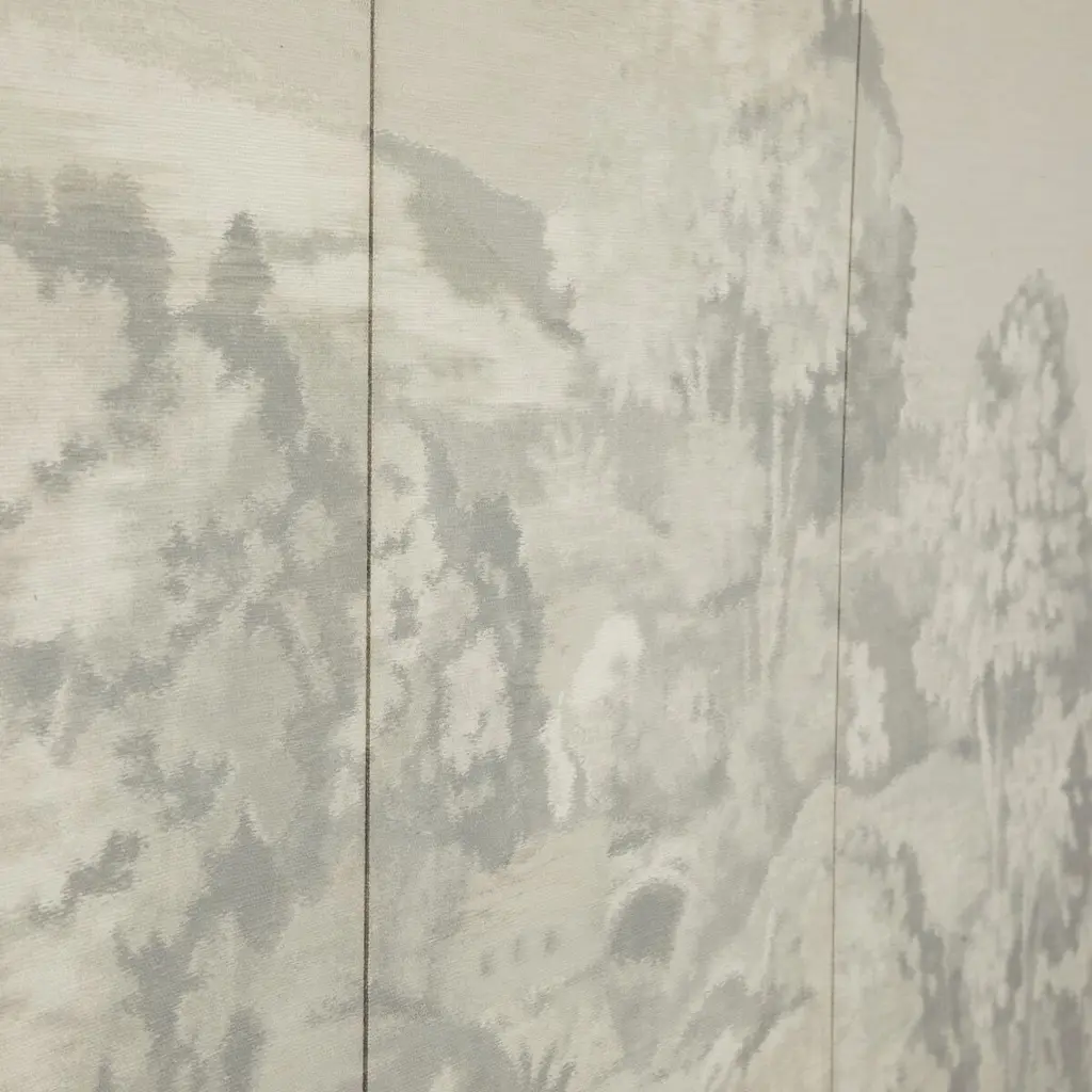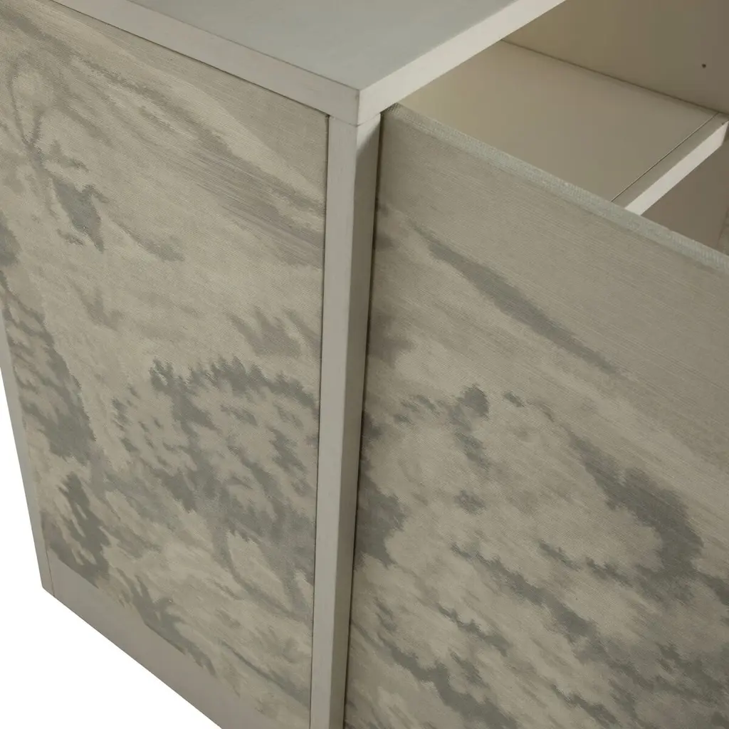 The Daliyah Sideboard is a modern, tall piece that stands out with its simple geometric silhouette, designed to accentuate its front and sides. These surfaces are wrapped in a custom fabric that portrays a classic and traditional landscape in soft neutral tones, inspired by French tapestries, adding an artistic and sophisticated touch. With four doors, this sideboard offers ample storage space, making it not only a stunning decorative element but also a practical solution for keeping essentials organized. It's an ideal choice for those looking to add a piece with both functional value and a unique aesthetic appeal to their home.