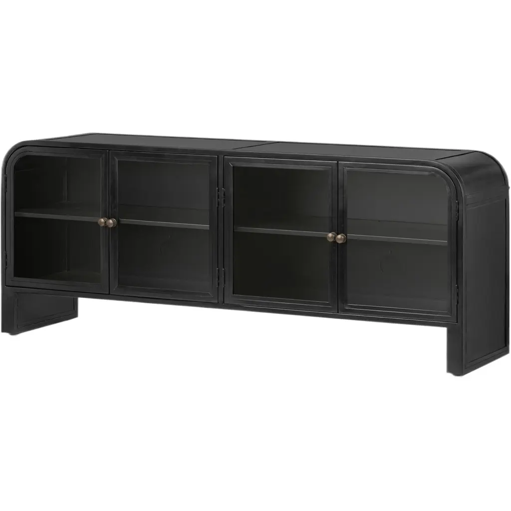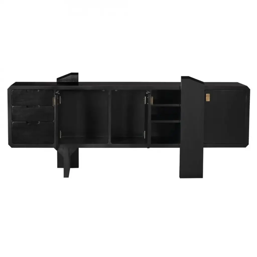 The Dallas Sideboard in Hand Rubbed Black combines luxurious materials and exceptional craftsmanship to create a striking piece for any interior. Crafted from rich mahogany and veneer, its deep hand-rubbed black finish enhances the natural grain of the wood, offering a sophisticated and timeless look. Brass pulls add an elegant touch, complementing the sideboard's refined design.