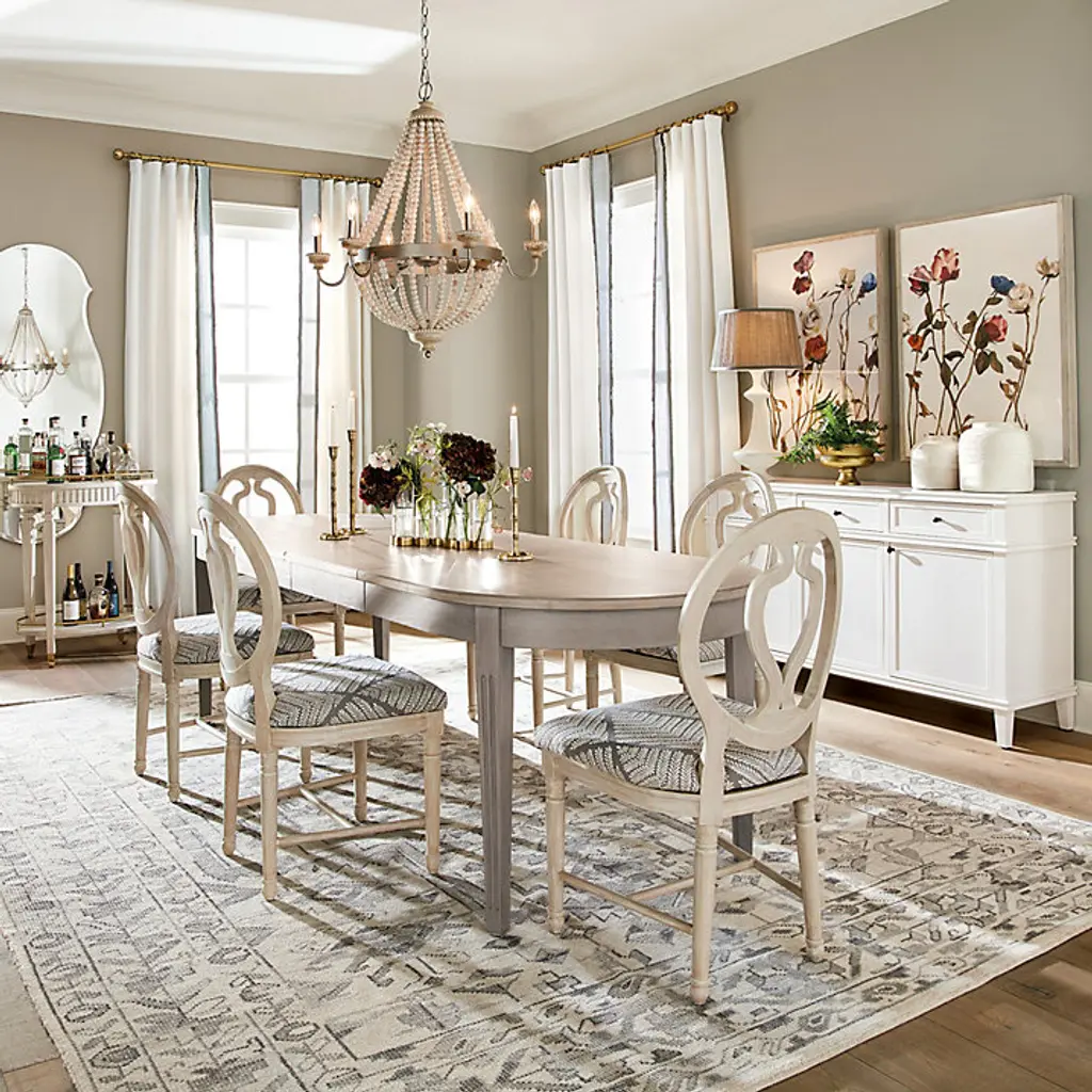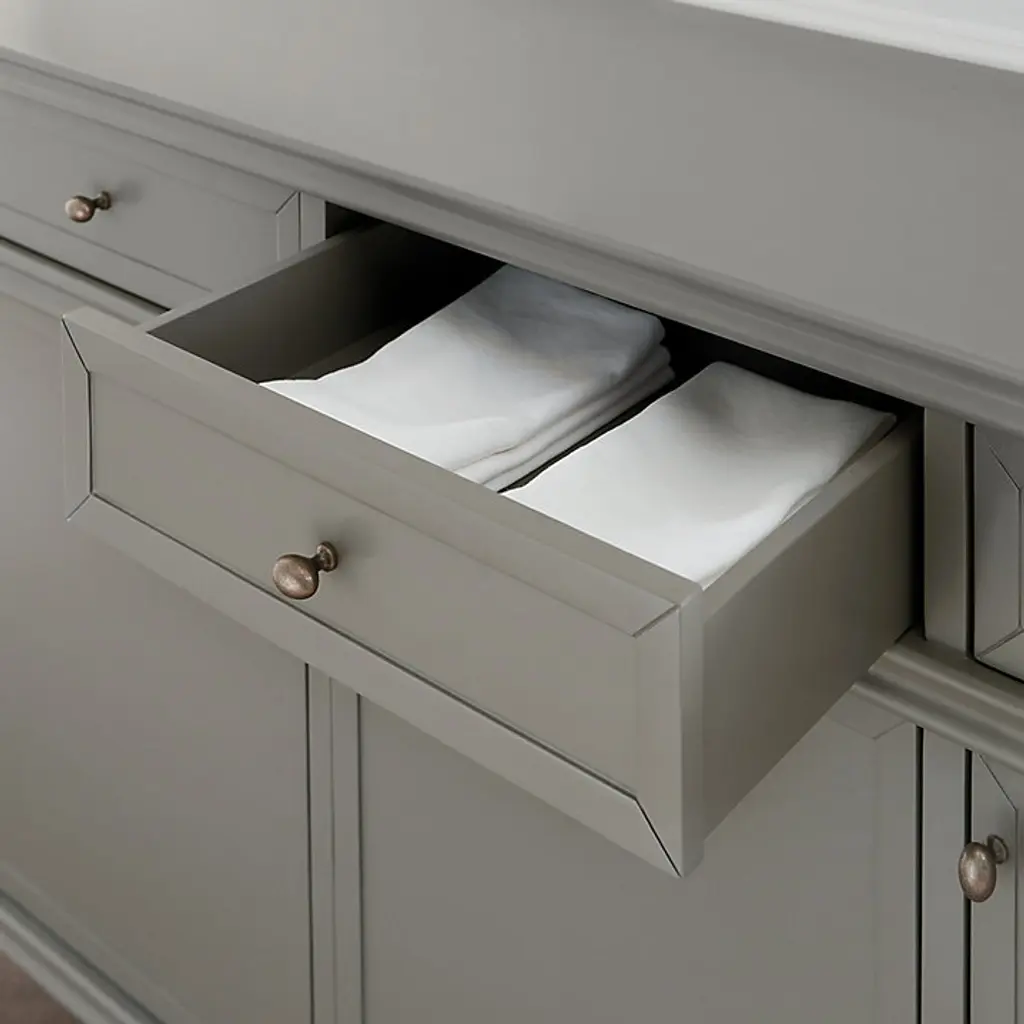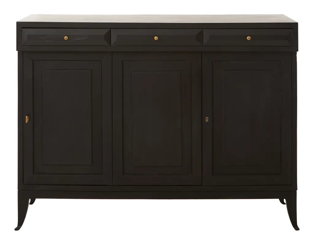 Our Daphne Sideboard is a beautiful blending of classic lines and updated details. Three drawers hold your silverware, napkins and serving utensils. Two left doors conceal one long adjustable shelf for larger serving pieces and table linens. Right cabinet has one shorter adjustable shelf. Mitered drawer and door fronts framed with pretty molding give this buffet-perfect sideboard a finely crafted look. Daphne Sideboard features: