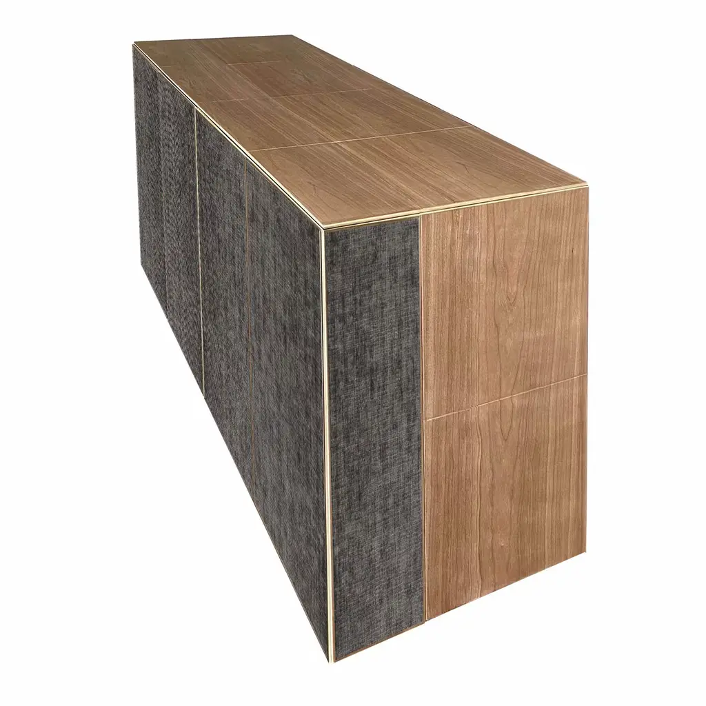 Carefully handcrafted of cherry, this sideboard boasts an elegant linear structure marked by refined sartorial details. A discreet plinth base sustains the frame, equipped with three inner shelves and four doors preciously upholstered in fine dark-gray linen velvet. Part of the Wood and Velvet Collection, it belongs to a signed 10-piece series supplied with label with details on the lot number and date.