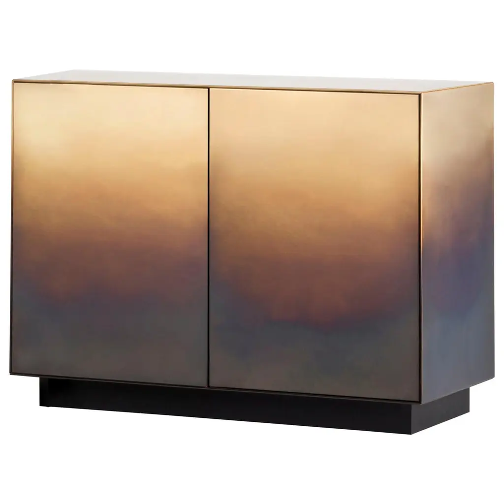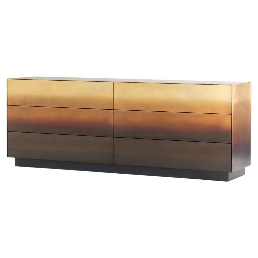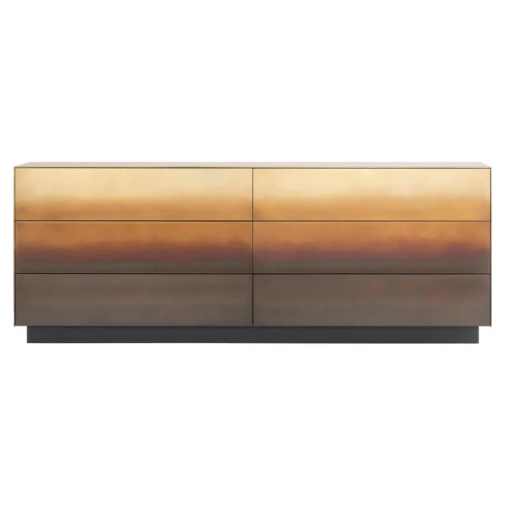 The traces of time are drawn one on top of another, infused into the changing skin of the rigorous metal forms that define these cabinets and chests. Like the tide (marea in Italian) leaves its mark, wave after wave, even here the hand of the craftsman has left its sign, oxidation after oxidation, creating a painterly effect that resembles water’s erosion of the material. Somewhere between design object and work of art, each piece in the collection, composed of a chest of drawers, low credenza and cabinet, is unique thanks to an entirely hand-crafted finish that transforms the metal surface into a delicate watercolour.Additional Information: Material: Brass and structure in titanium oakFinish: DeMarea M6 BrassDimensions: W. 190 x D. 45 x H. 71 cmAvailable in other finish options: DeMarea M5 copper and DeMarea M4 stainless steelAvailable in other size options: W. 96 x D. 45 x H. 71 cm; W. 285 x D. 45 x H. 71 cm