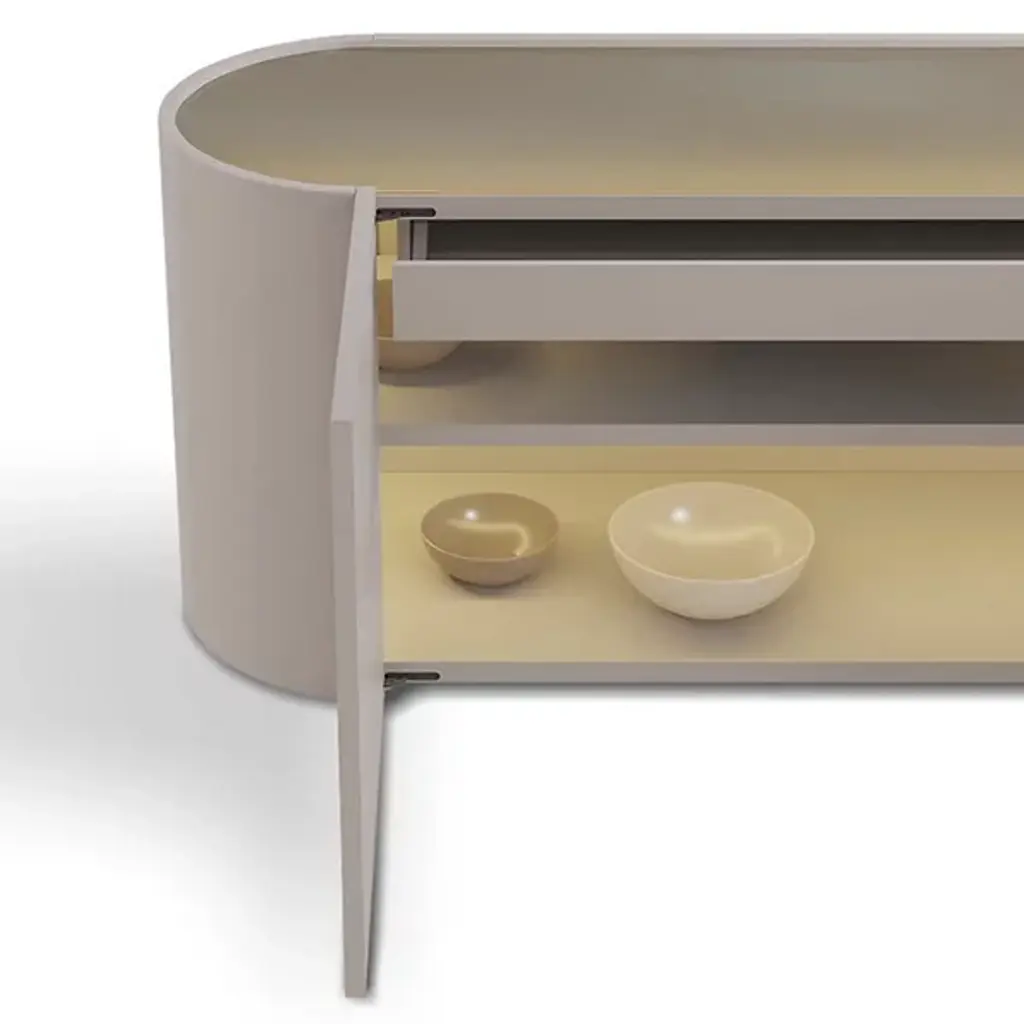 The Dedalo Sideboard by Pianca merges refined elegance with incredible functionality. Designed by Luciano Marson, its oval form features gracefully curved ends connected by a slim back panel, creating a recessed display-top tray. A discreet front handle leads to a spacious interior with a convenient Ala drawer using invisible opening hardware for easy opening and self-closing while adding a welcome touch of refinement. This Italian-made piece offers ample hidden storage while adding luxurious sophistication to any modern living space.