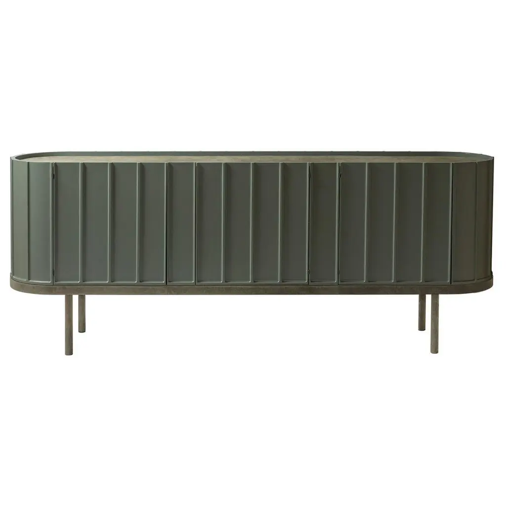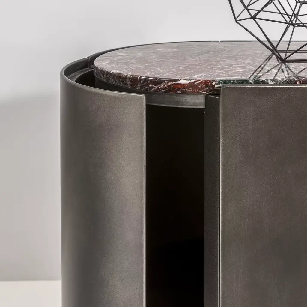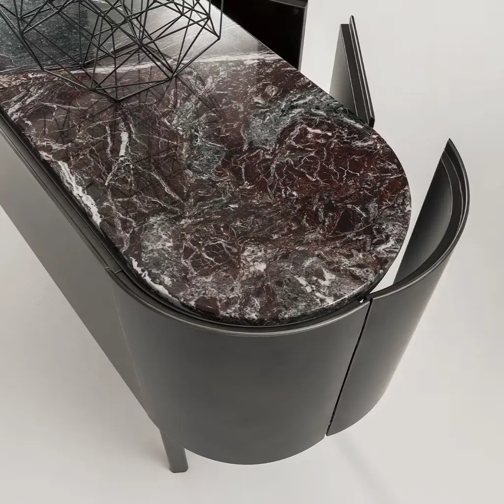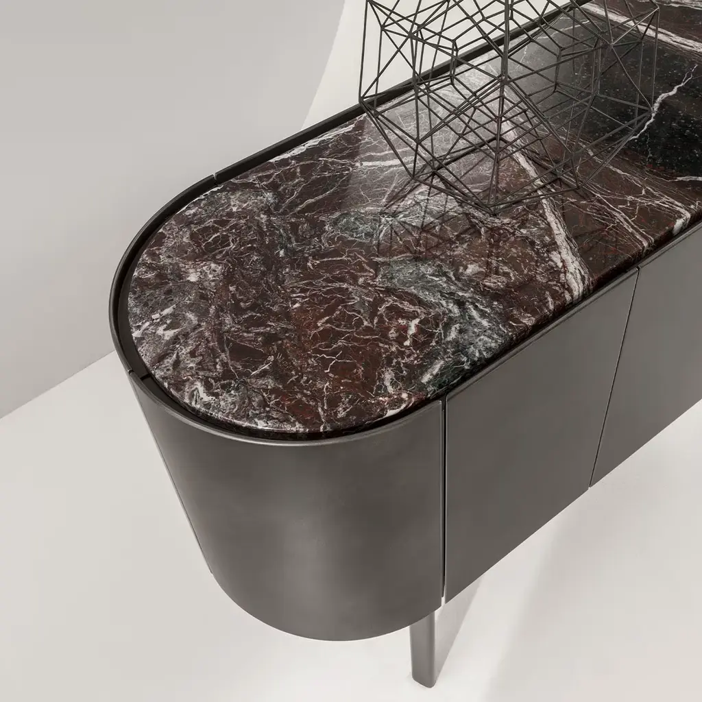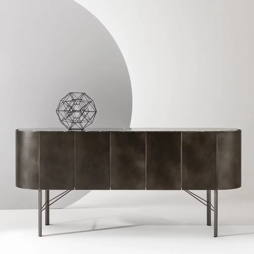 Raised on sleek gunmetal-gray metal legs, this low sideboard cleverly combines harmonious curves and refined finishes. A precious Levanto marble top states its plush flair, while the seven-hinged doors and structure are offered in Delabré tin for an intriguing chromatic quality. Please explore the wide variety of different sizes and finishing options by contacting the Concierge.