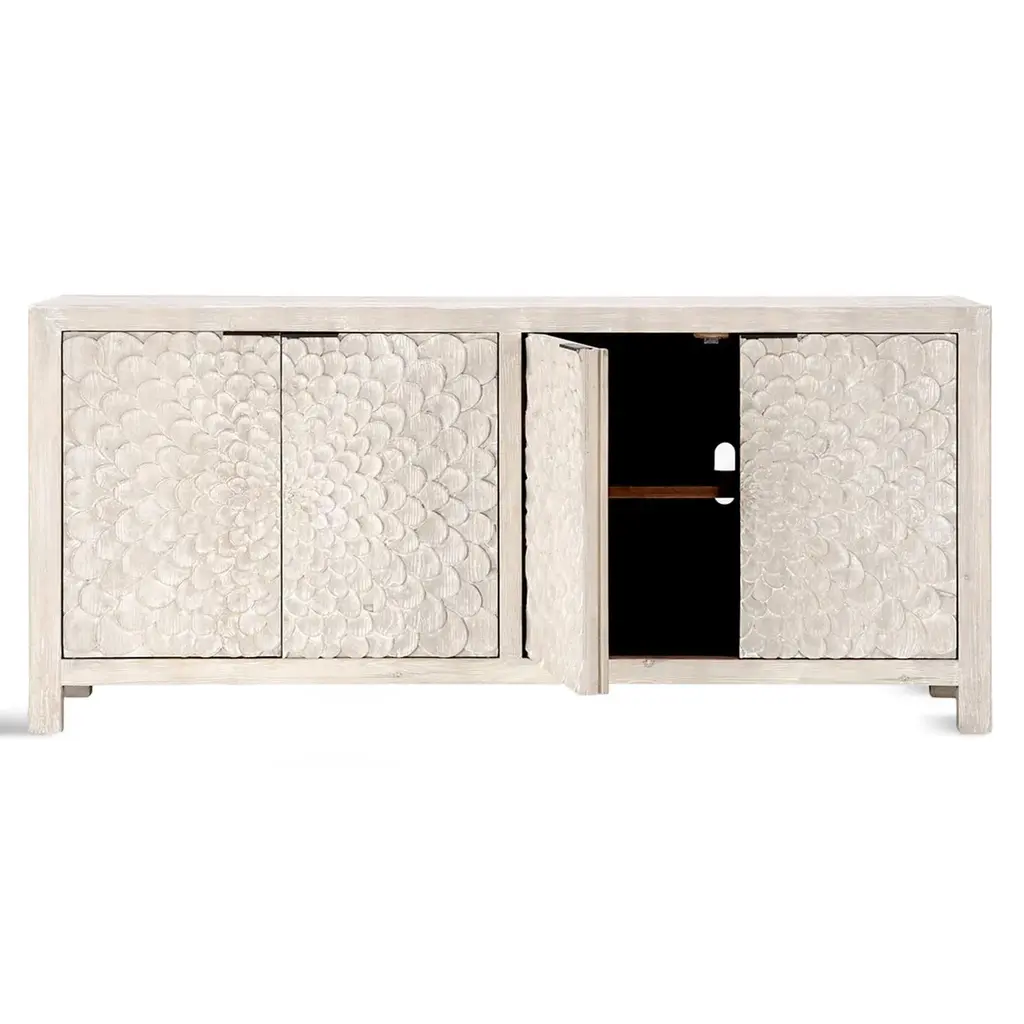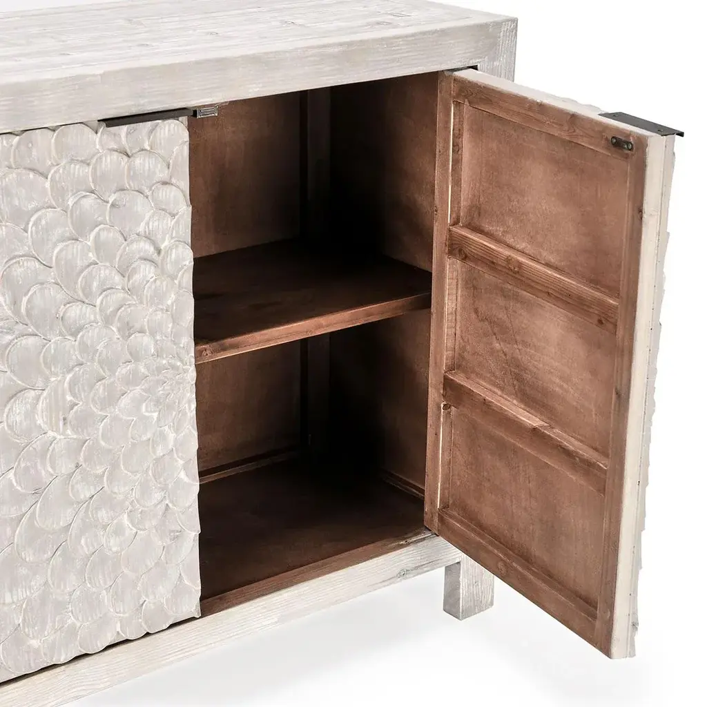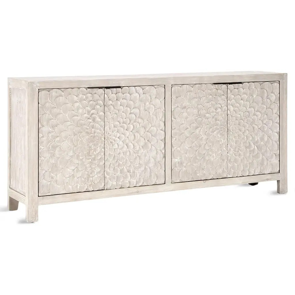 White washed finish reclaimed pine wood sideboard. Carved Delilah flower design pattern on four cabinet doors. Adjustable interior shelving and cutouts in back for wire management. Each sideboard will vary in exact finish/tones, grain, and inherent imperfections. Weight is approx. 175 lbs.