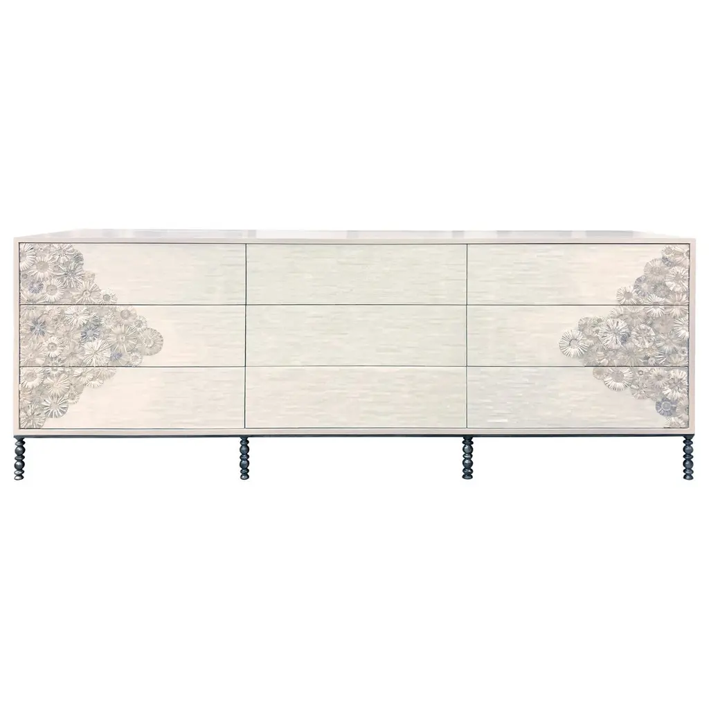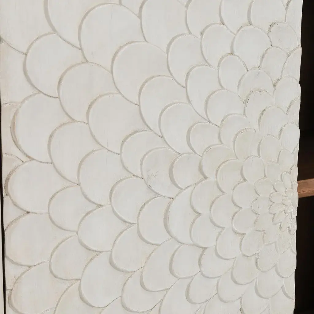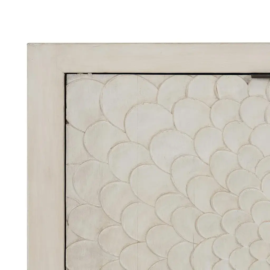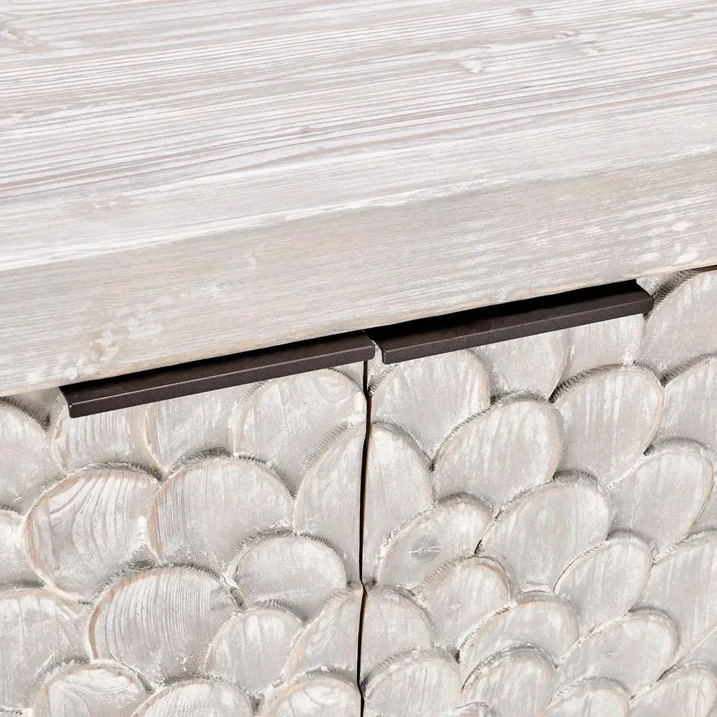 White washed finish reclaimed pine wood sideboard. Carved Delilah flower design pattern on four cabinet doors. Adjustable interior shelving and cutouts in back for wire management. Each sideboard will vary in exact finish/tones, grain, and inherent imperfections. Weight is approx. 175 lbs.