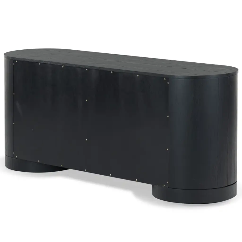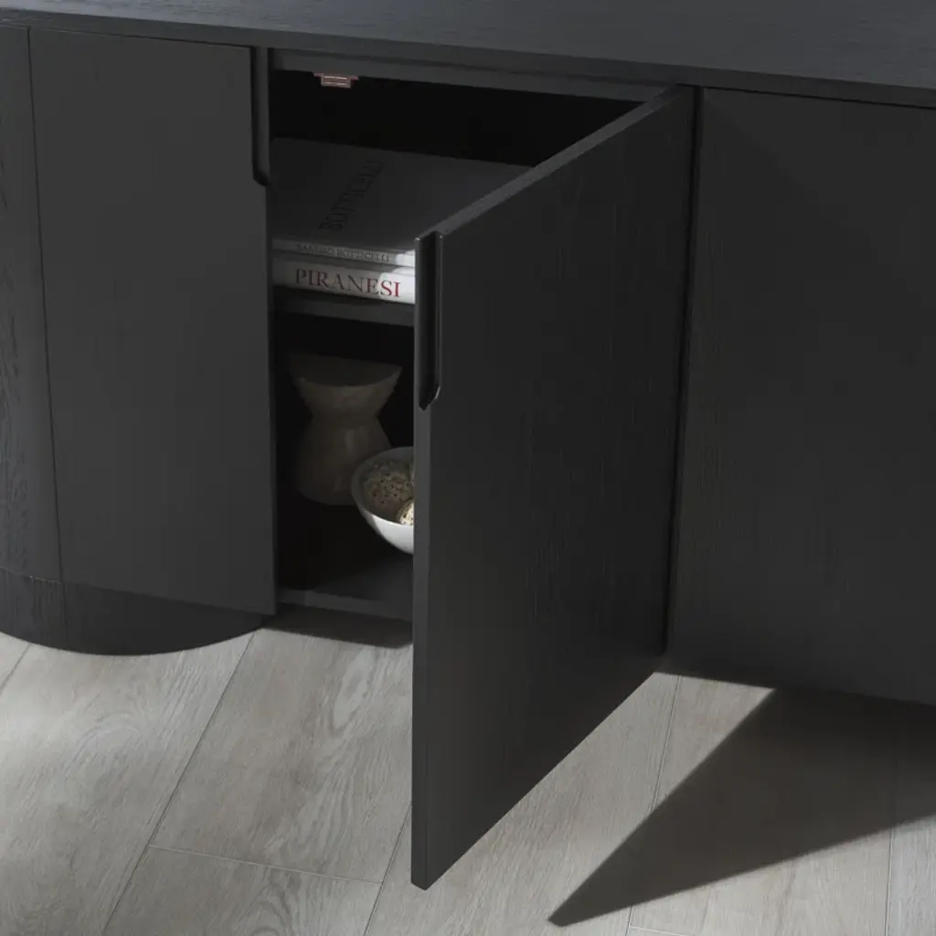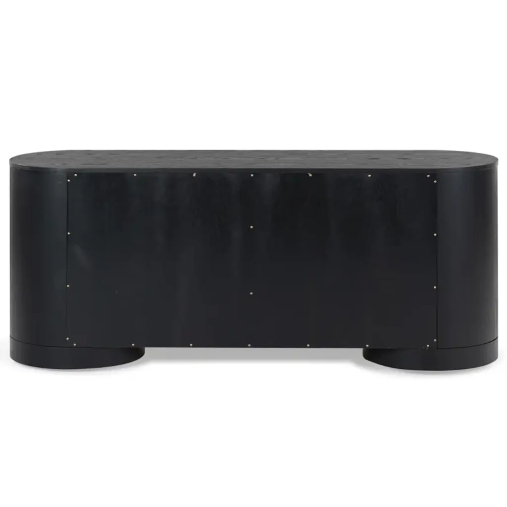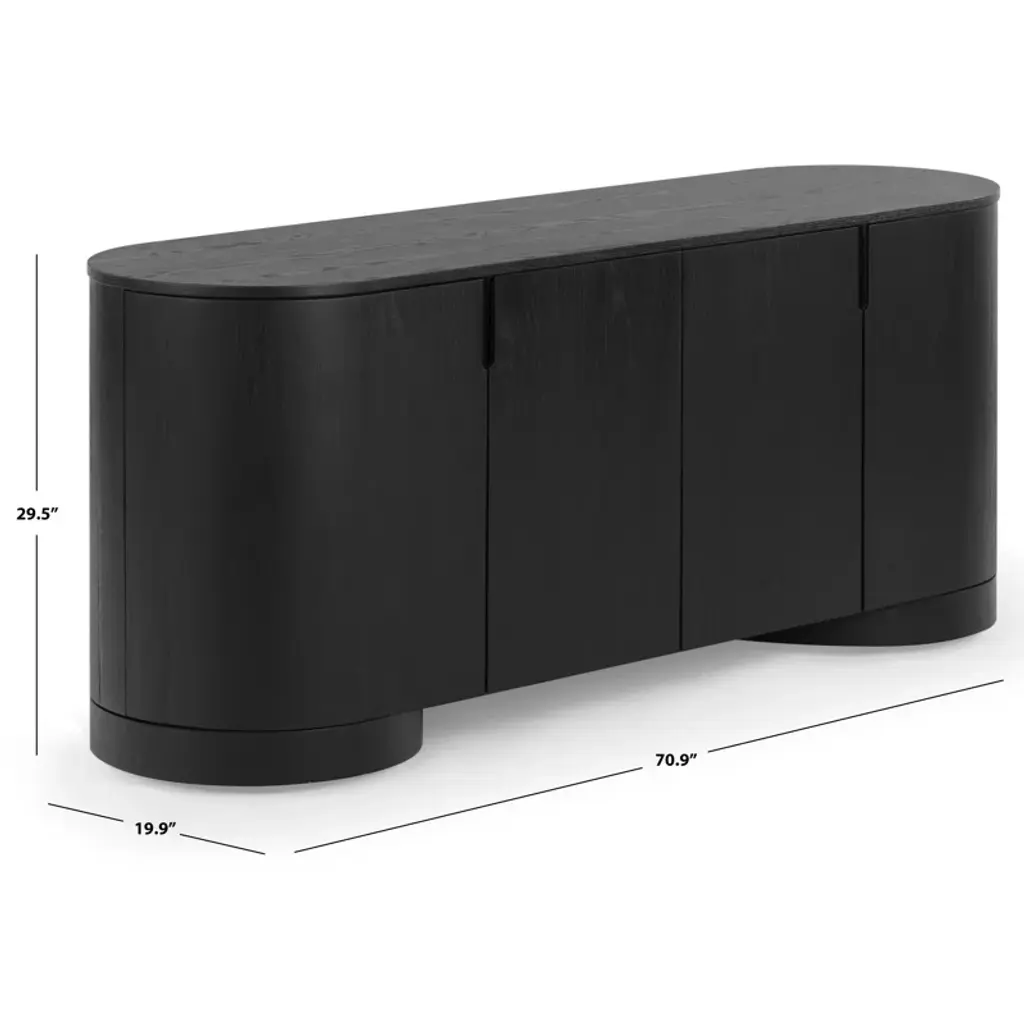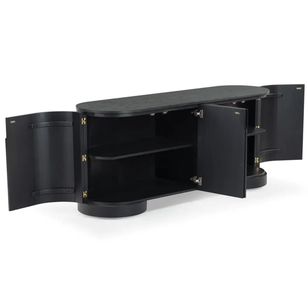 Level up your dining or living space with this streamlined sideboard. Crafted from wood, its distinctive oval silhouette adds understated visual interest. Four doors with minimalist cutout handles create a smooth front, while four shelves (two fixed, two adjustable) provide plenty of storage. The spacious surface is perfect for displaying décor, and the sturdy round disc feet complete the soft, curved design. An anti-tip kit is included for added stability.