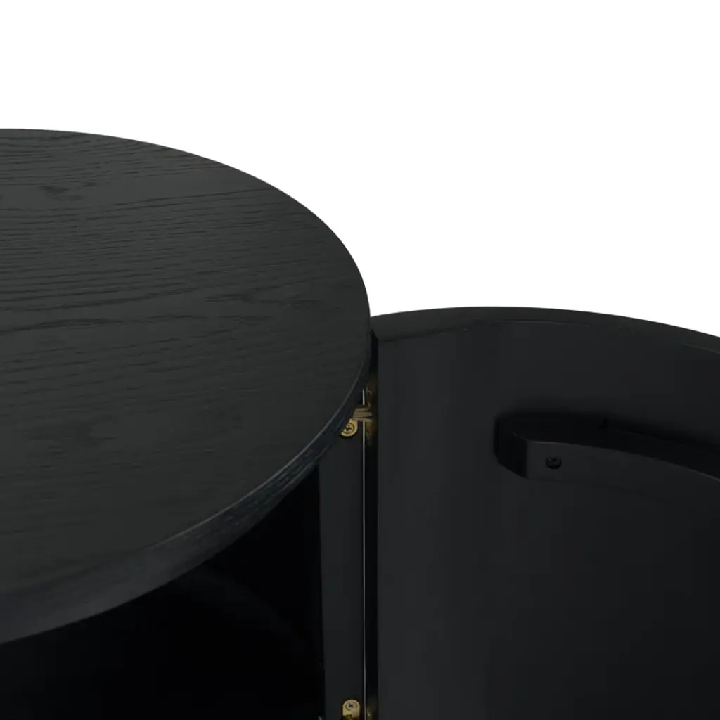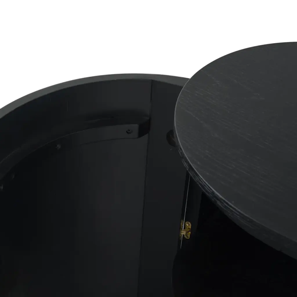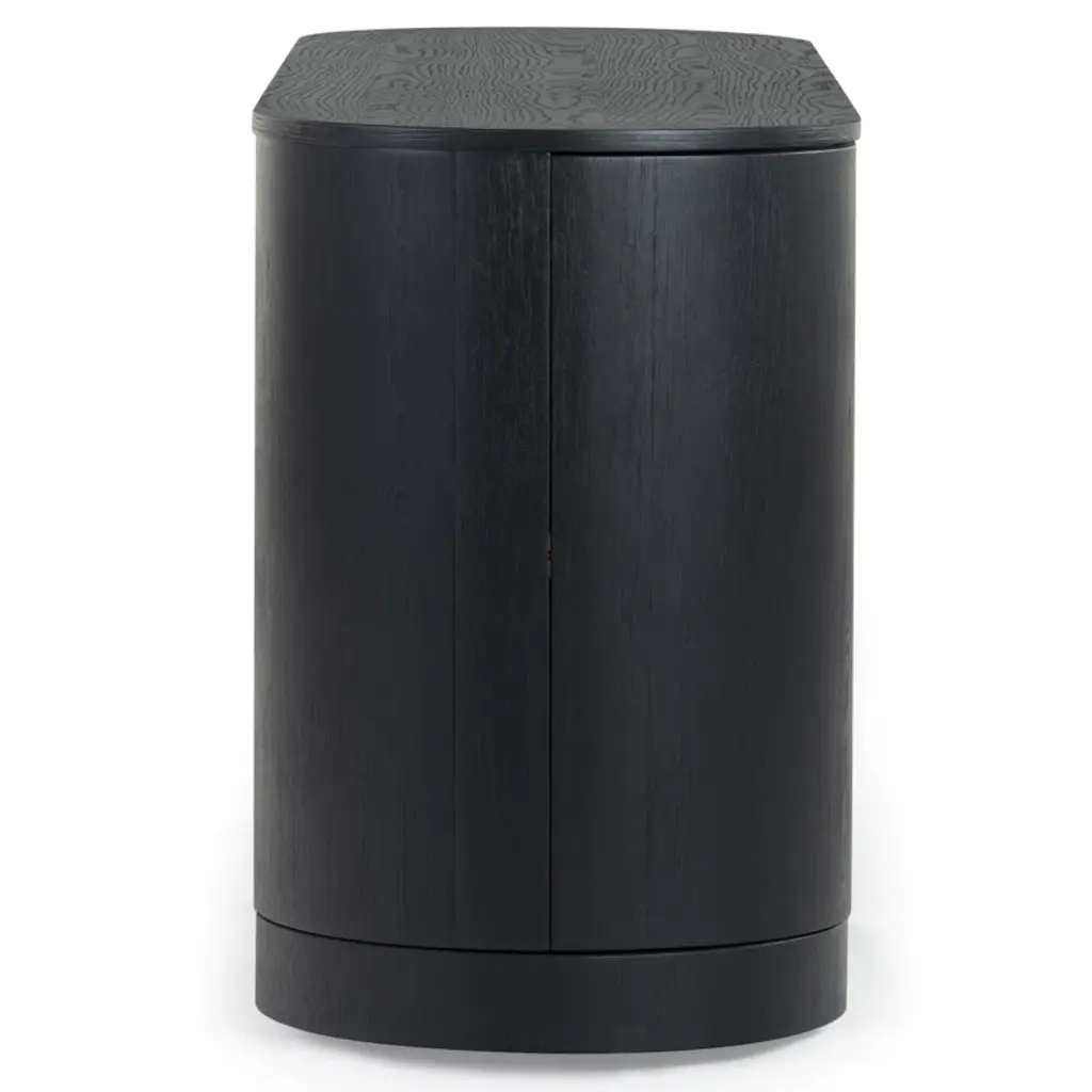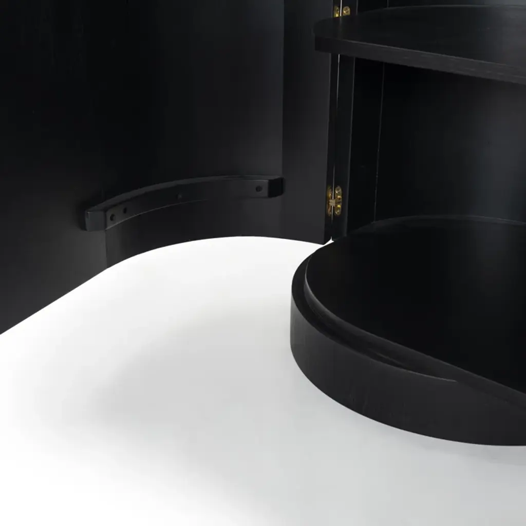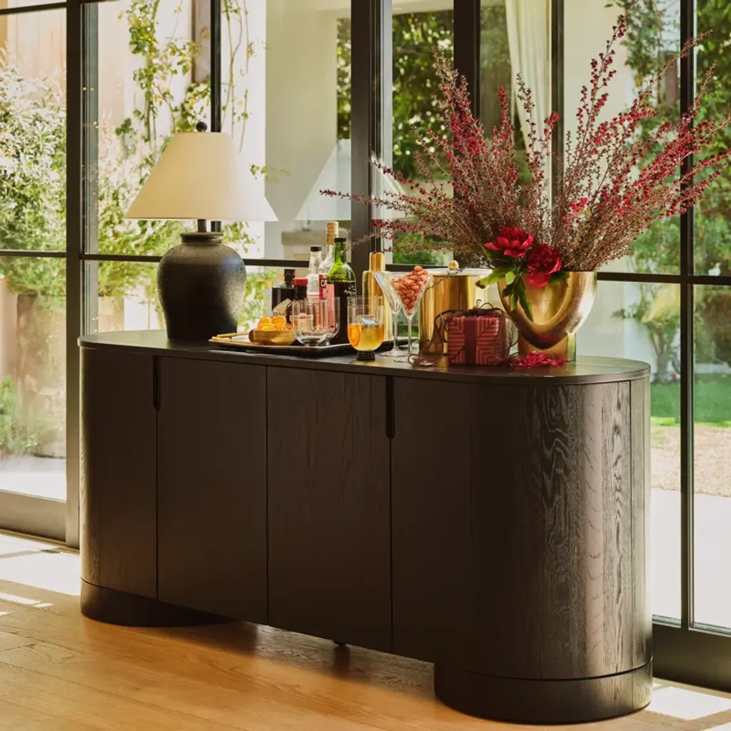 Level up your dining or living space with this streamlined sideboard. Crafted from wood, its distinctive oval silhouette adds understated visual interest. Four doors with minimalist cutout handles create a smooth front, while four shelves (two fixed, two adjustable) provide plenty of storage. The spacious surface is perfect for displaying décor, and the sturdy round disc feet complete the soft, curved design. An anti-tip kit is included for added stability.