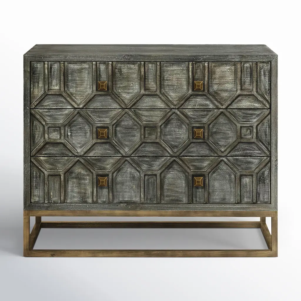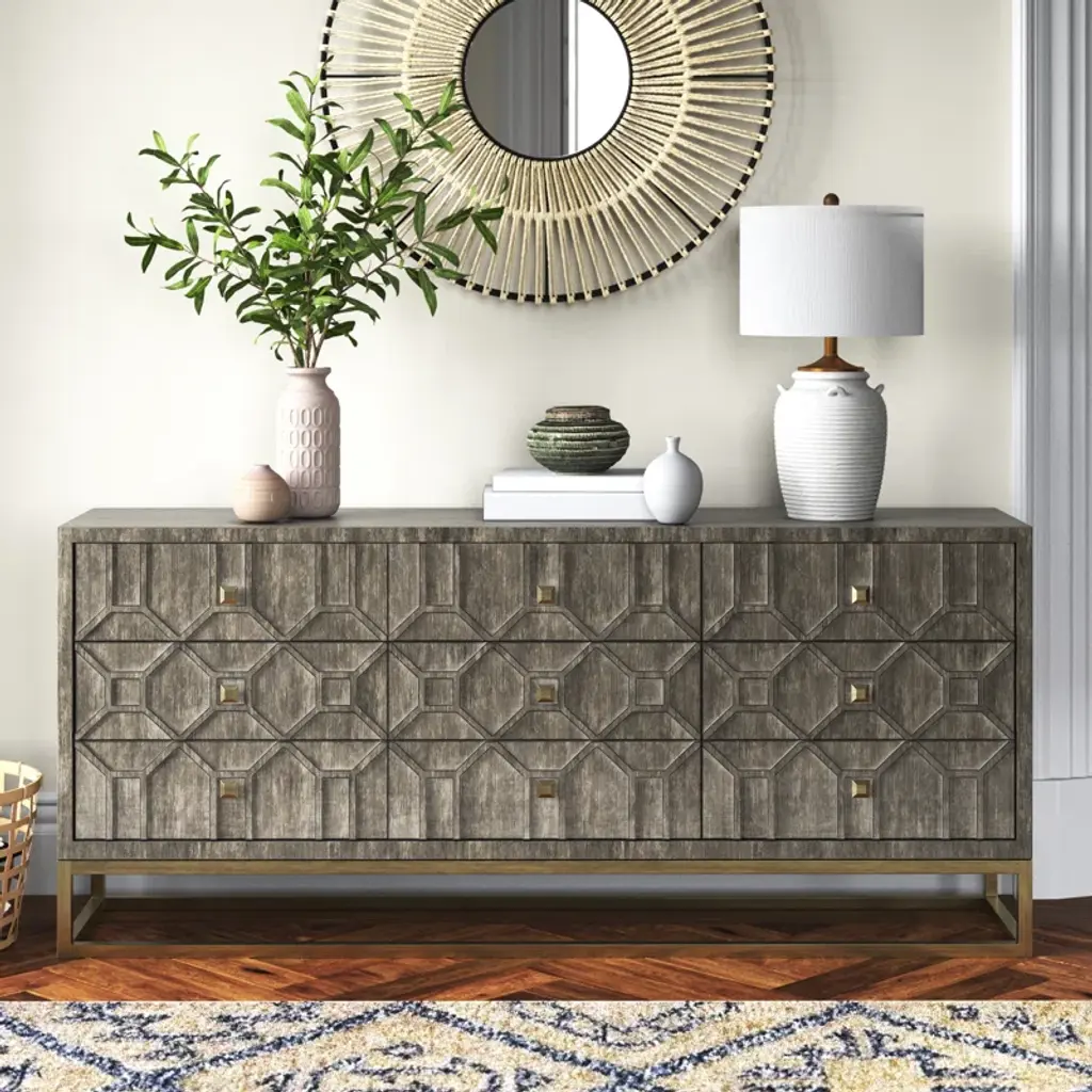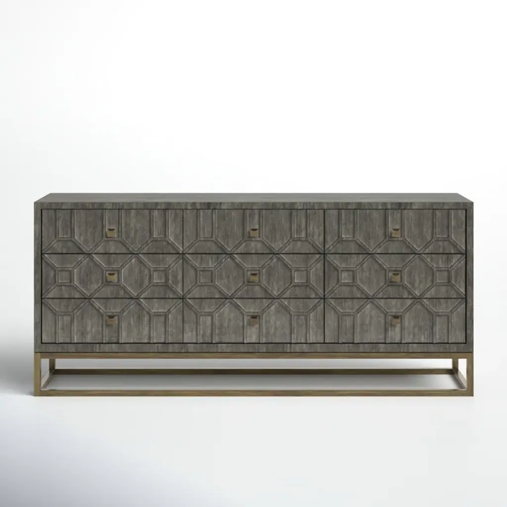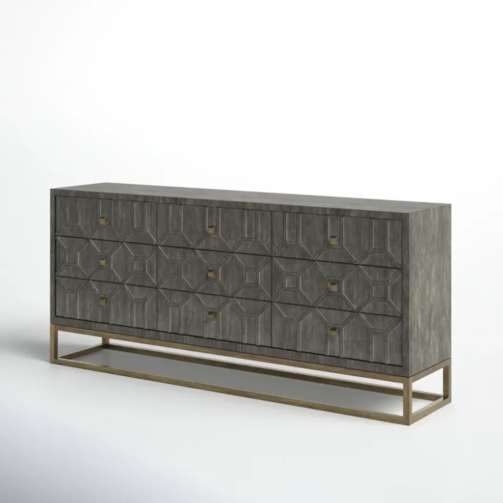 Subtle sophistication meets rustic appeal. Founded on a sleek metal base with matching hardware, our dresser boasts a distressed lattice overlay in your choice of color palette. Nine roomy drawers offer space for everything from classic tees to dining linens. Plus, the finished back means this piece looks great wherever you style it. Arrives fully assembled. Love this look? Shop the entire collection.