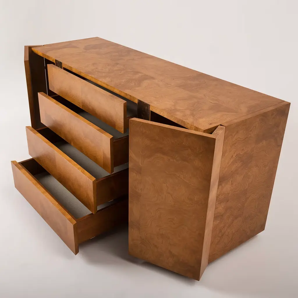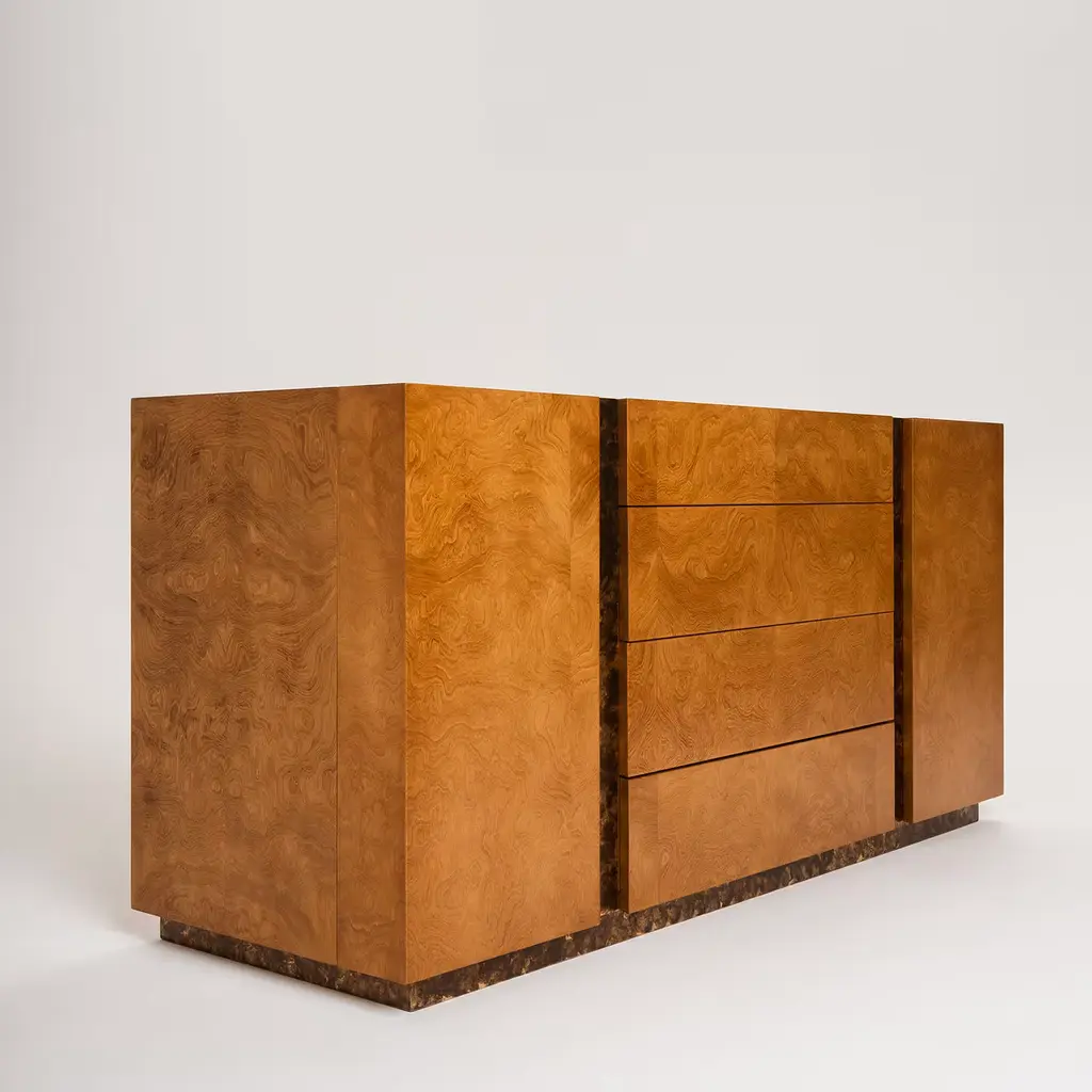 This luxurious buffet with myrtle briarwood veneer stained walnut is embellished with steel panels with an oxidized gold leaf finish. Exuding simple elegance, this piece features several practical drawers, each upholstered in canvas and equipped with soft close runners. With its sleek lines and streamlined silhouette, the Diadema Sideboard makes a versatile addition to a range of interior spaces.