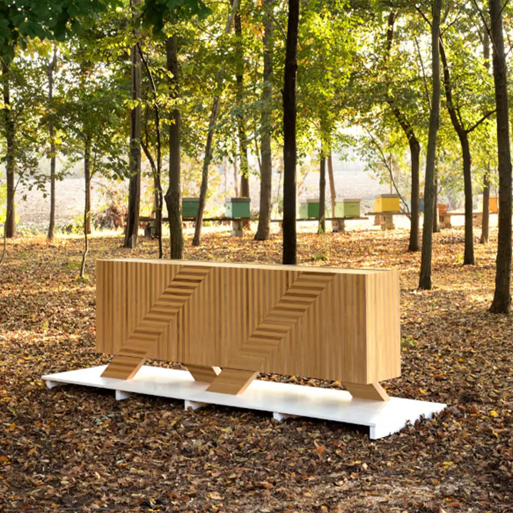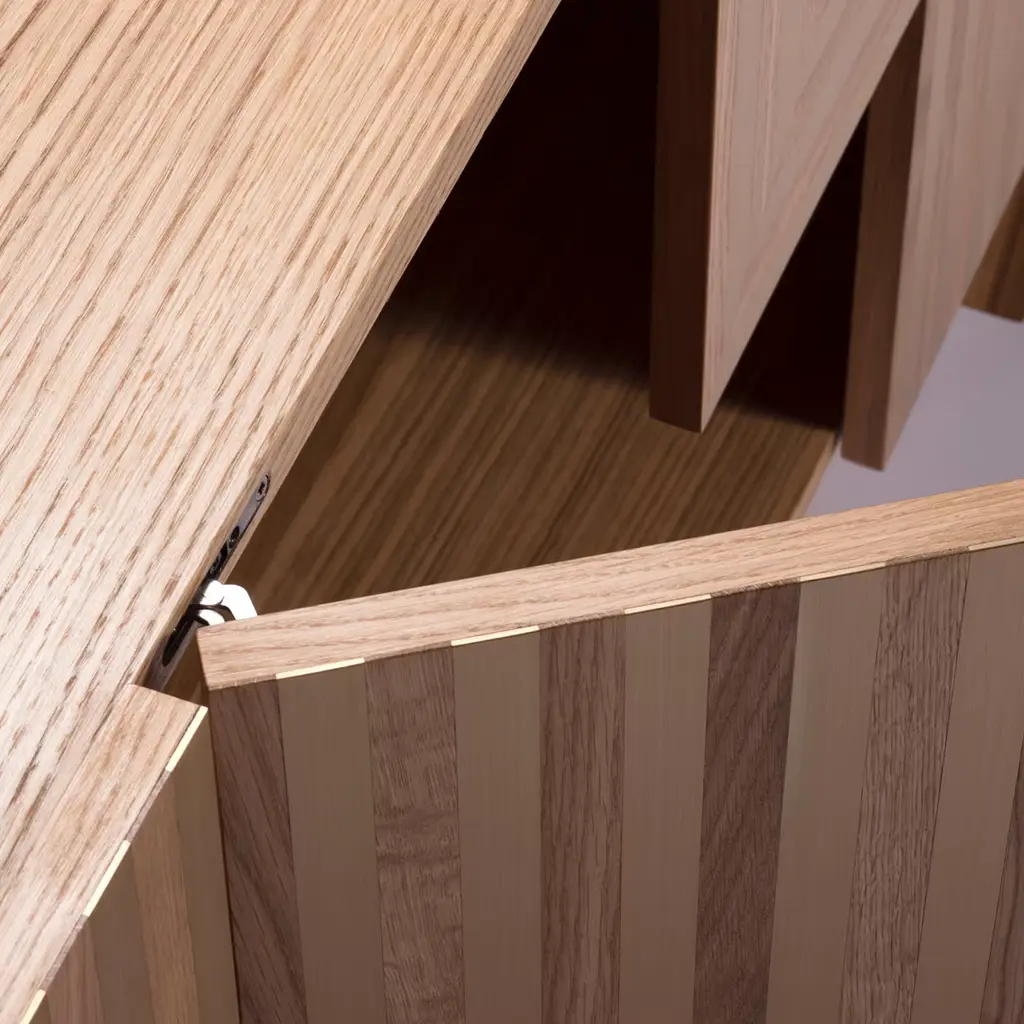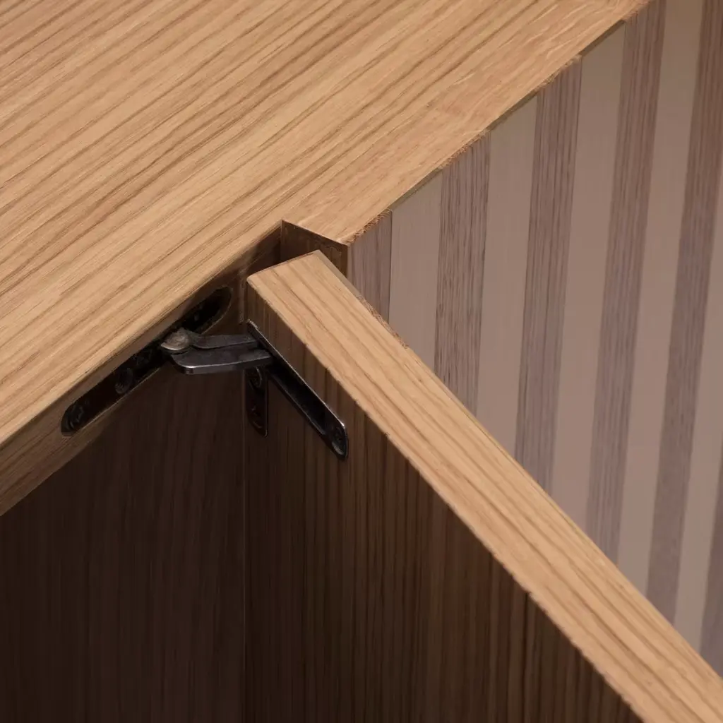 Inspired by the late 19th-century tradition of industrial archeology, this spectacular sideboard exudes an eclectic and elegant flair of timeless character. Reminiscent of Gustave Eiffel's renowned net-like structures, it combines classic allure with a dynamic and unconventional style. Handcrafted of veneered durmast and solid wood, it is enriched with decorative brass inserts and is internally equipped with an extra-clear glass shelf.