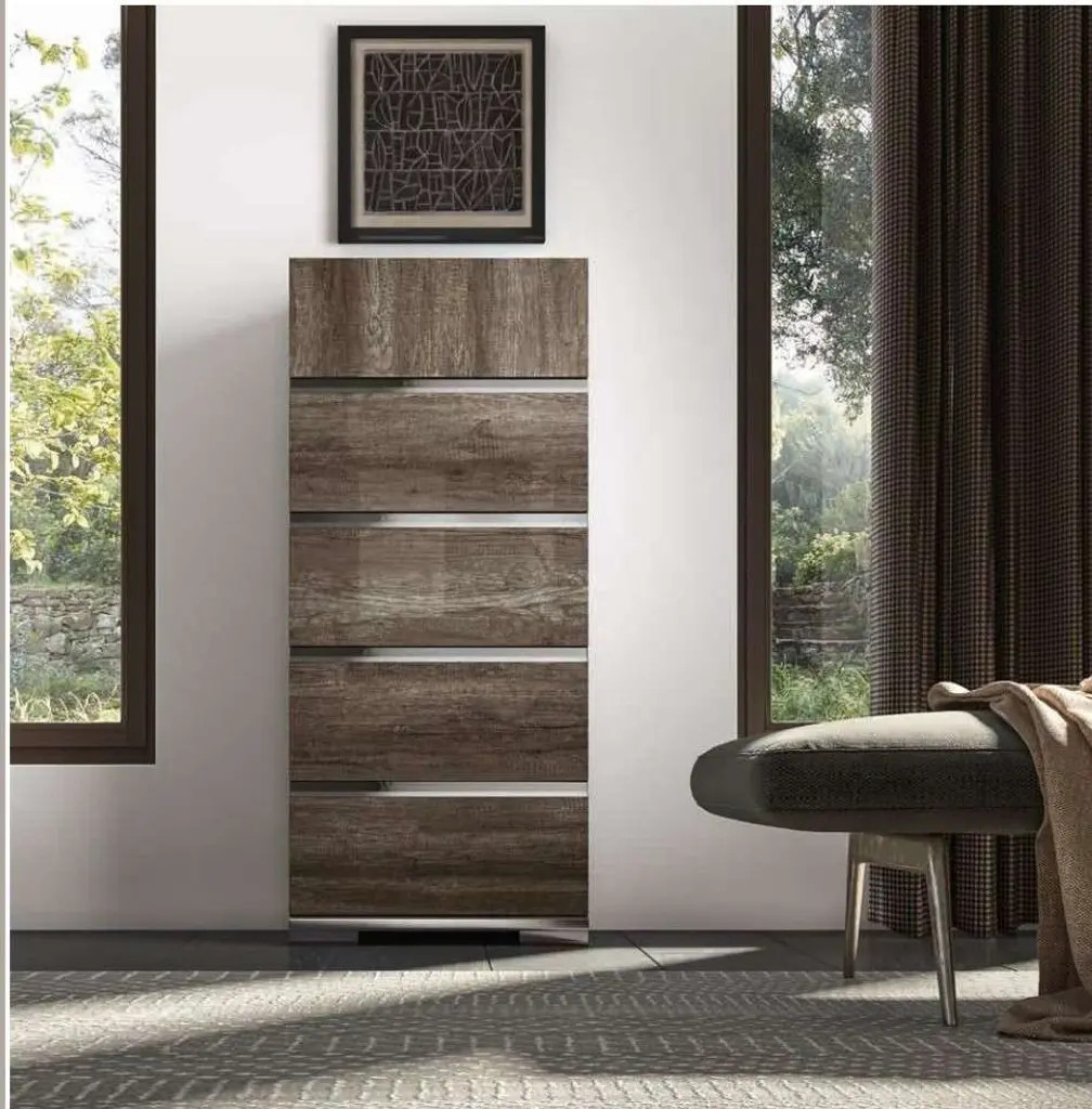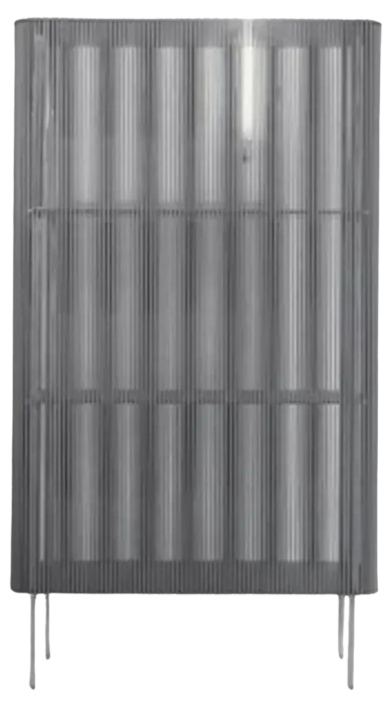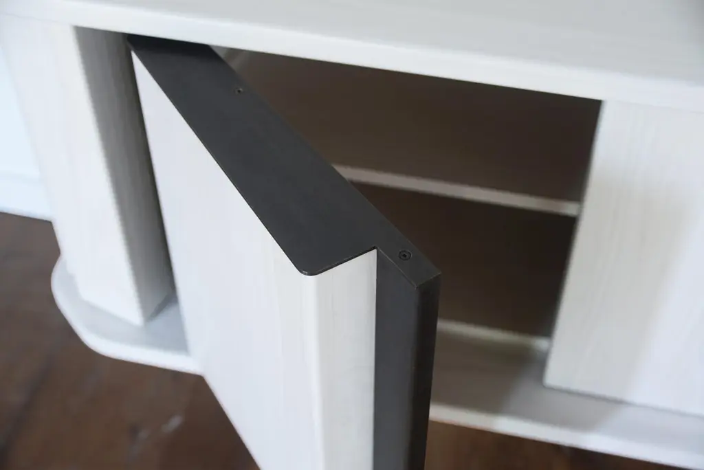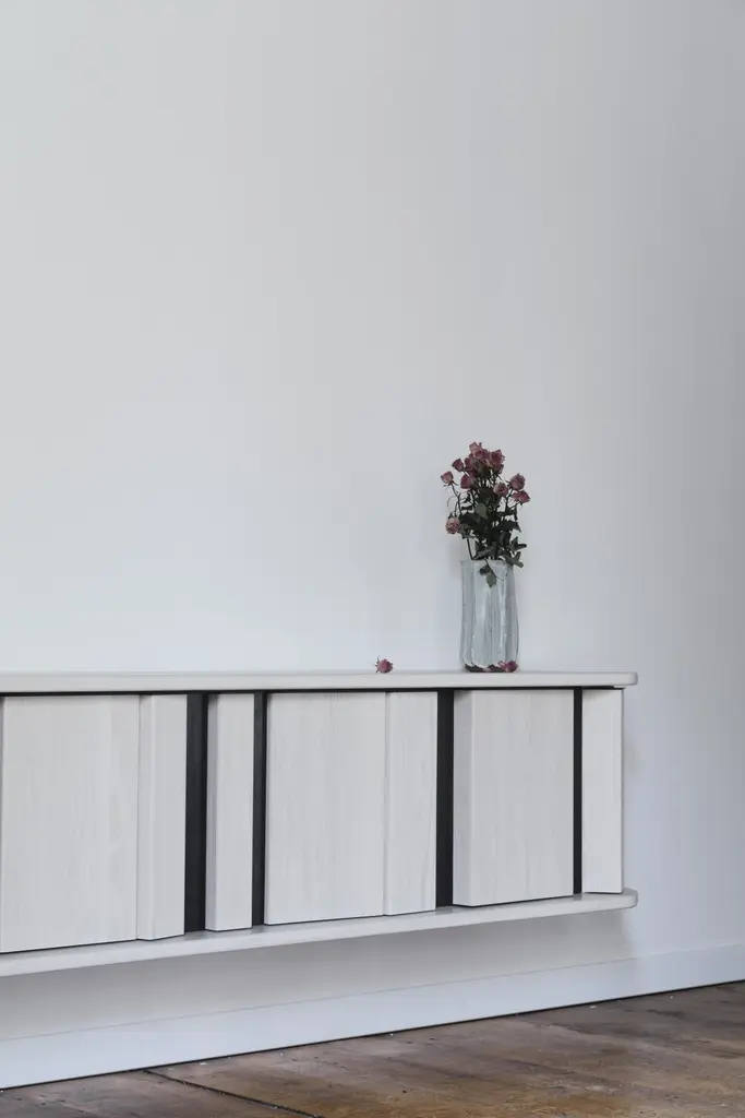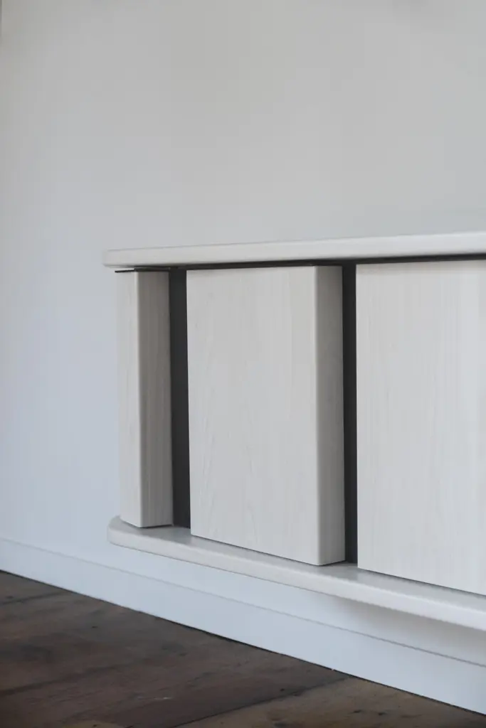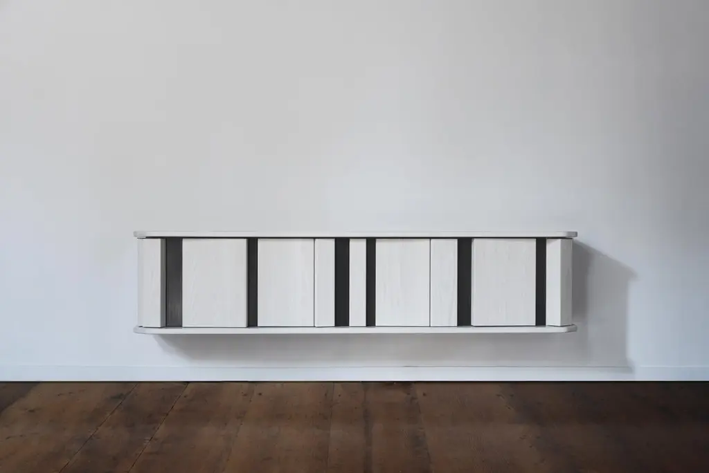 The diamond sideboard plays with different planes. A collection of rectangular columns placed at random angles and depths forms a facade interrupted by two thick horizontal planes of solid wood. This array of volumes serves as doors to a fully functional cabinet, with adjustable shelves. The visual cues associated with doors, regularity in size, handles or hinges, are absent, making this sideboard about volume and presence. Shown here in bone white ash and antique bronze accents, the piece is also available in blackened or grey ash, white oak and with hand-polished aluminum accents. Other sizes available: 46", 62", 98" and custom sizes.