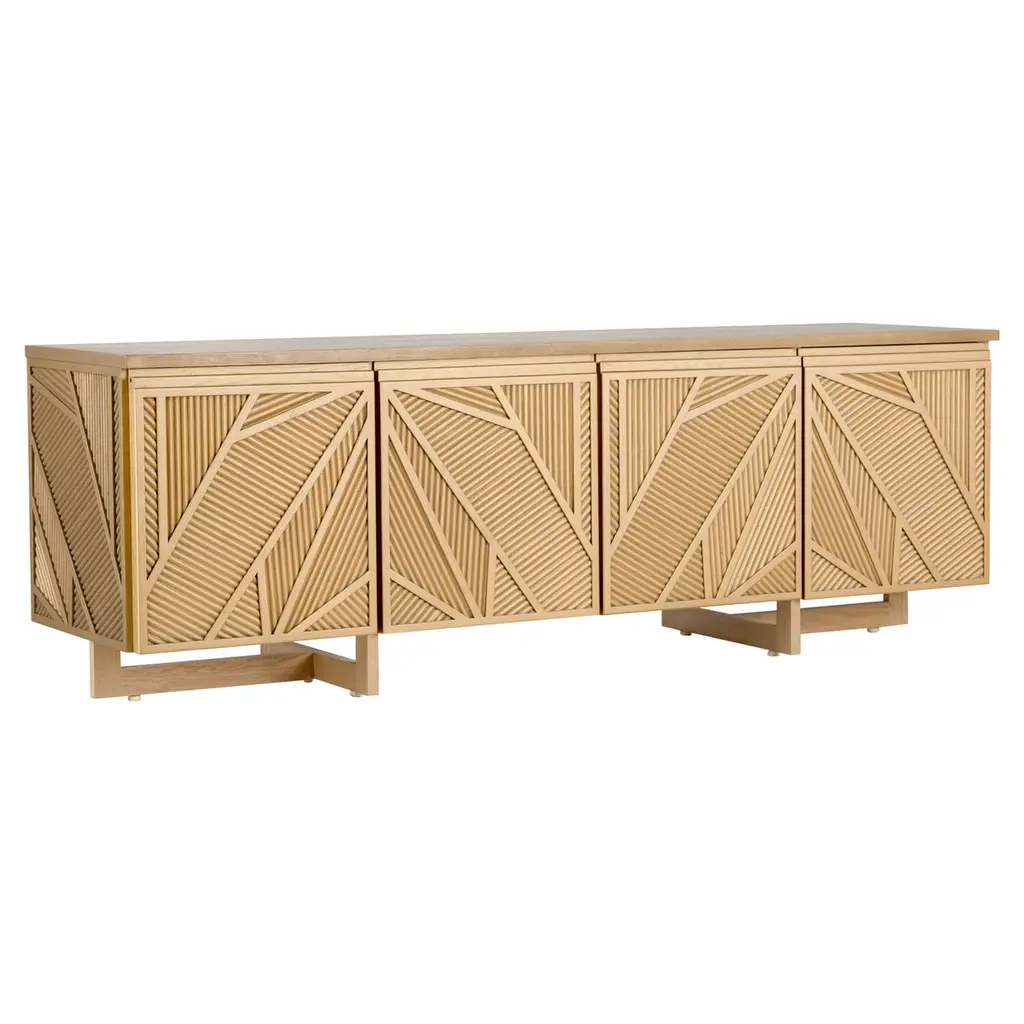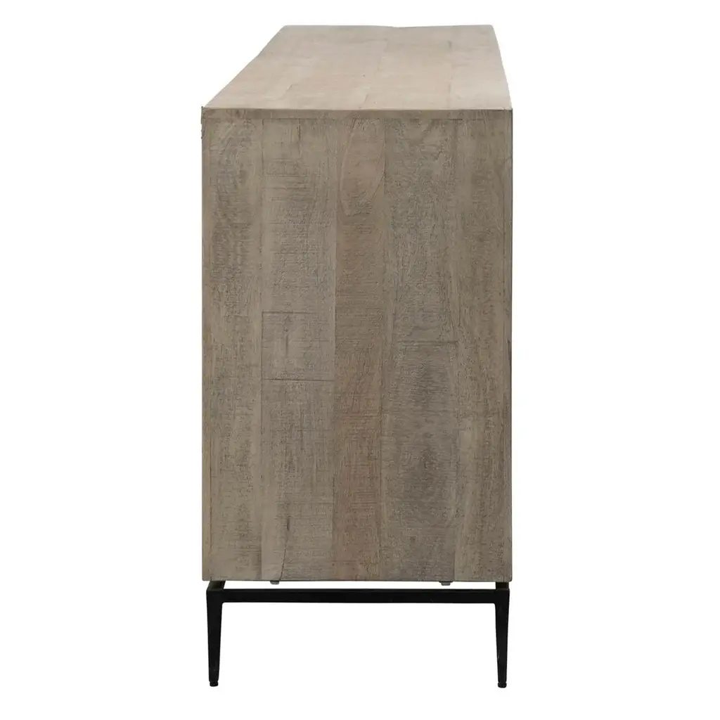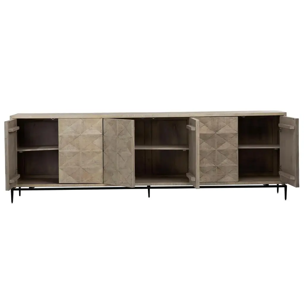 Long mango wood sideboard with light warm washed finish. This cabinet features a carved subtle diamond pattern on six doors. Set on sturdy black iron legs. Each may vary in coloring, wood grain, and natural imperfections. Weighs approx. 250 lbs.