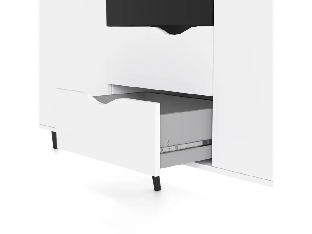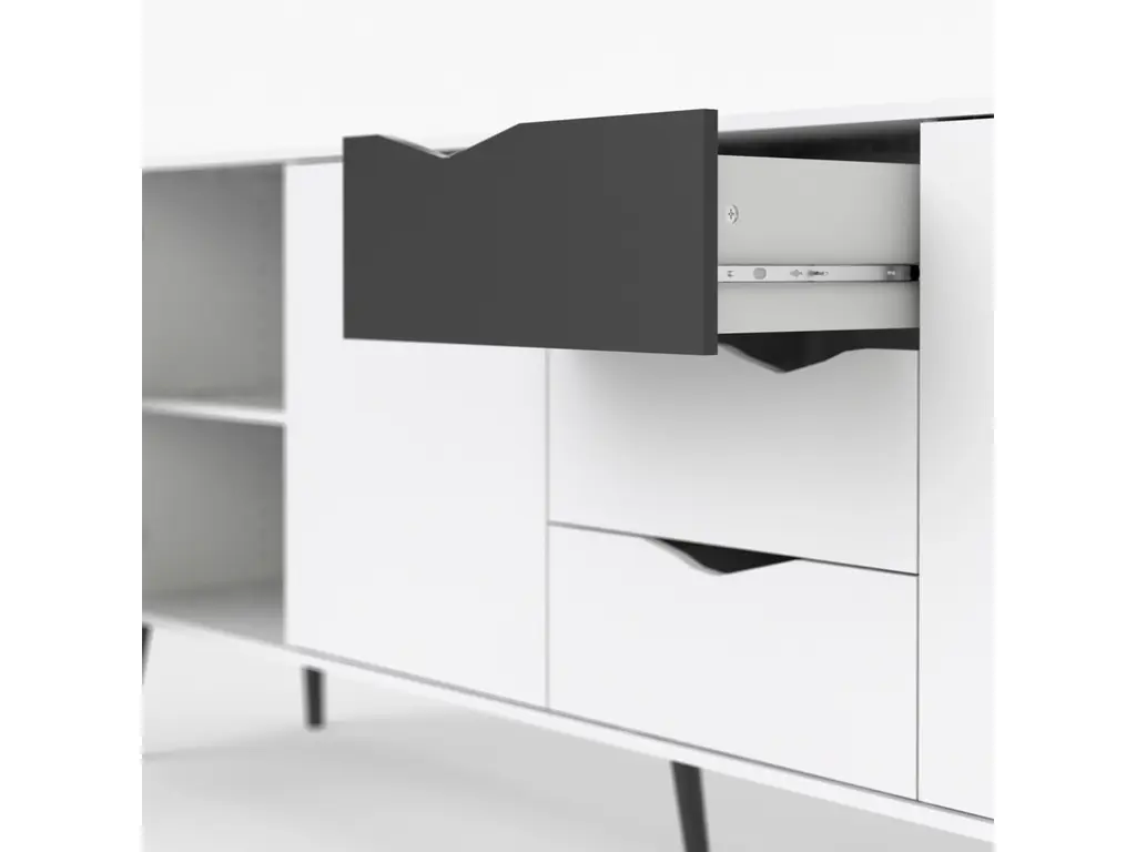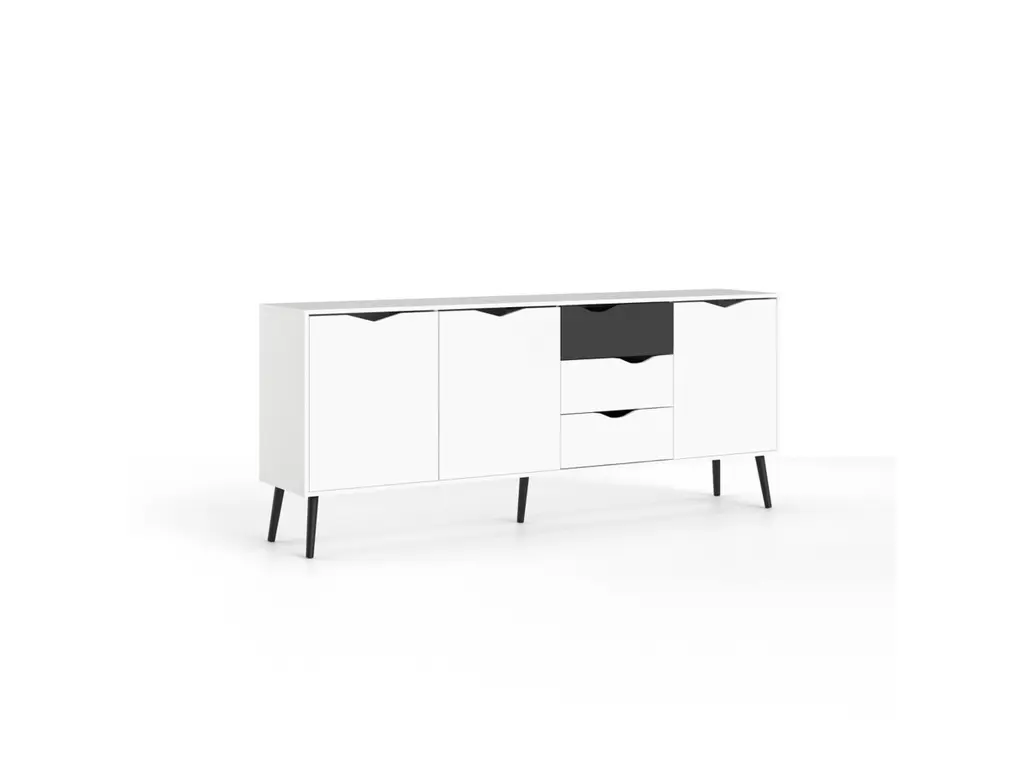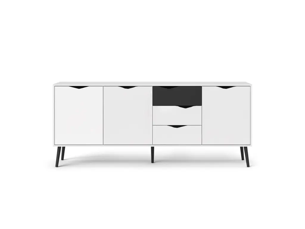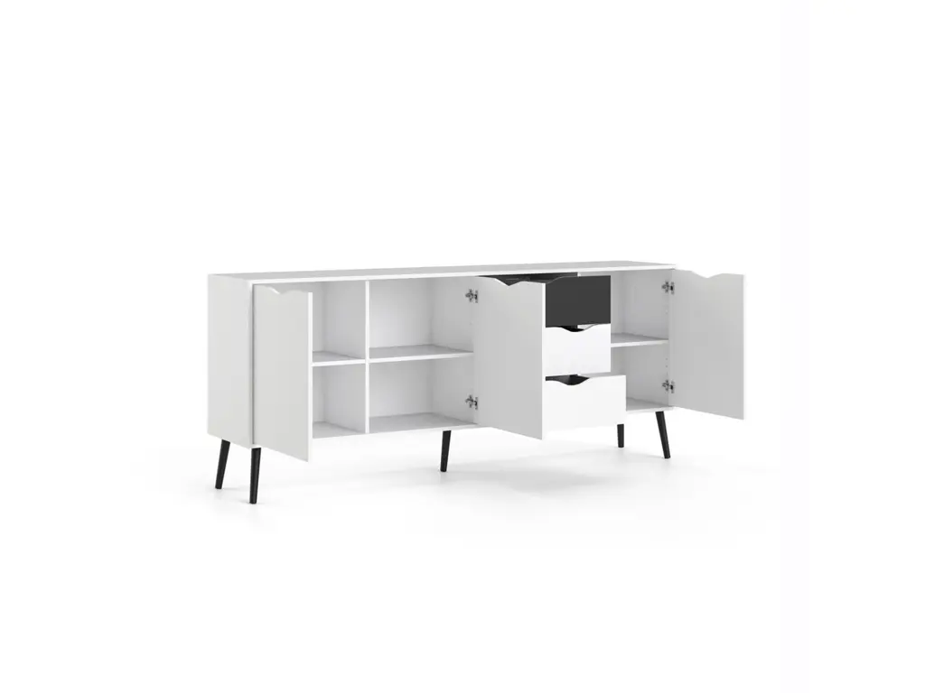 Alluding a retro-modern charm, this sideboard features three drawers and three doors with grooved cutout handles. Ideal for any living space that needs storage, the piece has ample room without being short on style. The chic two-tone color combination of a crisp white finish and black accents perfects this fresh interpretation of mid-century design.