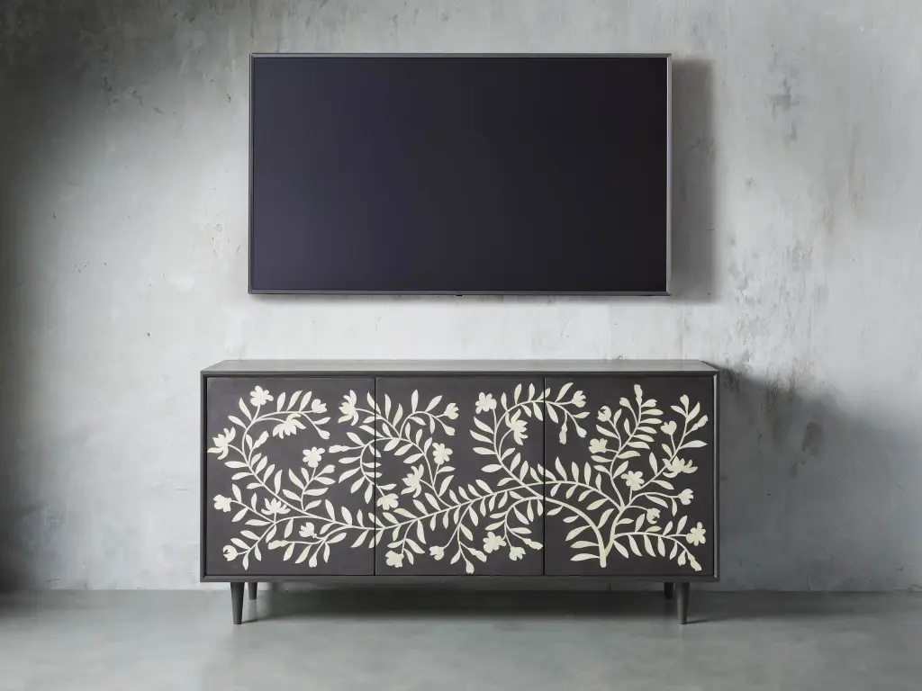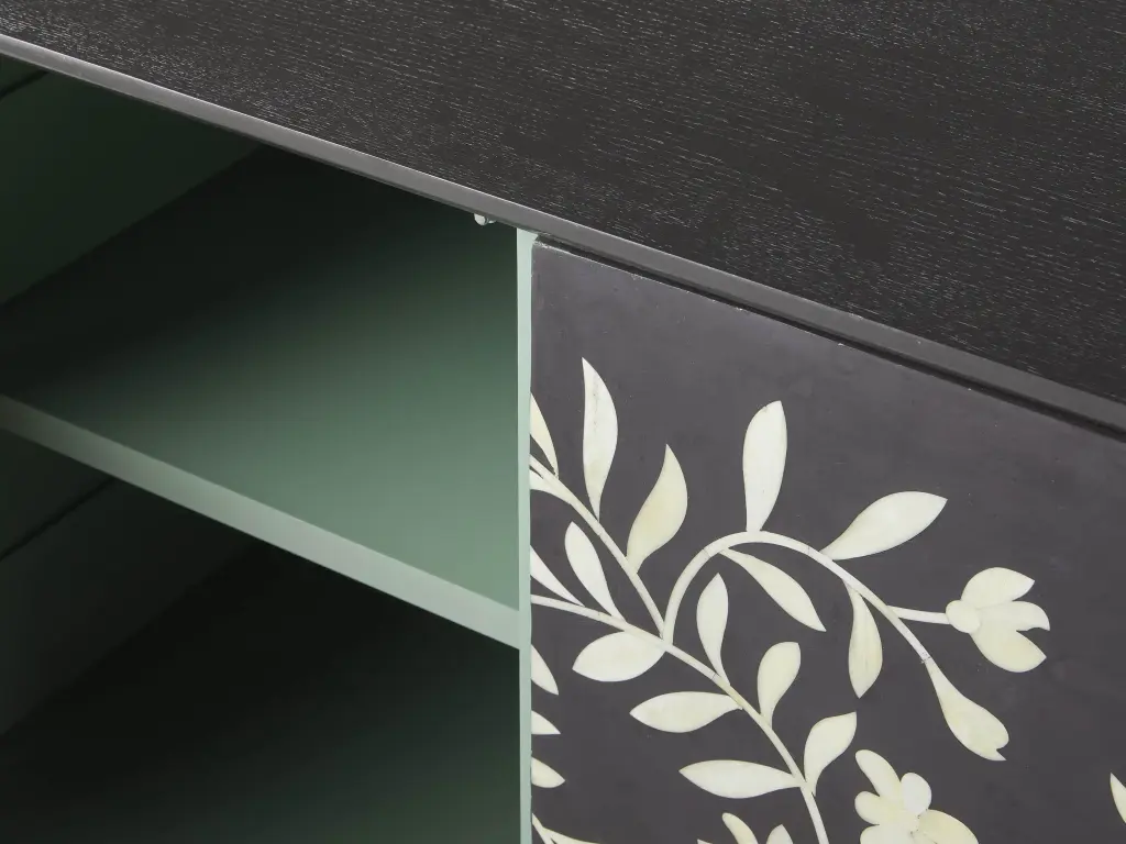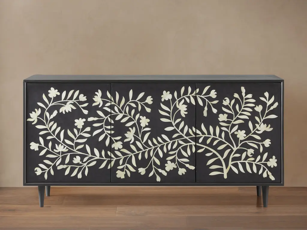 Over two years in the making, in collaboration with artisans in the remote city of Udaipur, India, our Divya sideboard is inspired by traditional designs and authentic artistry passed down from generation to generation. These modern, handcrafted case pieces feature mosaic floral motifs—hand-drawn by our designer—reminiscent of the naturally elegant jasmine found growing amongst the palaces and lakes of Udaipur. Each cabinet door takes ten days to complete, as artisans select and shape each bone by hand. As our artisans are non-violent and strict vegetarians, our bone is humanely sourced from naturally deceased water buffalo that roam the streets and countryside of India.