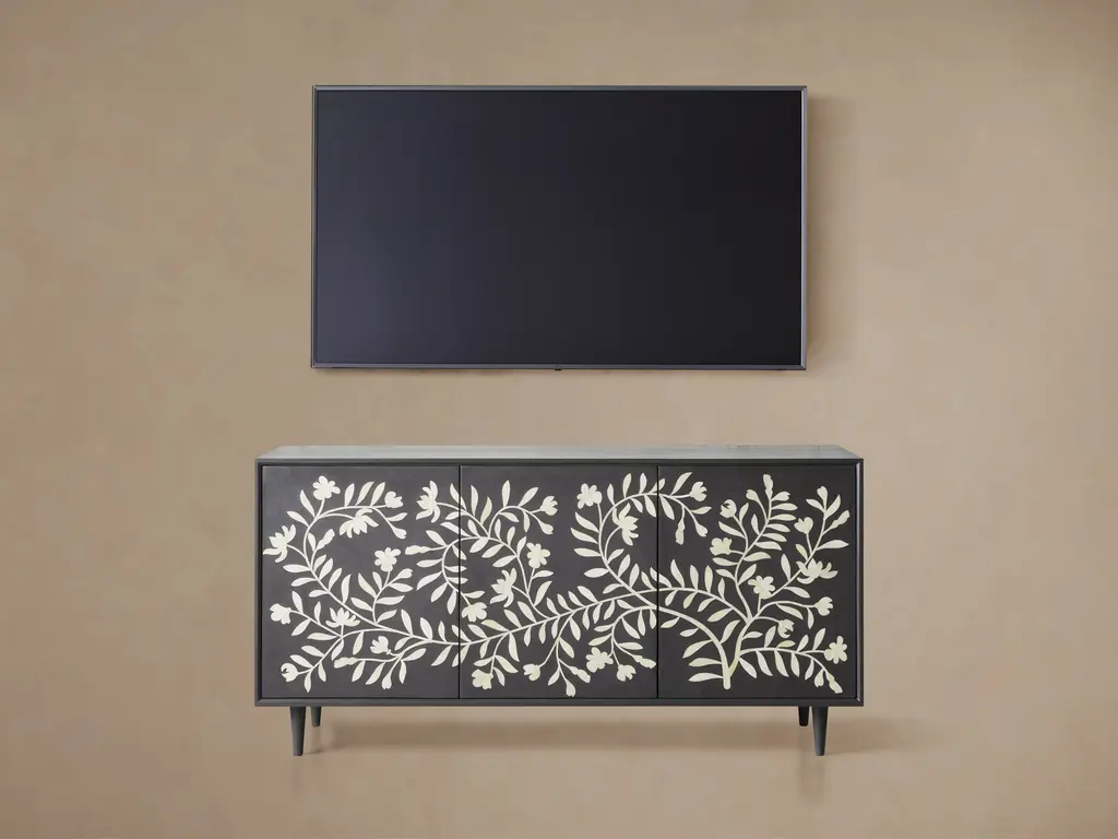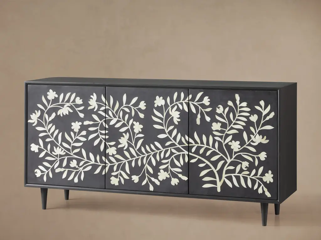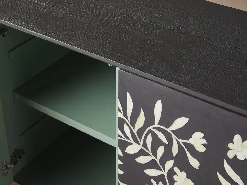Over two years in the making, in collaboration with artisans in the remote city of Udaipur, India, our Divya sideboard is inspired by traditional designs and authentic artistry passed down from generation to generation. These modern, handcrafted case pieces feature mosaic floral motifs—hand-drawn by our designer—reminiscent of the naturally elegant jasmine found growing amongst the palaces and lakes of Udaipur. Each cabinet door takes ten days to complete, as artisans select and shape each bone by hand. As our artisans are non-violent and strict vegetarians, our bone is humanely sourced from naturally deceased water buffalo that roam the streets and countryside of India.