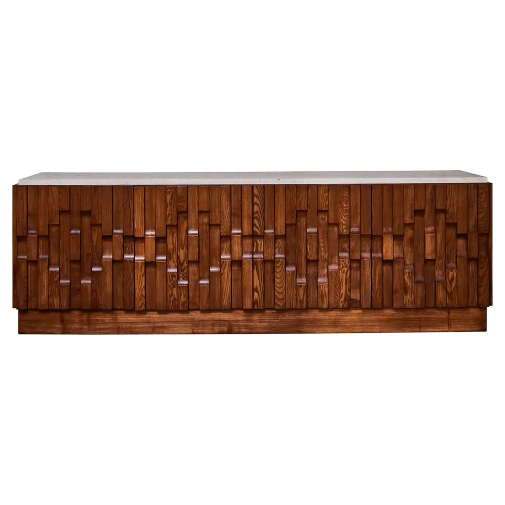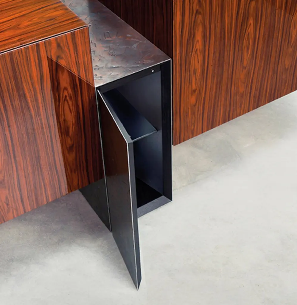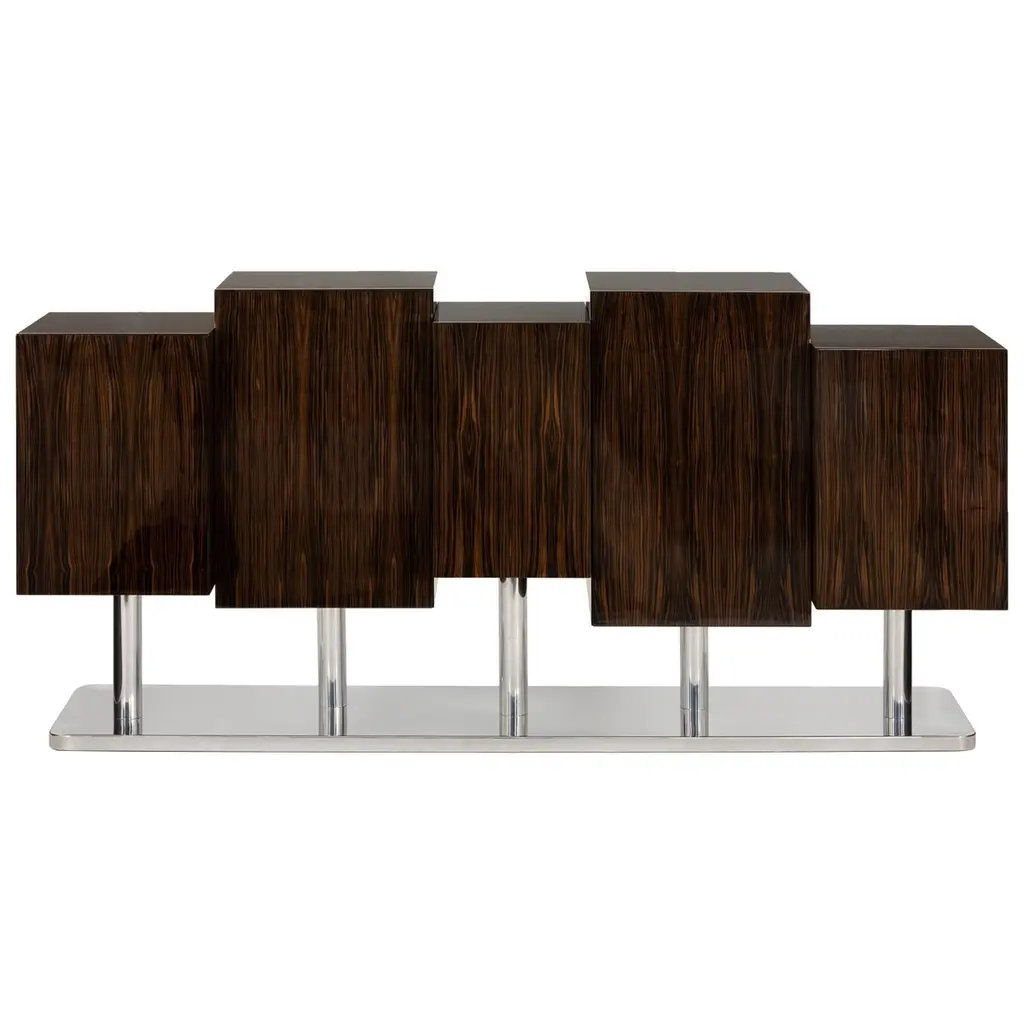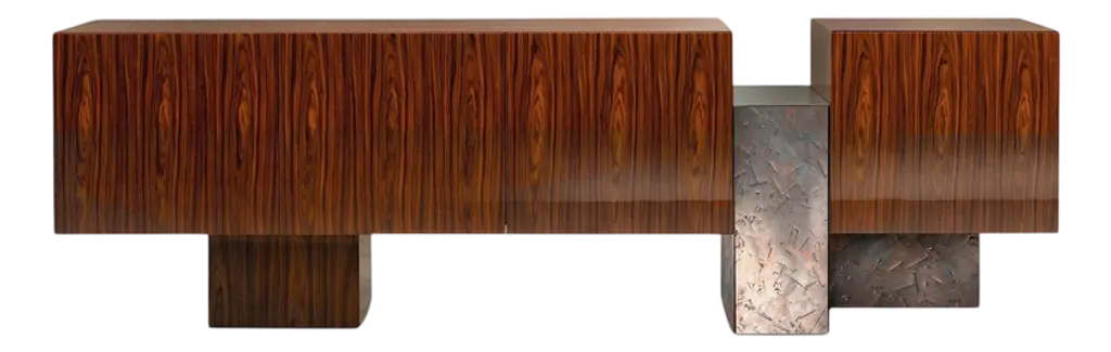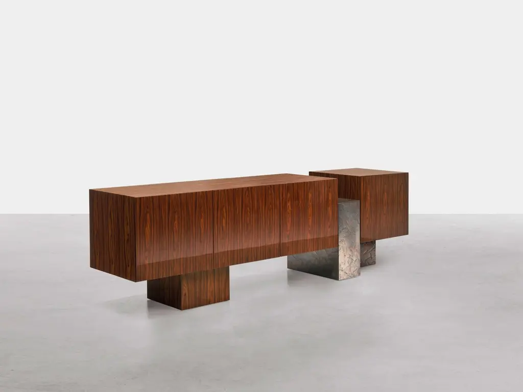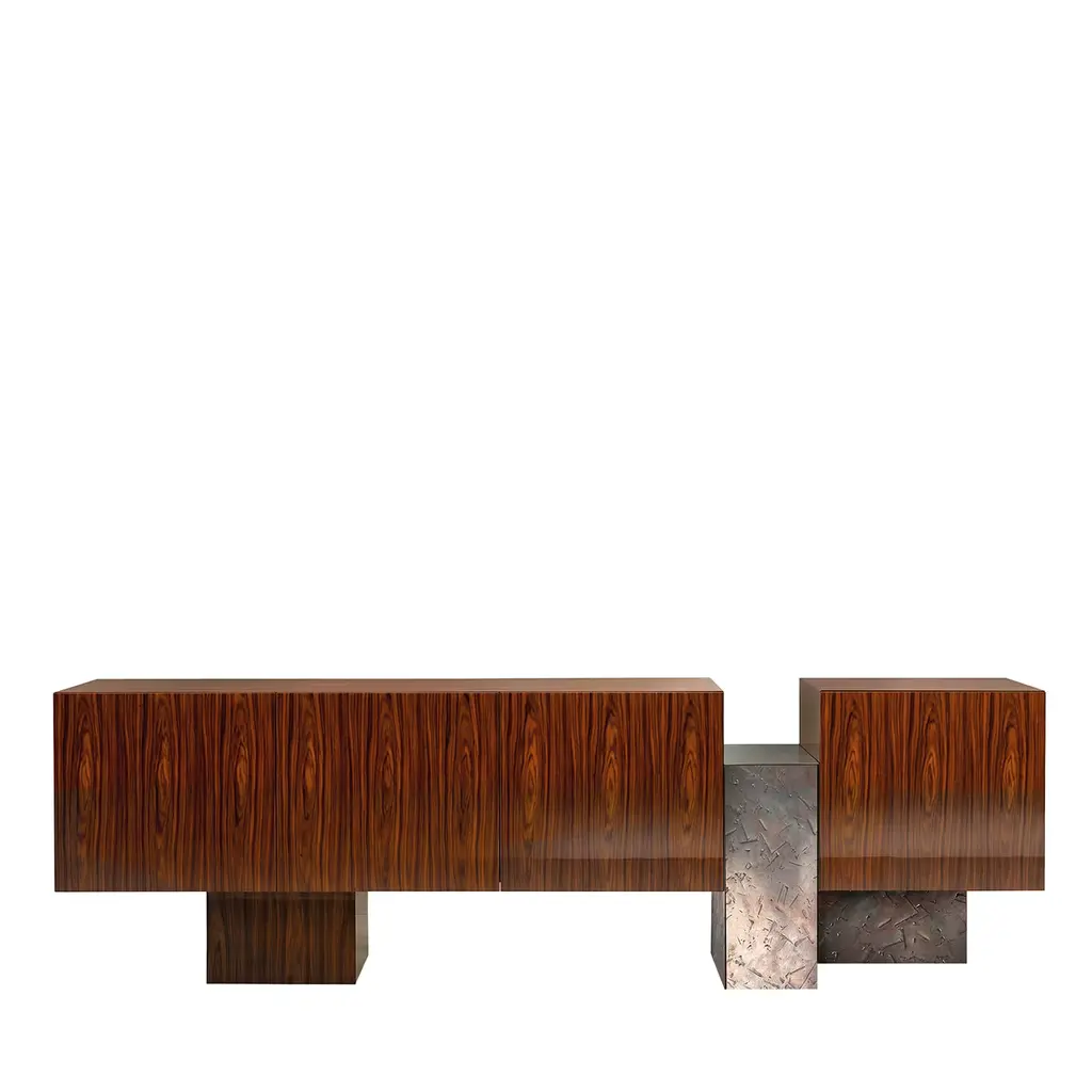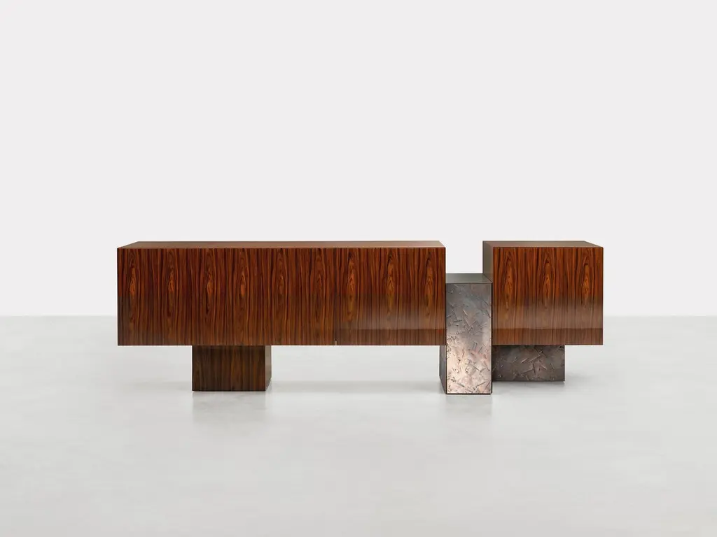 Dolmen Sideboard by SomaschiniDimensions: W 234 x D 50 x H 71 cmMaterials: Plywood structure and doors with workmanship at 45 degrees. Doors with push-pull system opening. Internal compartments with three bronze glass shelves. S27 Black Ash wooden venner in matt finish.Sideboard in N.14 Palissandro Santos veneer high gloss and N.130 Copper-burnished copper-zinc pure metal finishAbout: Somaschini is a new-born brand, with a strong, innovative attitude, and rich artisan heritage in 1940s Brianza — a hard-working region of Lombardy, internationally renowned for the production of high quality design. It thrives, however, on new ideas and contemporaneity and never lapses into nostalgia but rather masters its own high craft. It shows a certain obstinacy in pursuing techniques honed over decades, preferring to make them speak through new languages. Hence it challenges tradition with a bold, intelligent, and confident approach.