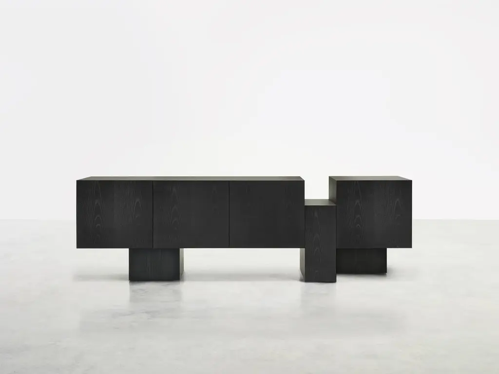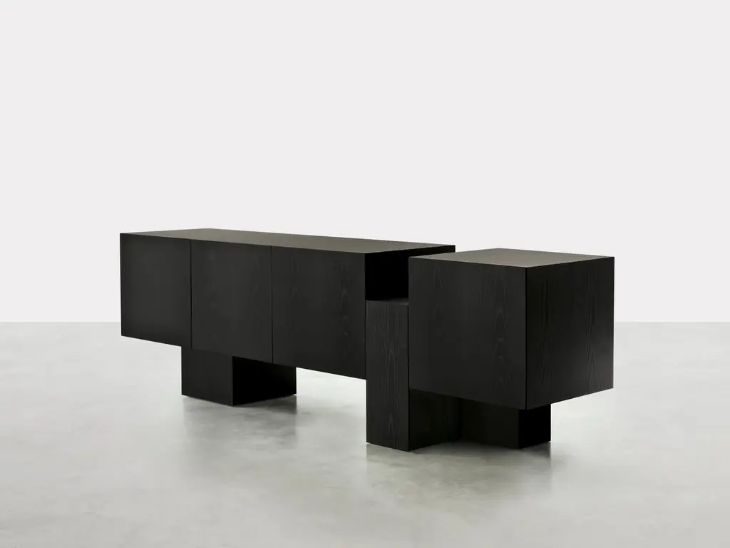 Dolmen Sideboard by SomaschiniDimensions: W 234 x D 50 x H 71 cmMaterials: Plywood structure and doors with workmanship at 45 degrees. Doors with push-pull system opening. Internal compartments with three bronze glass shelves. S27 Black Ash wooden venner in matt finish.Sideboard in N.100 Black Ash veneer matt finishAbout: Somaschini is a new-born brand, with a strong, innovative attitude, and rich artisan heritage in 1940s Brianza — a hard-working region of Lombardy, internationally renowned for the production of high quality design. It thrives, however, on new ideas and contemporaneity and never lapses into nostalgia but rather masters its own high craft. It shows a certain obstinacy in pursuing techniques honed over decades, preferring to make them speak through new languages. Hence it challenges tradition with a bold, intelligent, and confident approach.