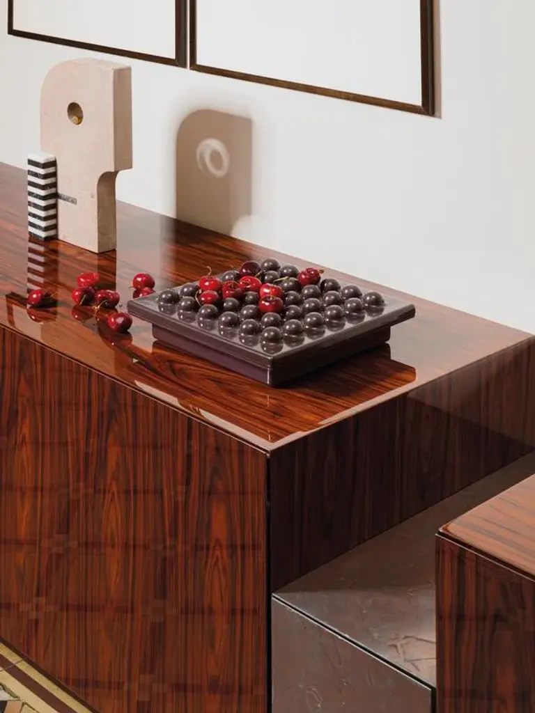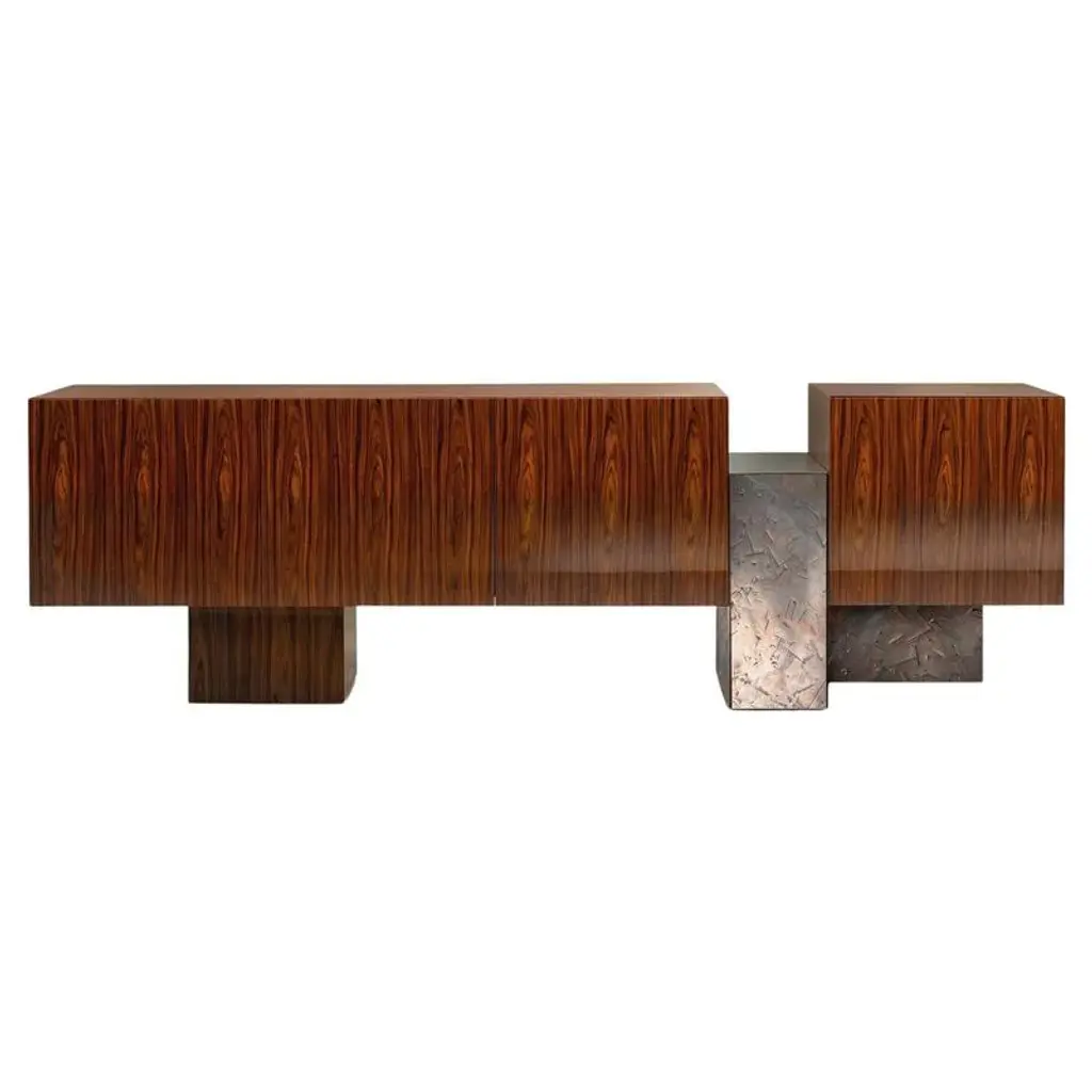 Dolmen sideboard by somaschini dimensions: w 234 x d 50 x h 71 cm materials: plywood structure and doors with workmanship at 45 degrees. Doors with push-pull system opening. Internal compartments with three bronze glass shelves. S27 black ash wooden venner in matt finish. Sideboard in n.14 palissandro santos veneer high gloss and n.130 copper-burnished copper-zinc pure metal finish