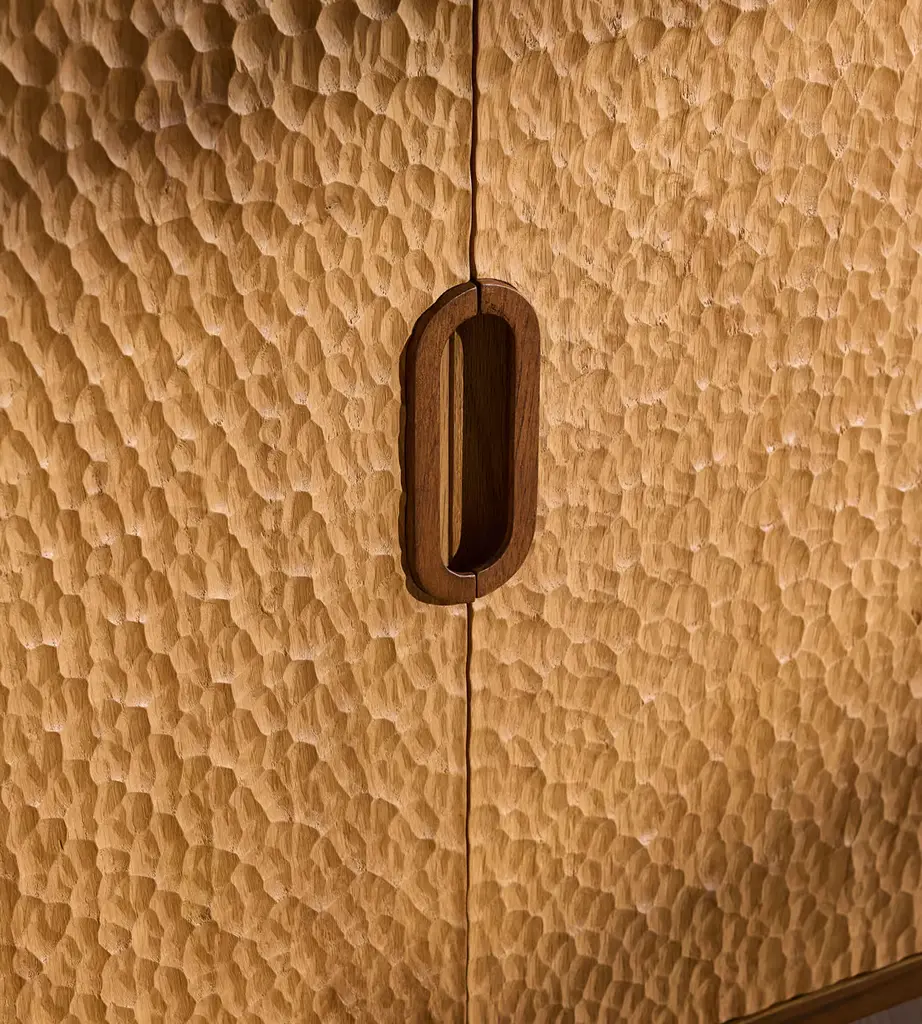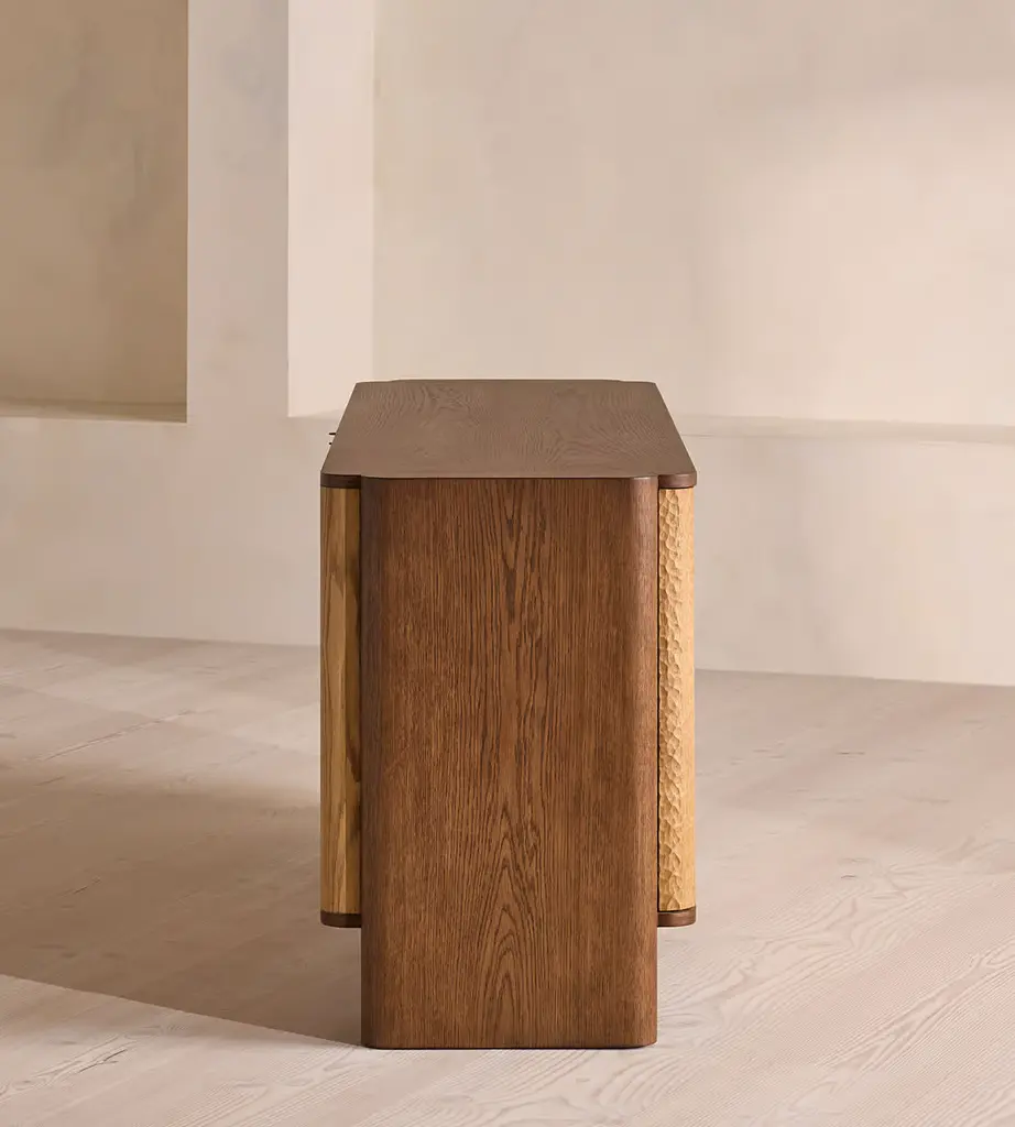 Two sets of double doors feature a natural oak finish with a chiselled texture, offset by dark oak accents. Taking inspiration from Soho Beach House Canouan, the Donato sideboard showcases four natural-tone oak doors, fitted with adjustable shelves and a chiselled exterior. Its curved silhouette is complemented by a dark oak top, full-length legs and inset handles.