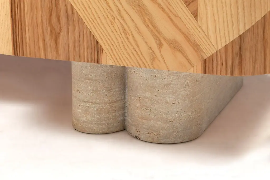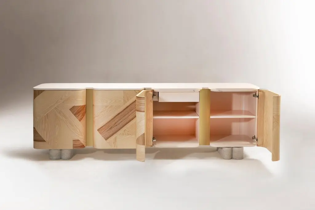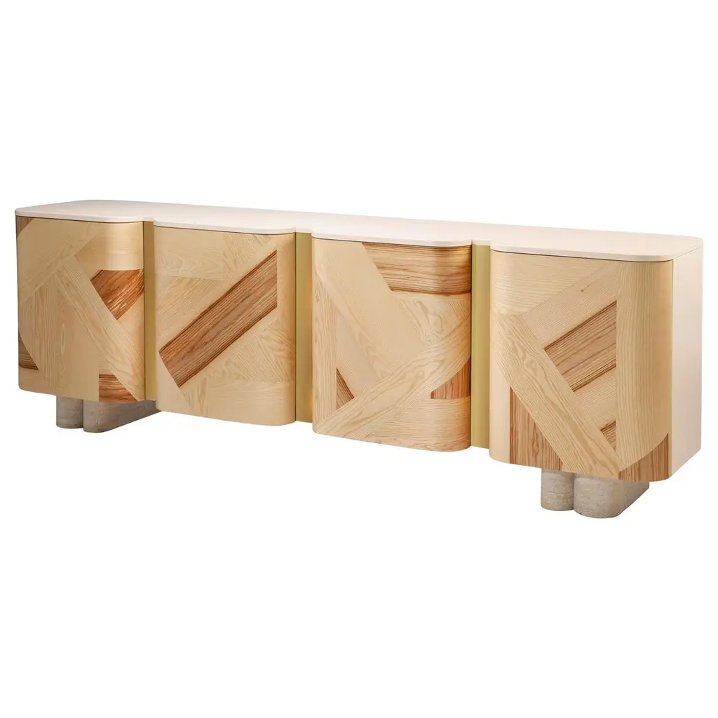 Embodying a meeting point of western and eastern aesthetics, Kisho Sideboard combines a rich mix of refined artistic techniques, organic shapes, natural colors and textures showing evidence of the visually inspiring movement of Japanese Modernism, that is very much present in this piece and sets the tone to its raw but sophisticated design. Made to order. Finishes: Olive Ash Wood Marquetry, Satin Nickel Details & Marble FeetFor sales with delivery address within European territories, VAT will be charged additionally to the stated price.